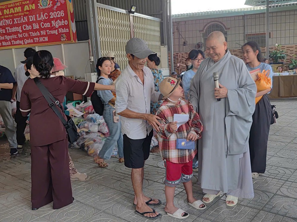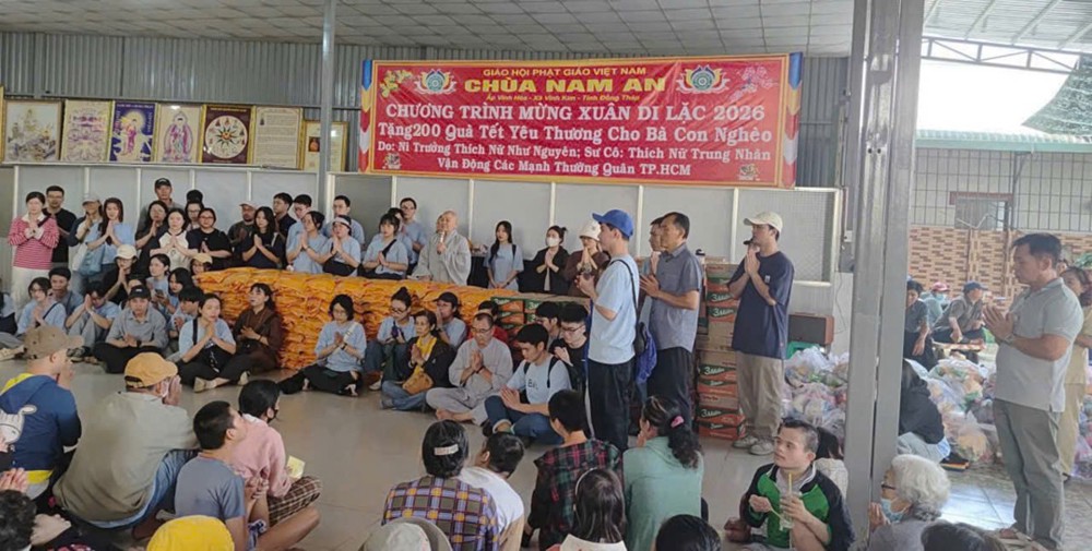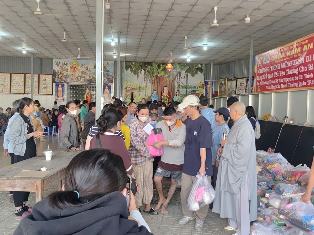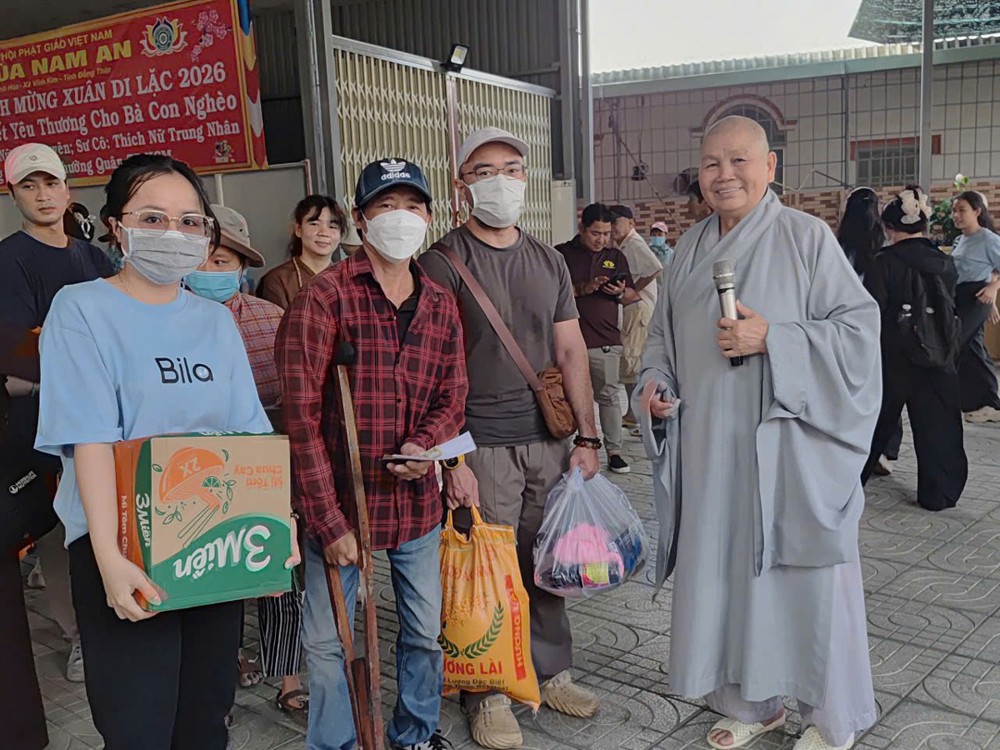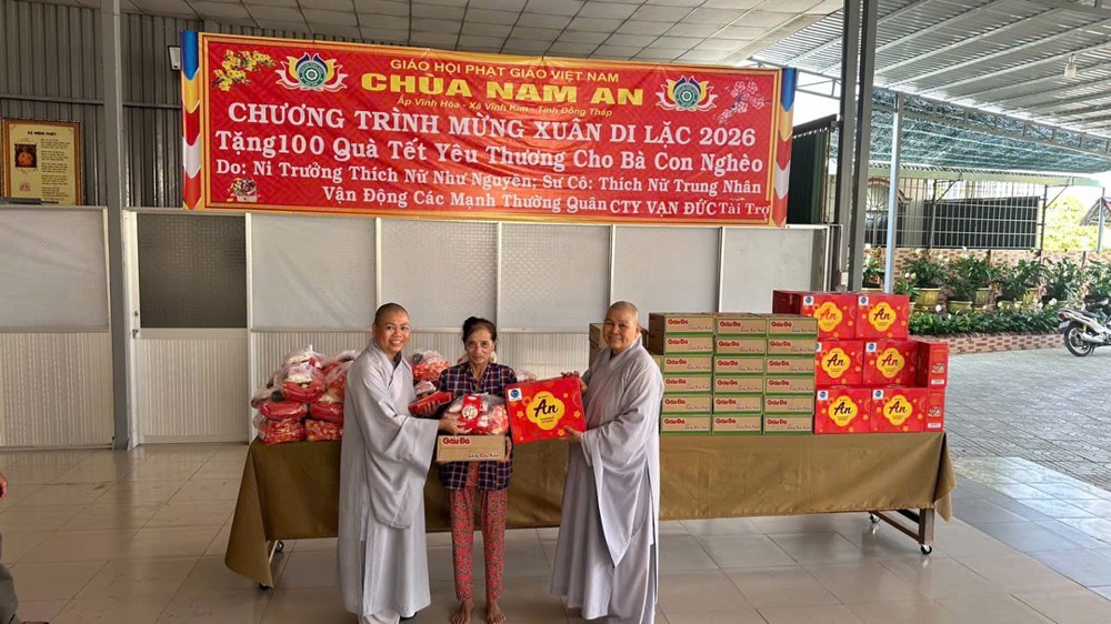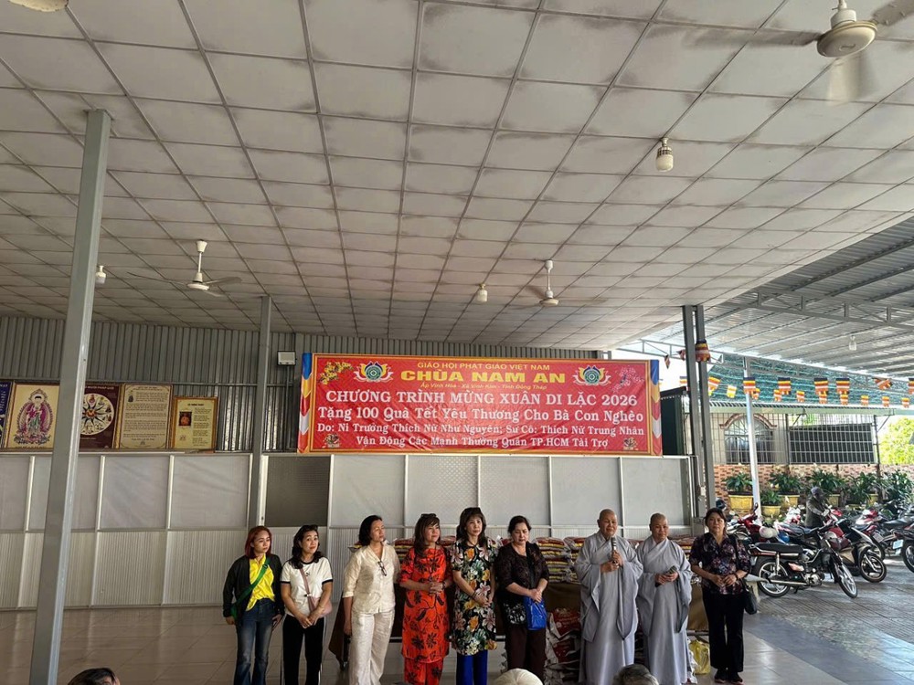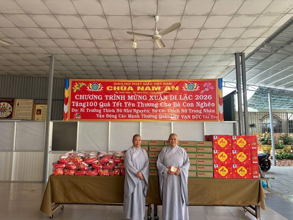 Theo đó, ngày 25/01/2026 (mùng 7 tháng Chạp năm Ất Tỵ) Ni trưởng Thích Nữ Như Nguyên – Phó Ban TTXH Phật giáo tỉnh Đồng Tháp, Viện chủ chùa Nam An; SC.Thích Nữ Trung Nhân – Trụ trì chùa Nam An cùng đại diện nhà tài trợ - Công ty Vạn Đức Tiền Giang, tổ chức trao 200 phần quà, mỗi phần trị giá 700 ngàn đồng (bao gồm nhu yếu phẩm và tiền mặt) đến bà con nghèo, các hoàn cảnh địa phương tham dự.