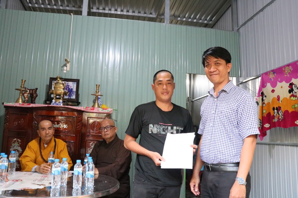 Phát biểu tại buổi lễ, đại diện mạnh thường quân, Thượng tọa Thích Thiện Hữu cho biết: Phật giáo Việt Nam từ xưa đến nay luôn đồng hành cùng dân tộc; dù trong hoàn cảnh thuận lợi hay khó khăn, Phật giáo vẫn luôn hiện diện để sẻ chia và phụng sự. Trên tinh thần đó, Phật giáo địa phương đặc biệt quan tâm đến công tác chăm lo đời sống cho người dân có hoàn cảnh khó khăn. Thượng tọa cũng chúc mừng gia đình anh Lê Thanh Tùng có được căn nhà mới khang trang, ổn định nơi ở, từng bước vượt qua khó khăn, vươn lên trong cuộc sống.