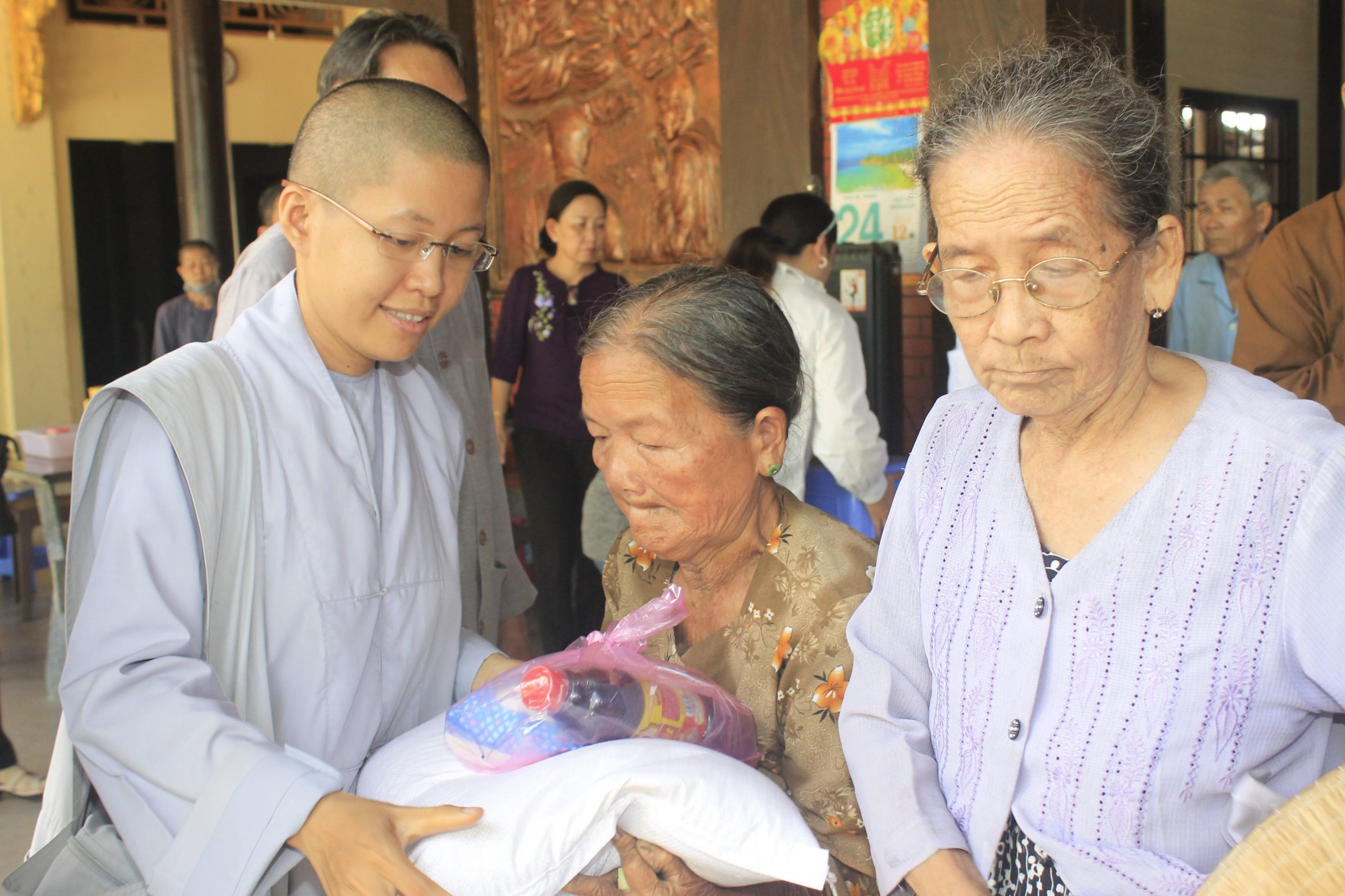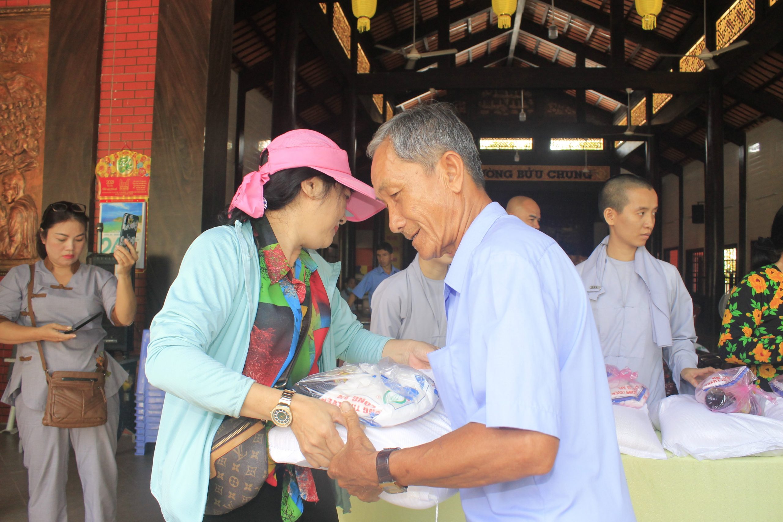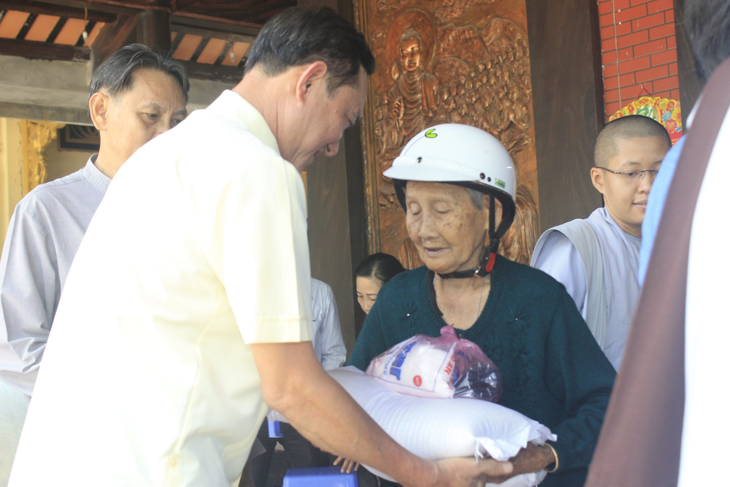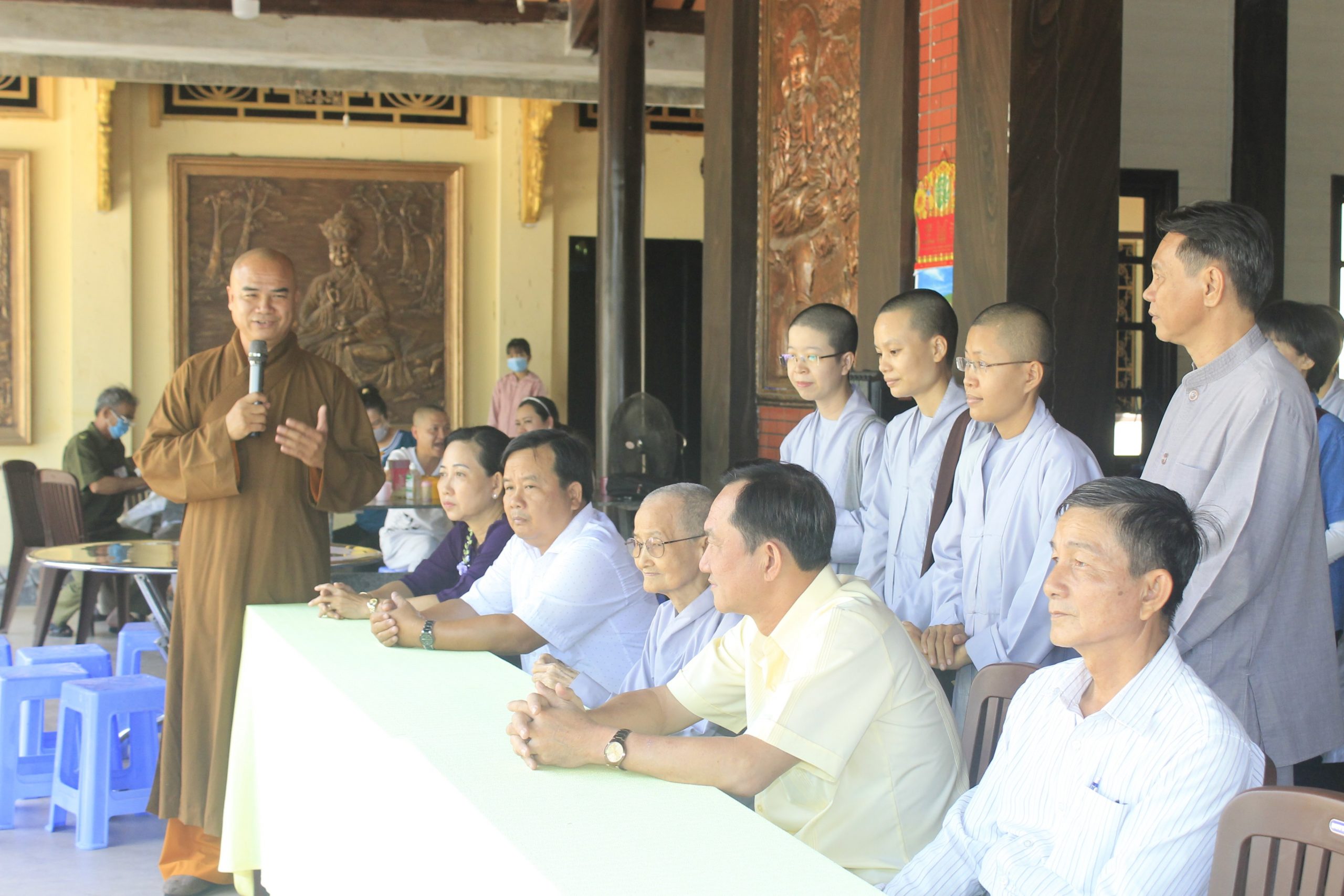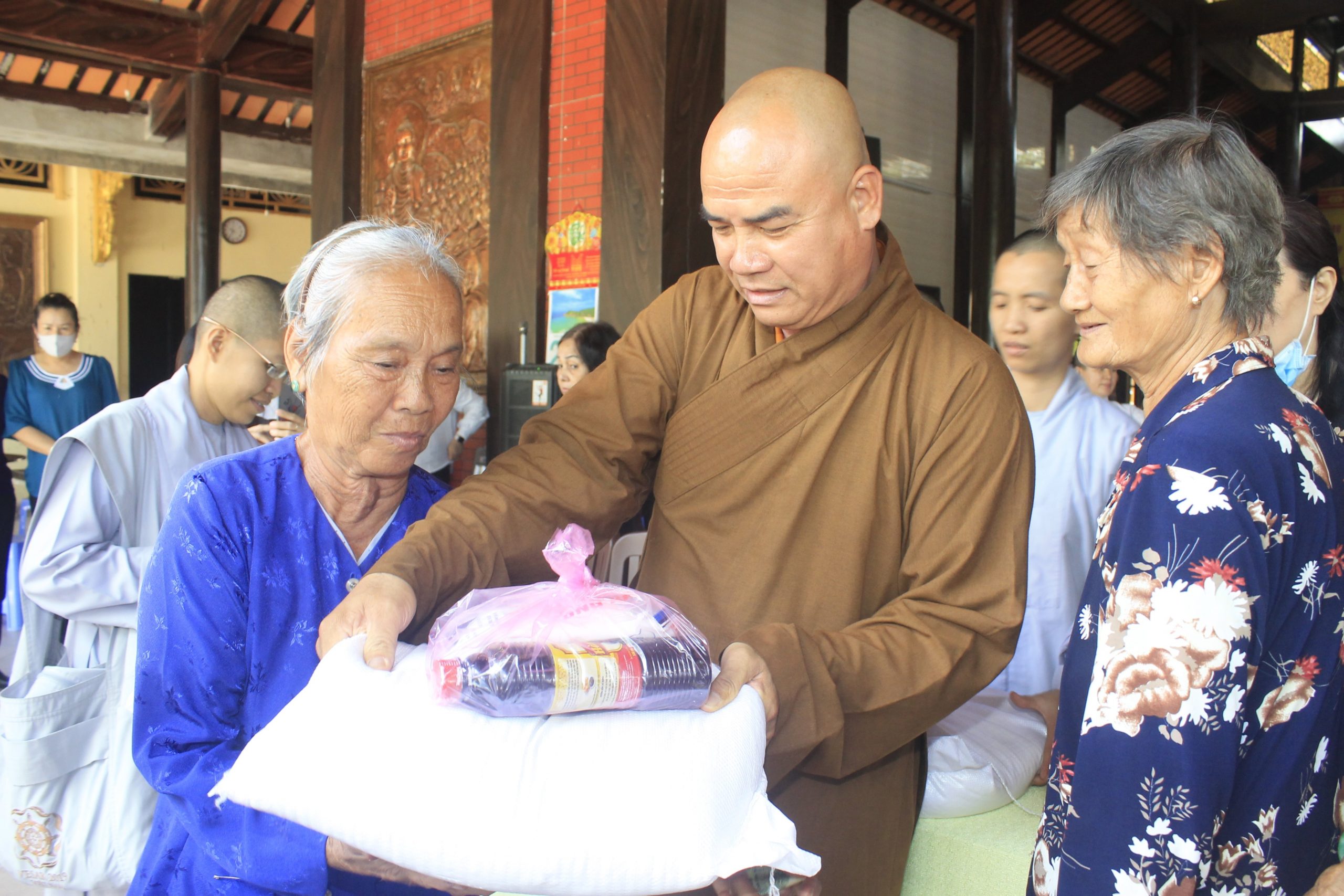 Buổi tặng quà dưới sự hướng dẫn của Thượng tọa Thích Tĩnh Triệt, cùng chư Tăng và Phật tử chùa Phước Long. Đại diện chính quyền địa phương có ông Đỗ Nhật Định – Phó Chủ tịch Ủy ban Nhân dân (UBND) huyện Châu Thành đồng tham dự.