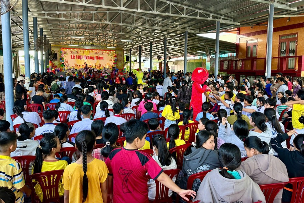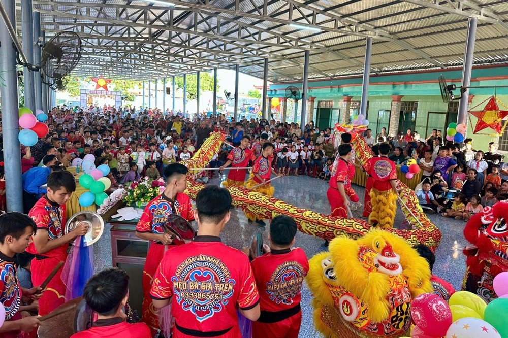 Điểm nhấn của đêm hội là khoảnh khắc các em nhỏ cùng quây quần dưới ánh trăng, xem múa lân, ca hát, tham gia trò chơi đố vui và nhận quà từ quý Thầy.