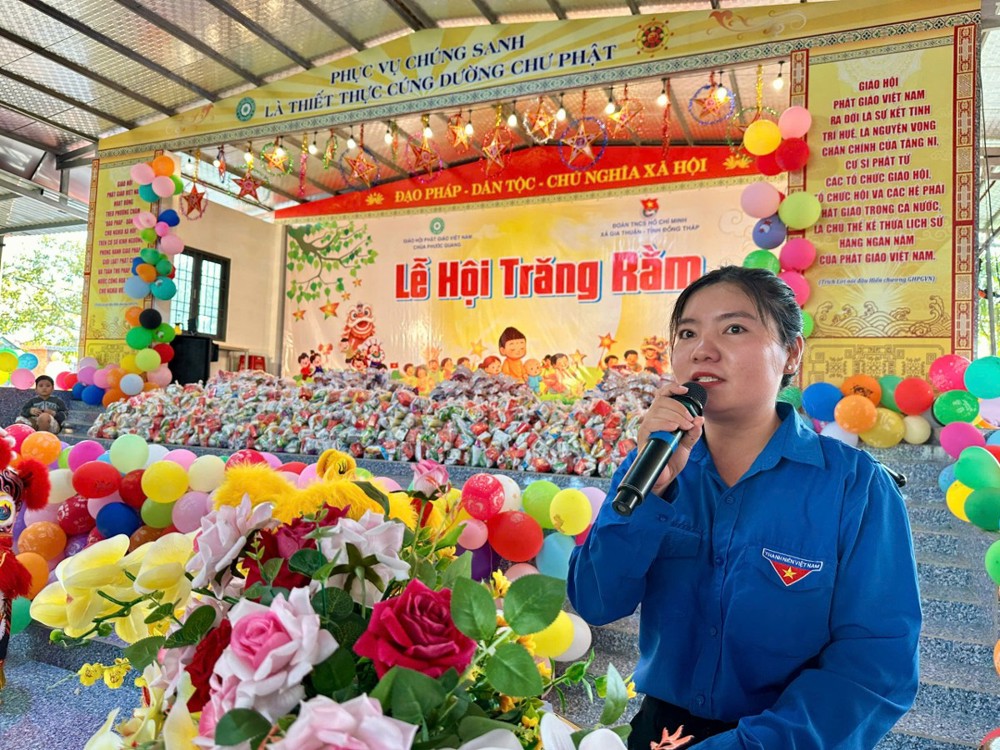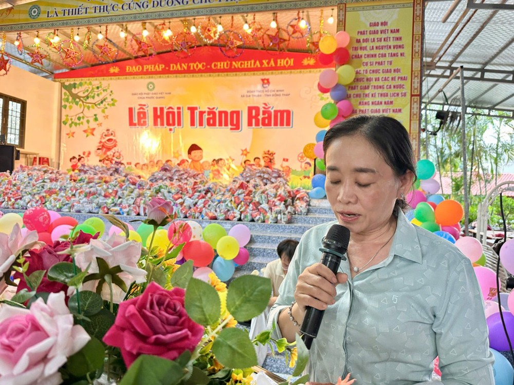 Đại diện lãnh đạo chính quyền, bà Võ Thị Minh Nguyệt - Phó Chủ tịch Ủy ban MTTQ xã Gia Thuận phát biểu cảm ơn đến Thượng tọa Trụ trì chùa Phước Quang và đại diện các đơn vị, cá nhân đóng góp cho chương trình Tết Trung thu năm nay.