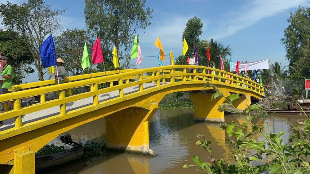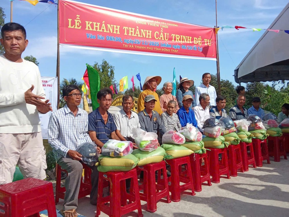 Hòa chung niềm vui của ngày lễ khánh thành cây cầu ý nghĩa nối liền 2 ấp, nhà tài trợ dành tặng 100 phần quà cho bà con có hoàn cảnh khó khăn (trị giá 30 triệu đồng) thể hiện tinh thần cứu khổ, ban vui của đạo Phật.