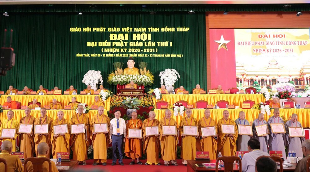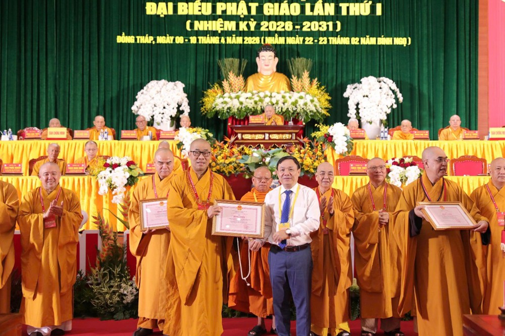 Đại diện Sở Nội vụ tỉnh công bố quyết định tặng Bằng Khen của UBND tỉnh cho 01 tập thể BTS và 21 cá nhân chư Tôn đức Tăng Ni; UB MTTQVN tỉnh Đồng Tháp tặng Bằng Khen đến 10 tập thể và 23 cá nhân có thành tích trong hoạt động Phật sự và đóng góp an sinh xã hội trong nhiệm kỳ qua.