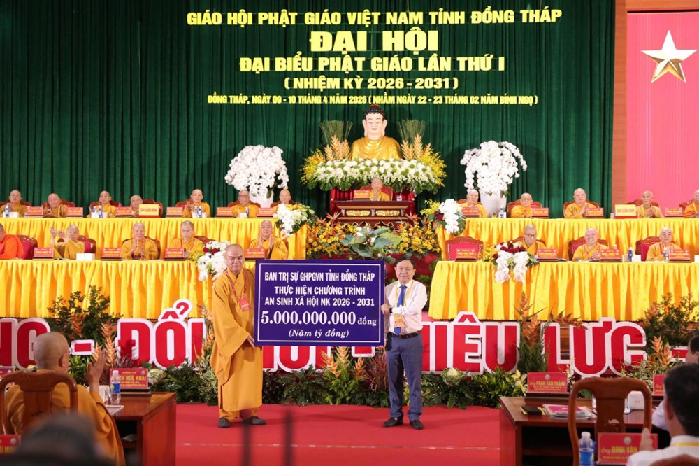 Với tin thần đồng hành cùng dân tộc, nhân Đại hội này BTS GHPGVN tỉnh Đồng Tháp nhiệm kỳ 2027 – 2031 trao biển tượng trưng 5 tỷ đồng cho quỹ an sinh xã hội UB MTTQVN tỉnh.