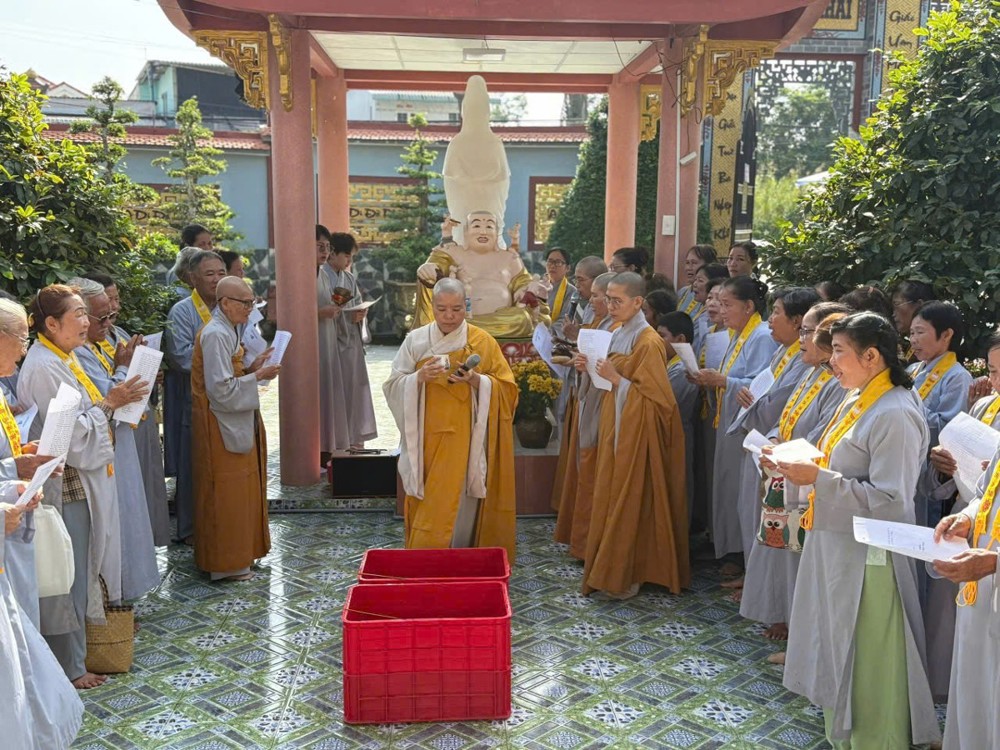 Như hằng lệ, buổi sáng chư Phật tử vân tập về đạo tràng trong không khí hoan hỷ và trang nghiêm. Đại chúng cùng nhau phát nguyện tu học, nguyện sống đời tỉnh thức theo lời Phật dạy. Tiếp đó là nghi thức phóng sanh, gieo trồng hạt giống từ bi, nuôi dưỡng tâm yêu thương đối với muôn loài.
