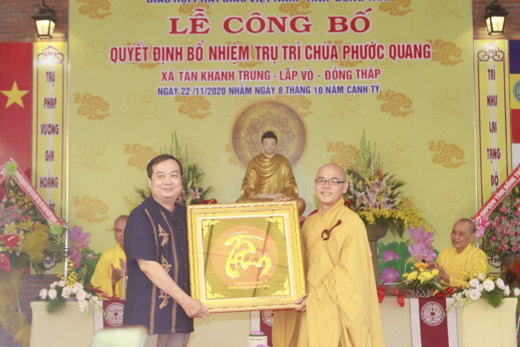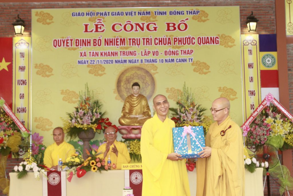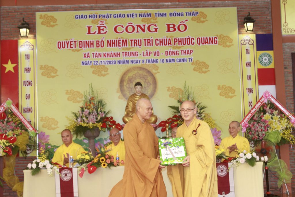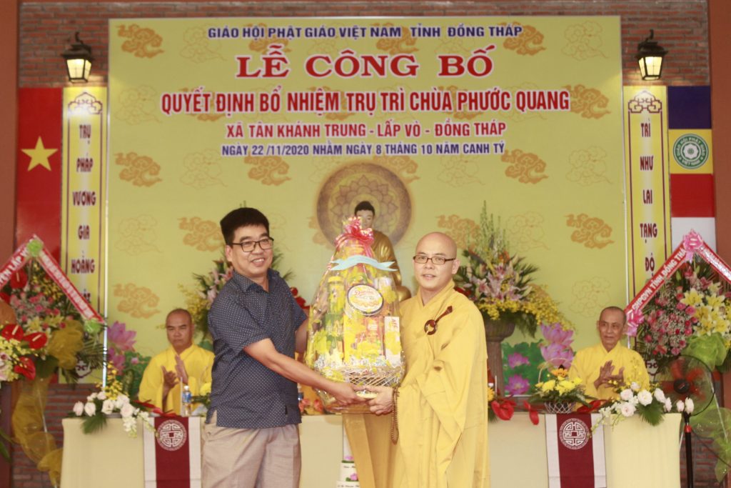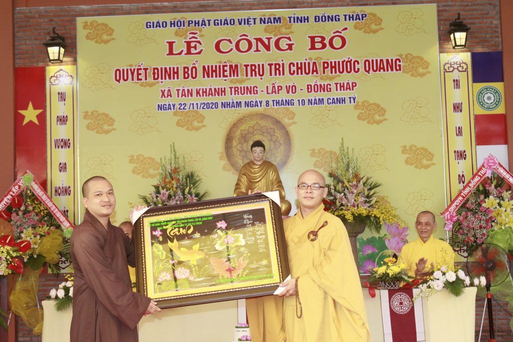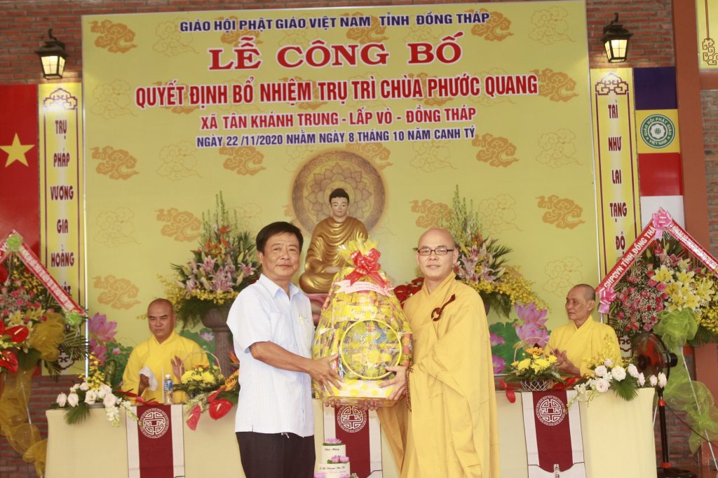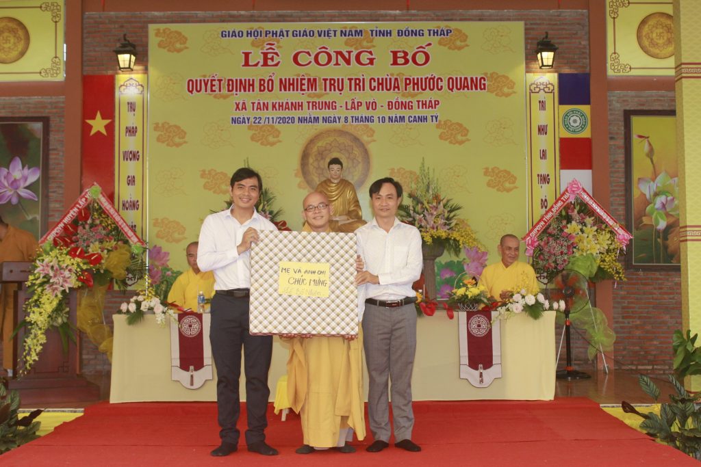 Trong buổi lễ, chư Tôn đức Ban chứng minh, Thường trực Ban Trị sự GHPGVN tỉnh Đồng Tháp, chư Tôn thiền đức Tăng Ni trong BTS thành phố, thị xã, các huyện, các ban chuyên môn trực thuộc PG tỉnh; cùng chư Tôn đức trụ trì các tự viện, cùng quý cấp chính quyền, lãnh đạo các ban ngành đoàn thể địa phương đã tặng hoa và quà chúc mừng đến tân trụ trì chùa Phước Quang.