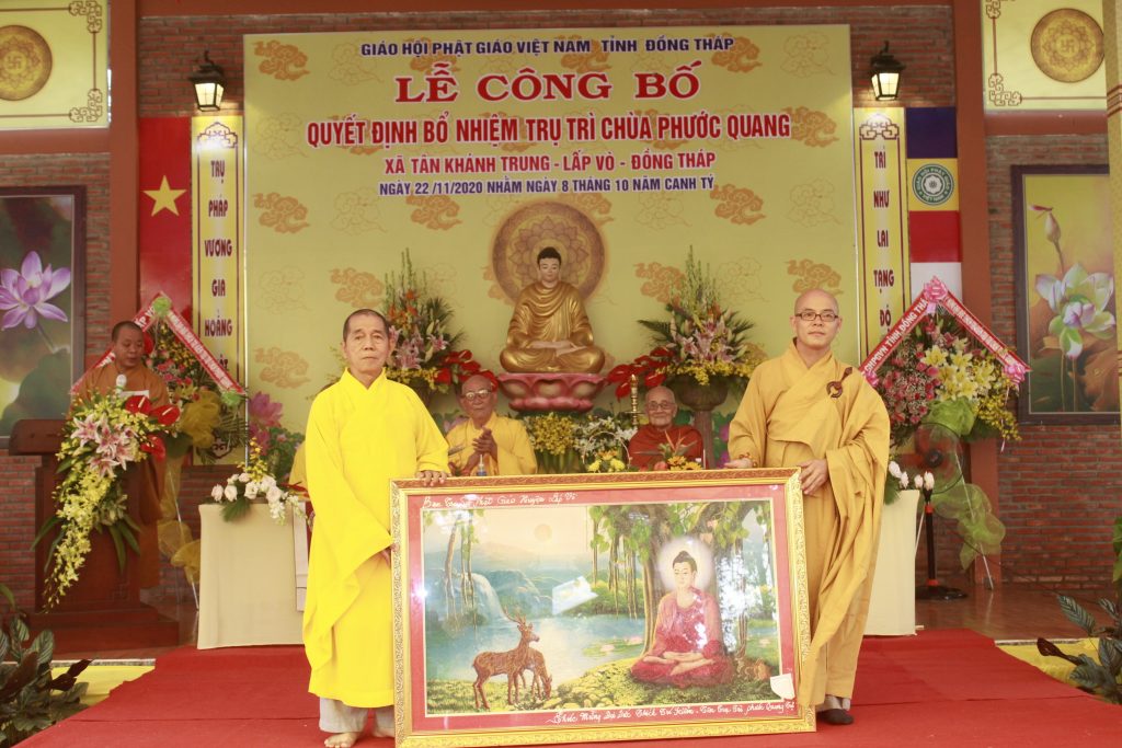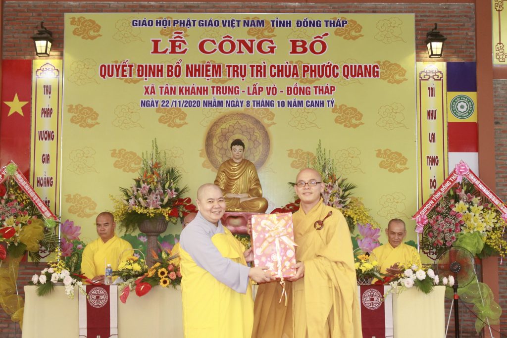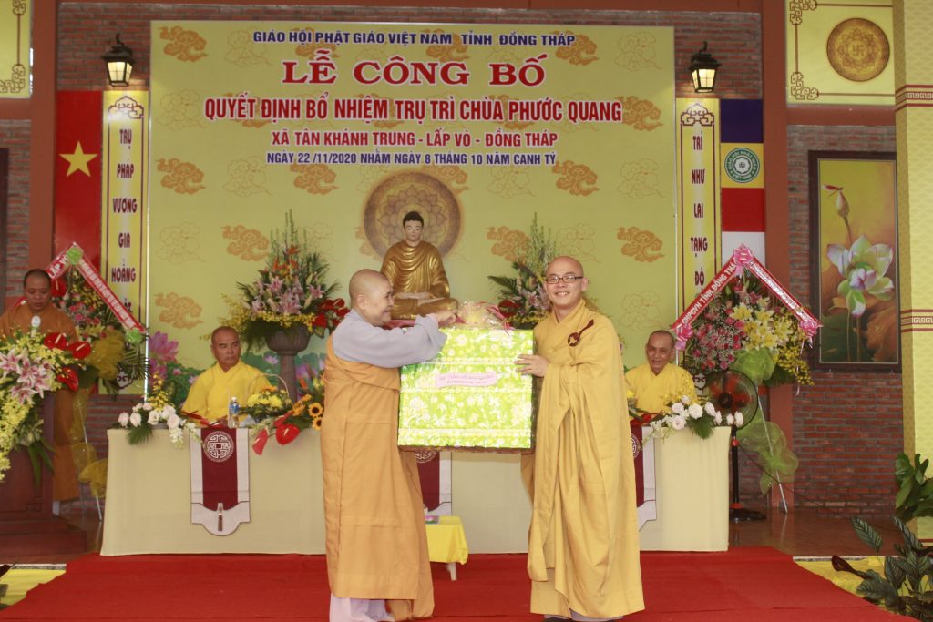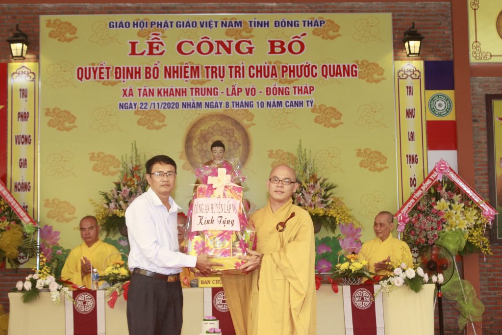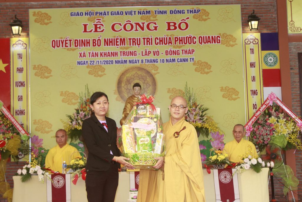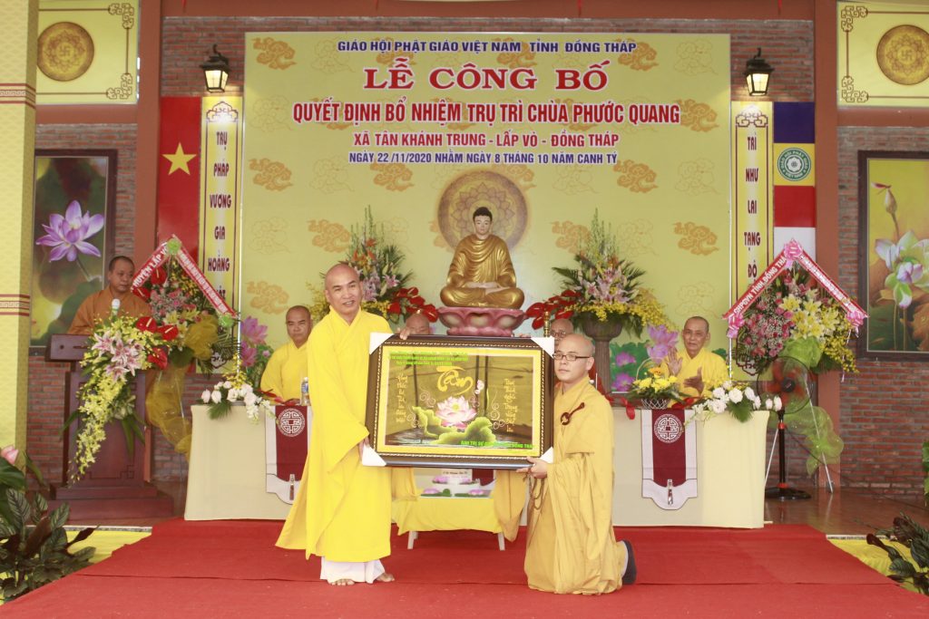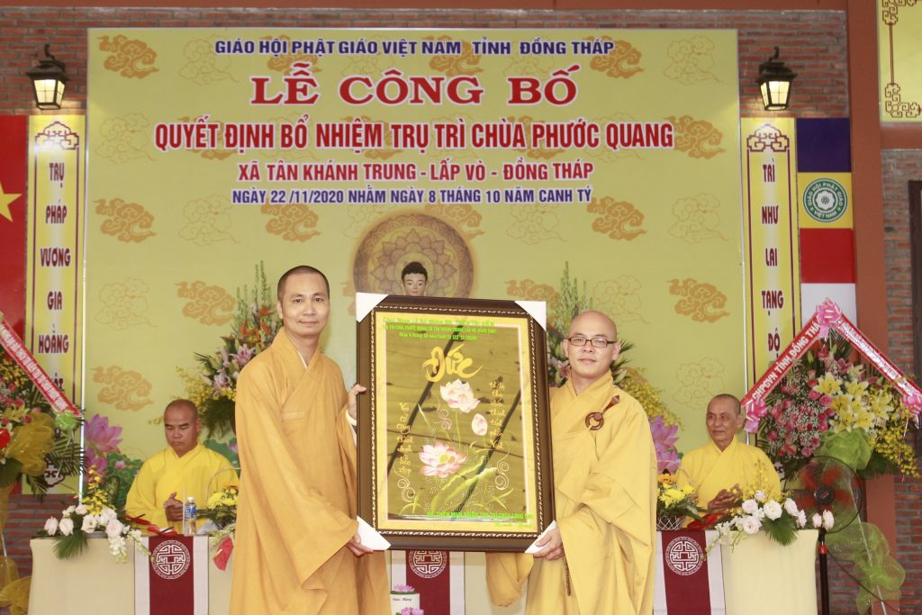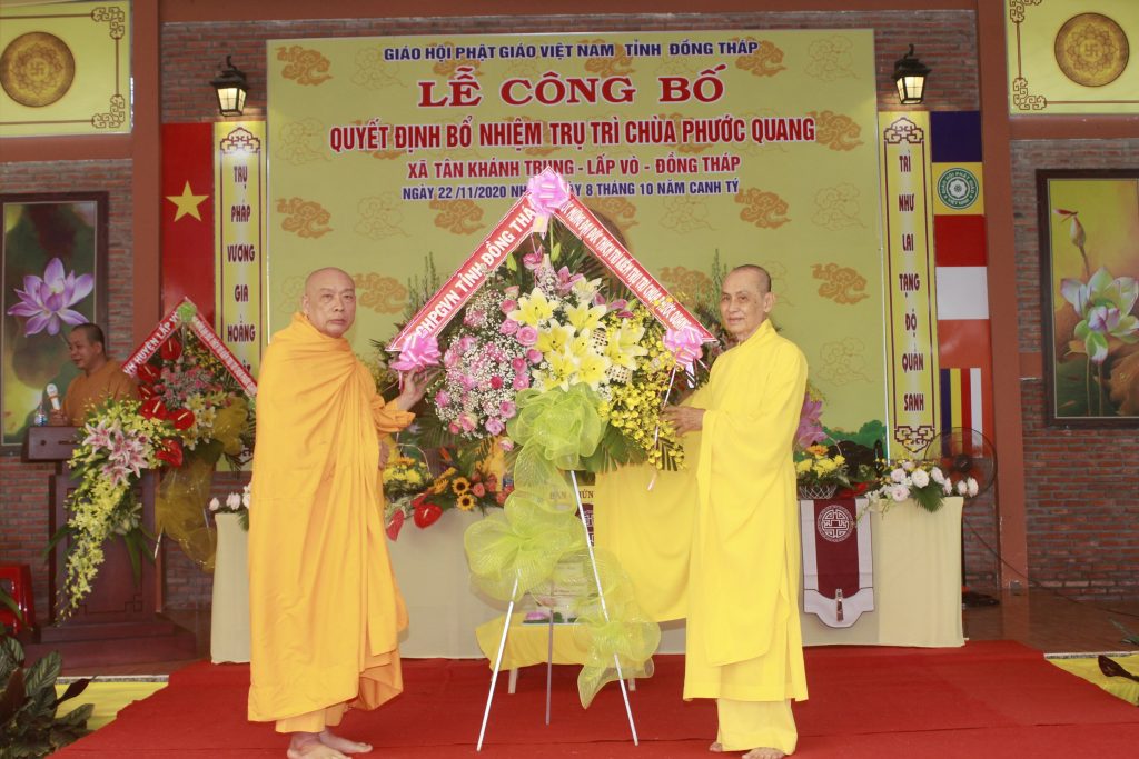 Trong buổi lễ, chư Tôn đức Ban chứng minh, Thường trực Ban Trị sự GHPGVN tỉnh Đồng Tháp, chư Tôn thiền đức Tăng Ni trong BTS thành phố, thị xã, các huyện, các ban chuyên môn trực thuộc PG tỉnh; cùng chư Tôn đức trụ trì các tự viện, cùng quý cấp chính quyền, lãnh đạo các ban ngành đoàn thể địa phương đã tặng hoa và quà chúc mừng đến tân trụ trì chùa Phước Quang.