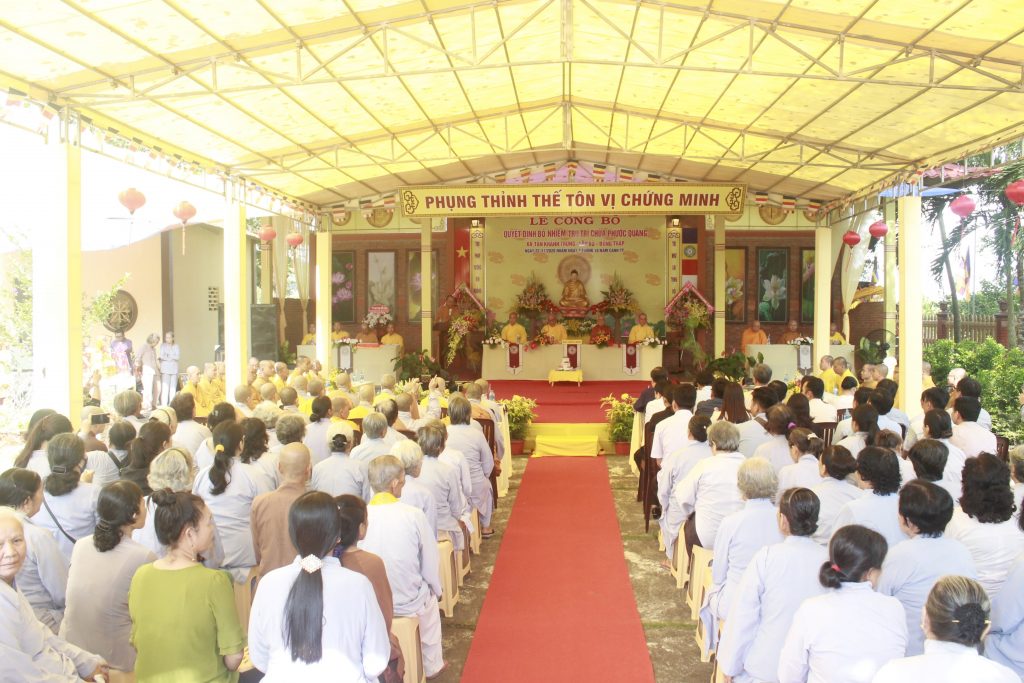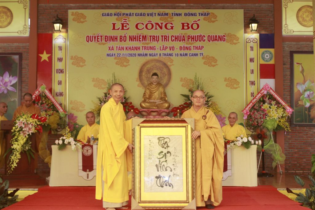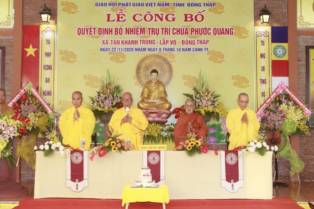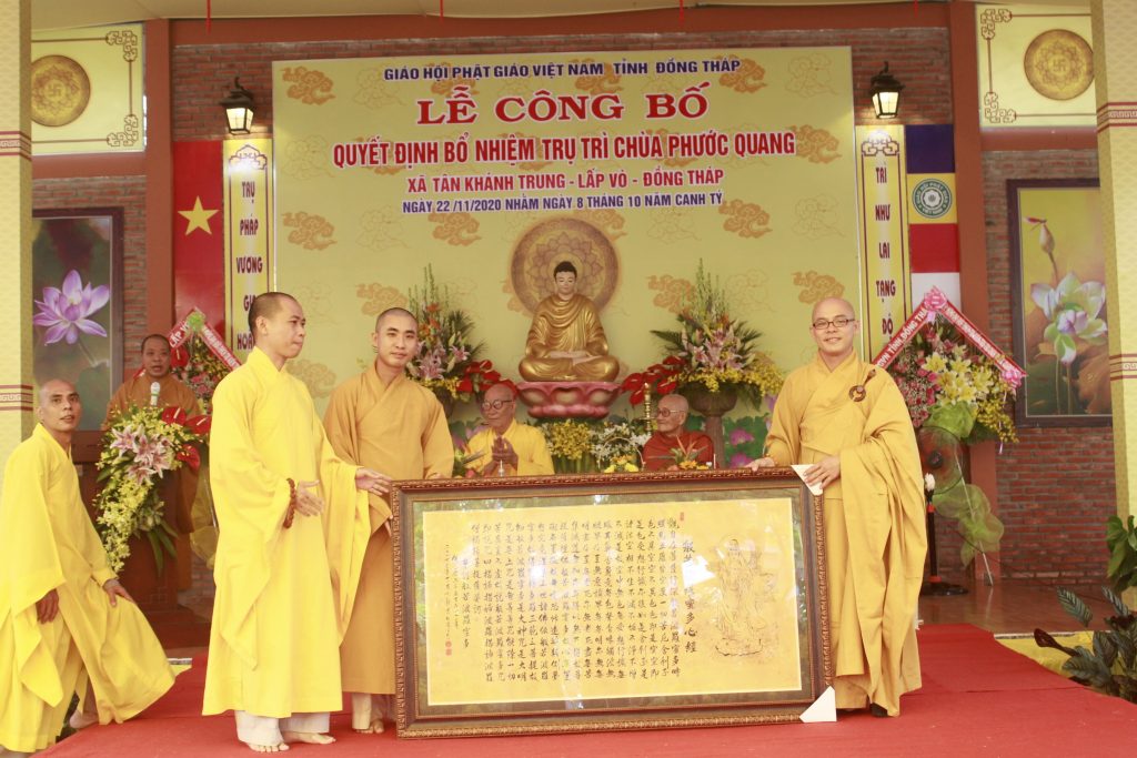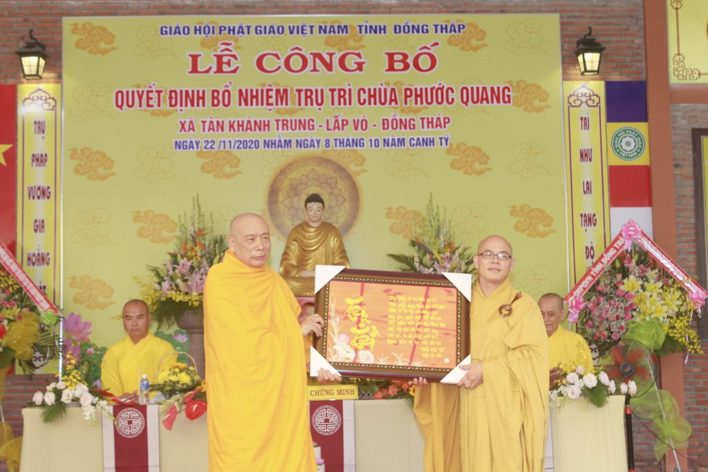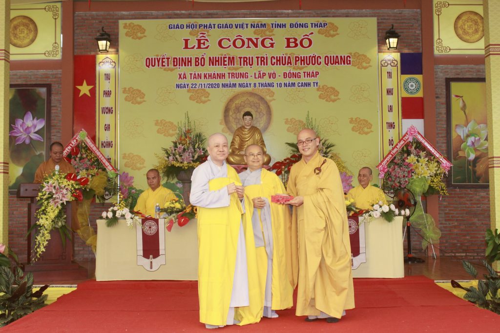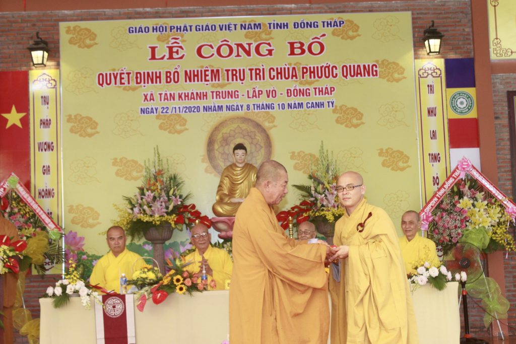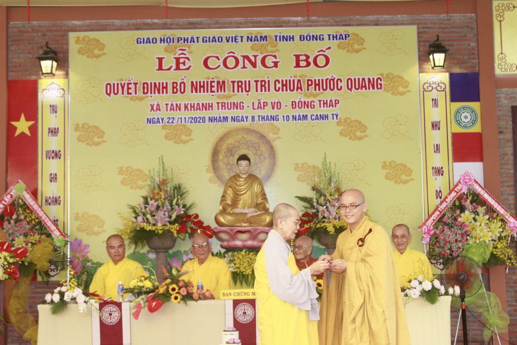 Tiếp đến, TT. Thích Minh Sơn - Phó Thư ký kiêm Chánh Văn phòng BTS GHPGBN tỉnh Đồng Tháp thừa ủy nhiệm của chư Tôn đức Thường trực BTS Phật giáo tỉnh, công bố Quyết định bổ nhiệm trụ trì chùa Phước Quang, xã Tân Khánh Trung, huyện Lấp Vò, tỉnh Đồng Tháp cho Đại đức Thích Trí Kiểm (thế danh Nguyễn Xuân Hân, sinh 1982) giữ nhiệm vụ trụ trì. Trong giây phút thiêng liêng, TT. Thích Tĩnh Triệt trang trọng trao bằng Quyết định Bổ nhiệm Trụ trì cho Đại đức tân trụ trì chùa Phước Quang.