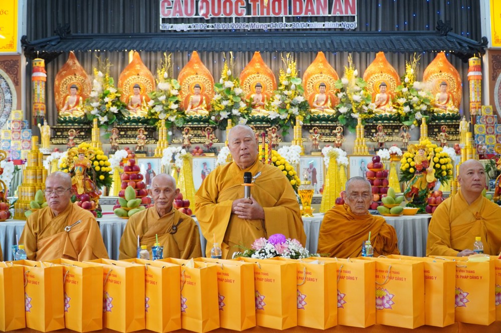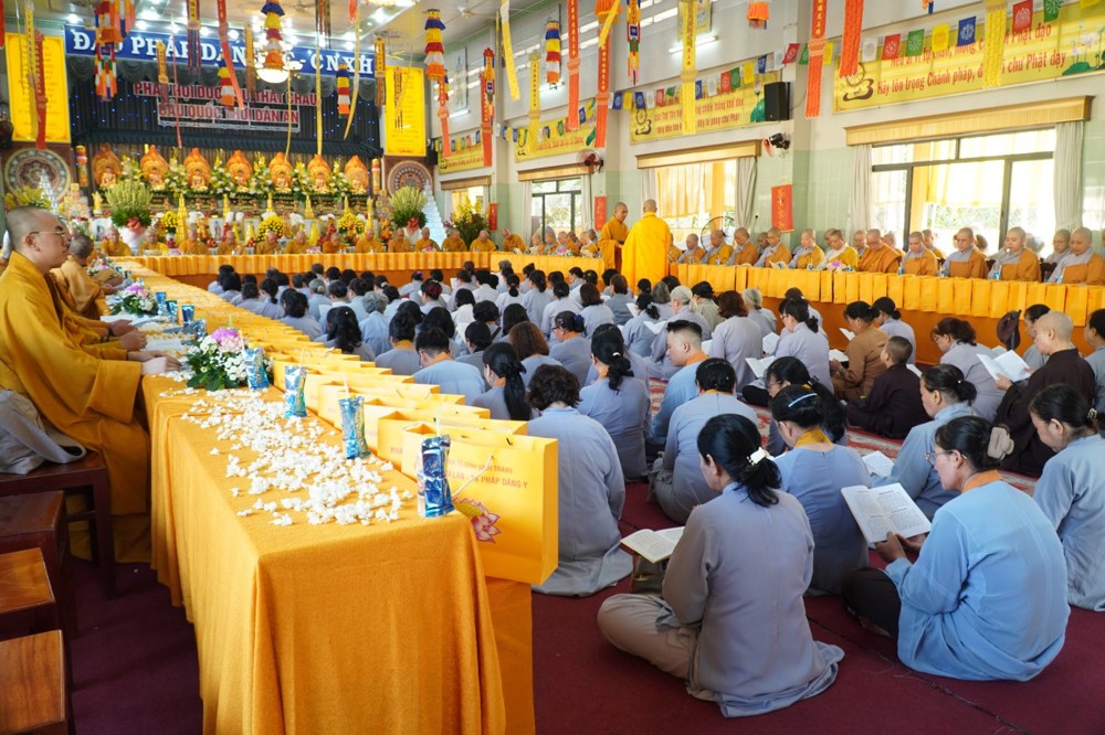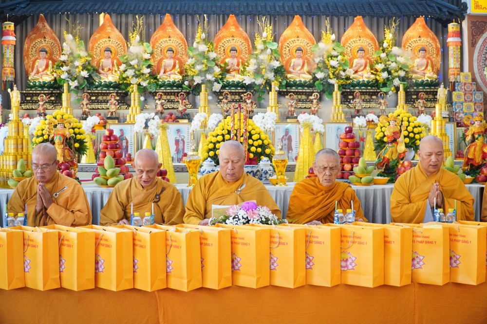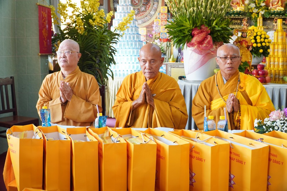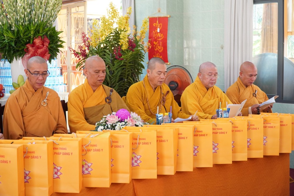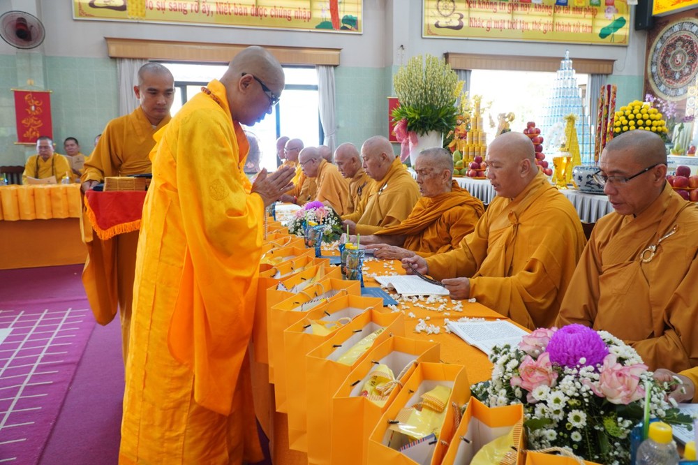 Thượng tọa cũng thay mặt Ban Tổ chức và hàng Phật tử tác bạch cúng dường tịnh tài phẩm vật lên chư Tôn đức, nhằm tạo phước duyên lành cầu kiết tường, bình an đến toàn thể hội chúng và nguyện cho Phật sự năm mới tại tỉnh nhà được thành tựu viên mãn.