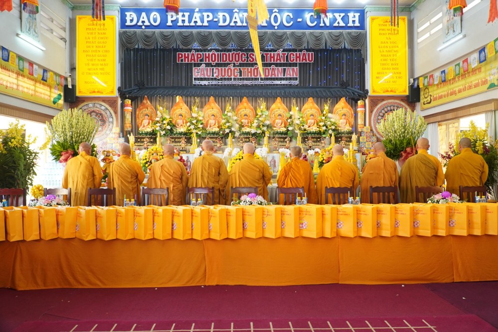Thay mặt Ban Tổ chức Pháp hội Dược Sư, Thượng tọa Thích Quảng Lộc tác bạch cung thỉnh chư Tôn đức quang lâm đàn tràng niêm hương bạch Phật; đồng thời cung thỉnh toàn thể hội chúng đồng trang nghiêm hòa âm trì tụng Kinh Dược Sư Bổn Nguyện Công Đức.