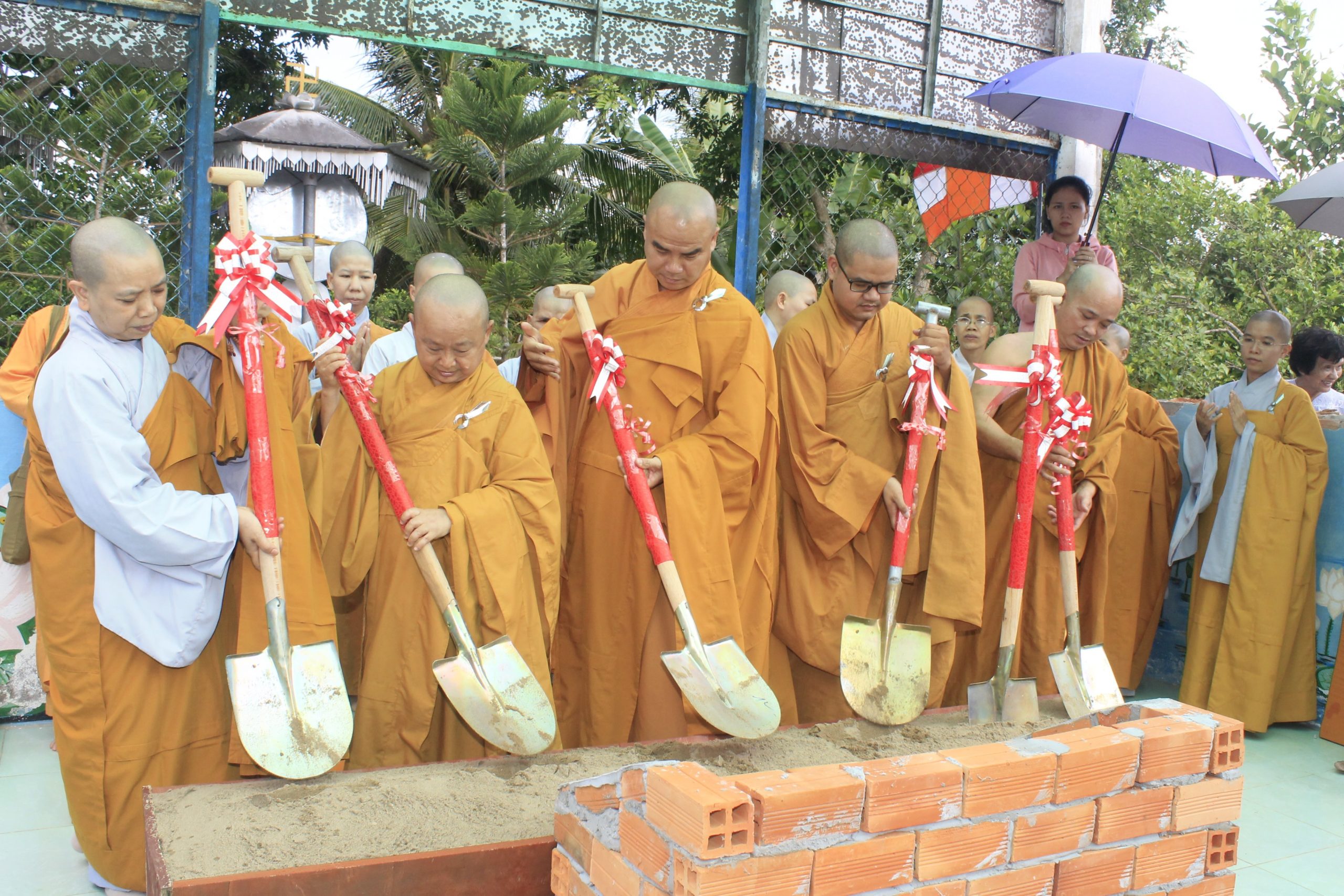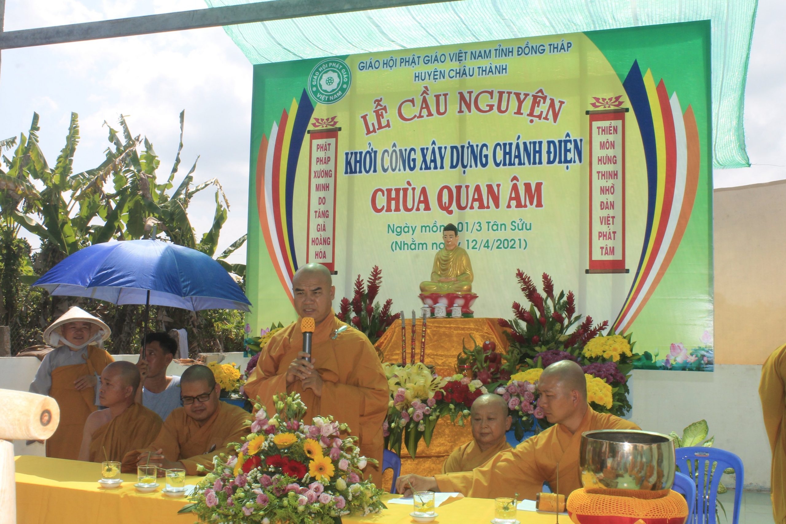 TT. Thích Tĩnh Triệt - Phó ban Thường trực Ban Trị sự GHPGVN tỉnh Đồng Tháp, Trưởng ban Trị sự Phật giáo huyện Châu Thành ban đạo từ tại buổi lễTrước khi kết thúc buổi lễ, chư Tôn đức Tăng Ni và các Phật tử đã cử hành nghi lễ trì chú, niêm hương bạch Phật và xúc những xẻng cát đầu tiên, chính thức động thổ ngôi xây dựng ngôi Đại hùng Bảo điện chùa Quan Âm trong không khí hoan hỷ, ấm tình đạo vị.