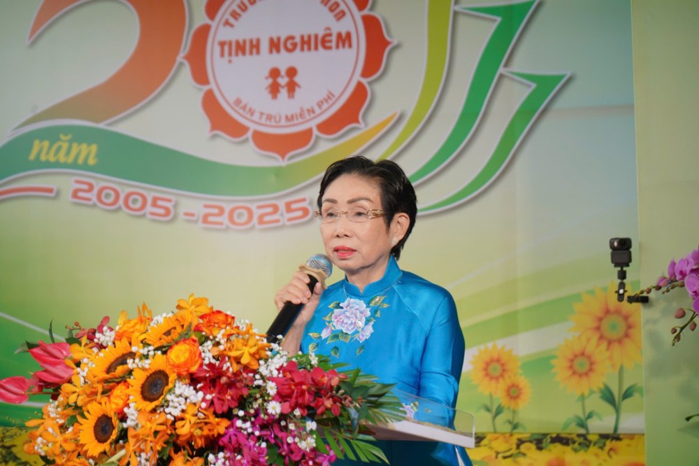 Thay mặt Trung ương Hội Khuyến học Việt Nam, PGS.TS Trương Thị Hiền cũng gửi lời chúc mừng và đánh giá cao ý nghĩa nhân văn sâu sắc của mô hình giáo dục này. Bà khẳng định rằng Trường Mầm non miễn phí Tịnh Nghiêm là sự kết hợp hài hòa giữa tinh thần Phật giáo từ bi và chủ trương khuyến học của Đảng và Nhà nước, góp phần nuôi dưỡng những thế hệ trẻ sống có đạo đức, biết yêu thương và chia sẻ.