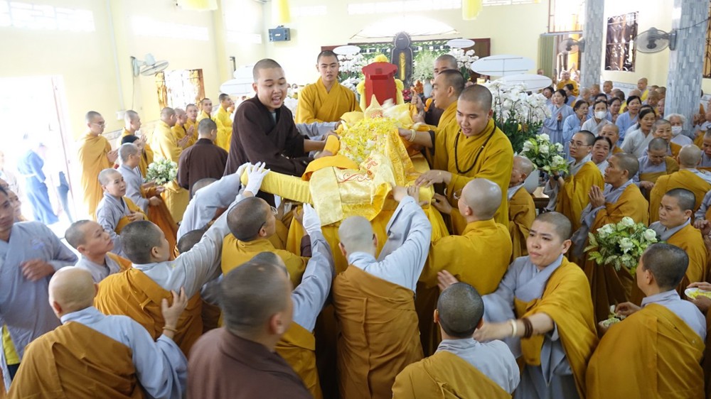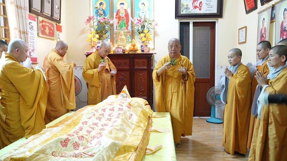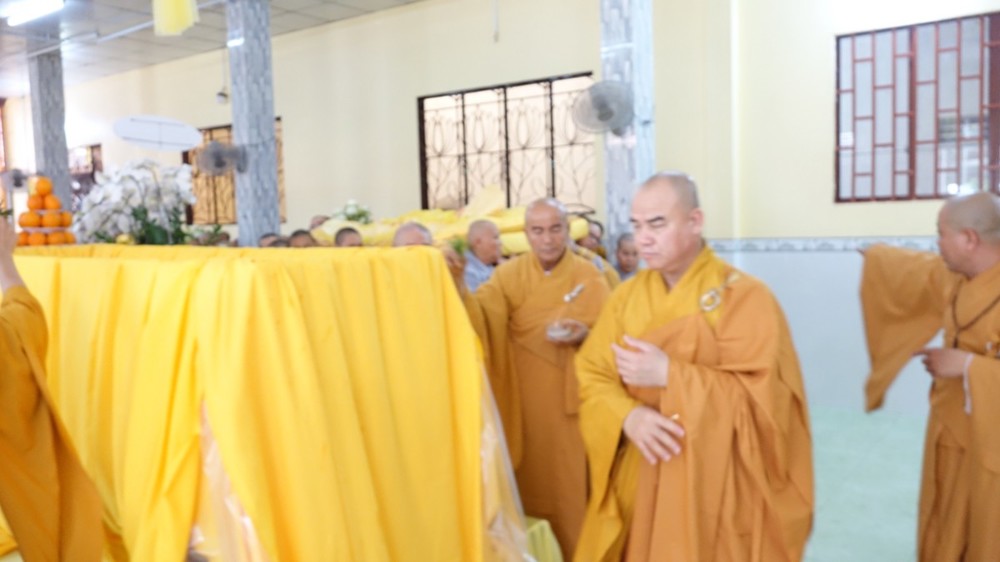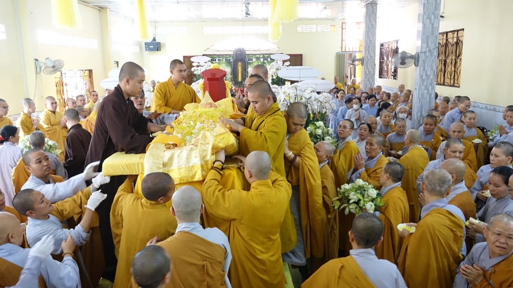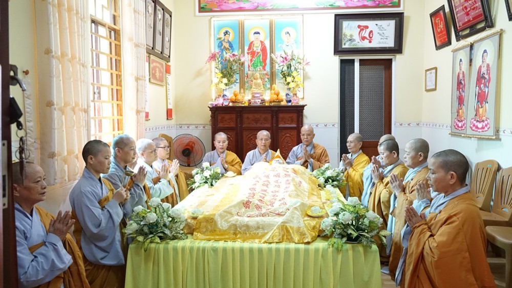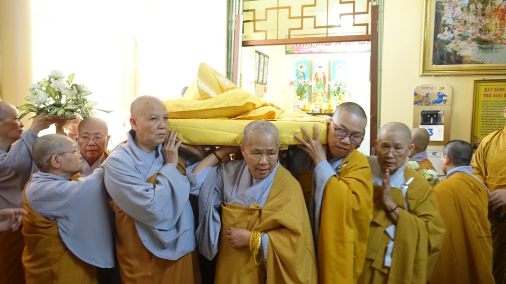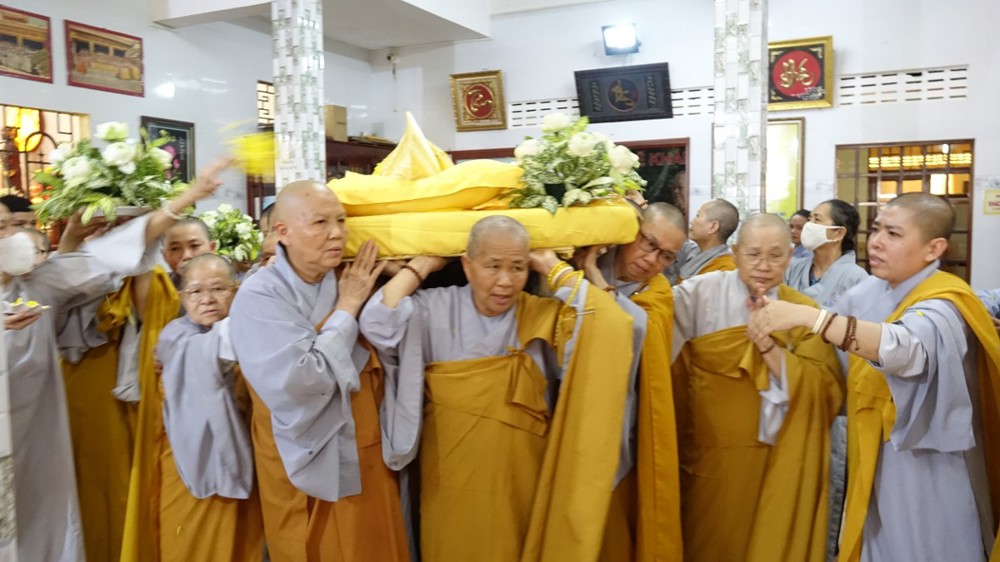 Trong tiếng niệm Phật và âm ba trầm hùng của chuông trống Bát-nhã, môn đồ pháp quyến đã cung thỉnh nhục thân Ni trưởng rời thiền thất hướng về Giác linh đường, để chính thức cử hành lễ nhập quan.