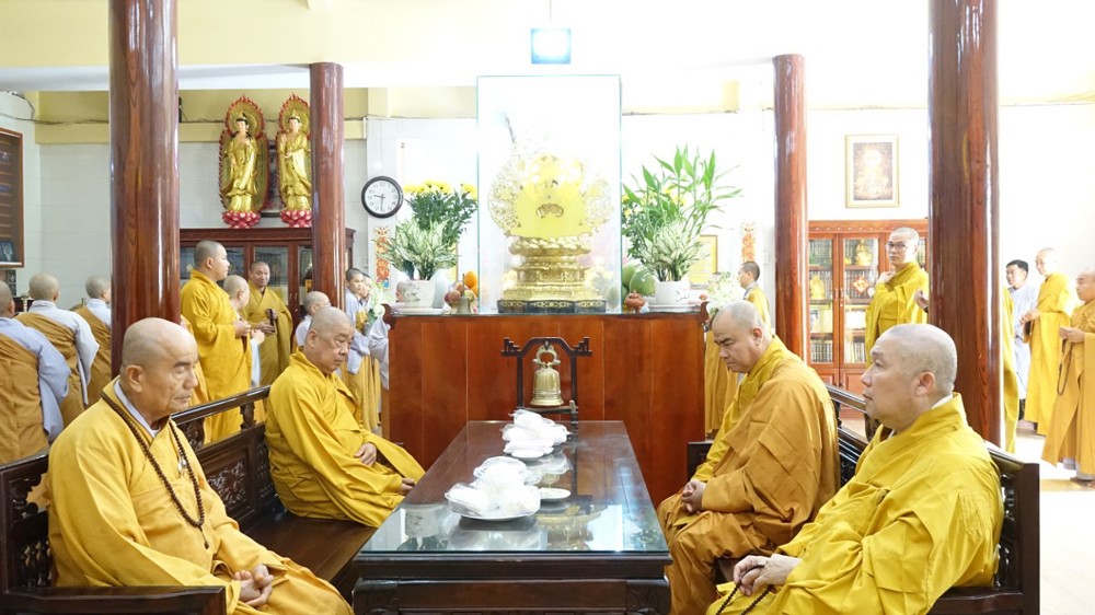 Tại Tổ đường, Ni trưởng Thích Nữ Như Chánh đại diện môn đồ pháp quyến tác bạch cung thỉnh chư Tôn đức quang lâm thực hiện nghi thức thỉnh nhục thân Cố Ni trưởng tân viên tịch nhập kim quan.