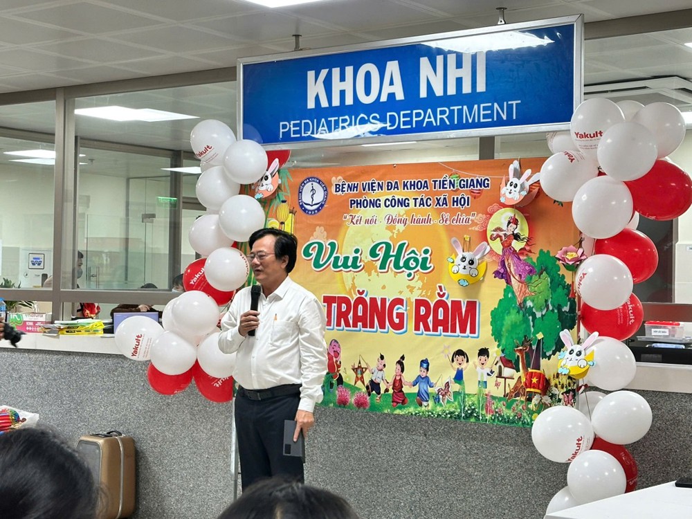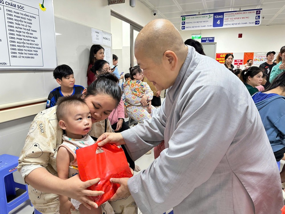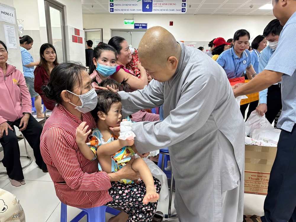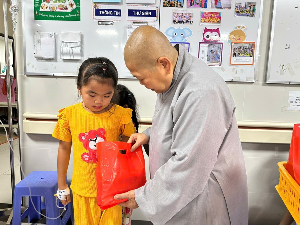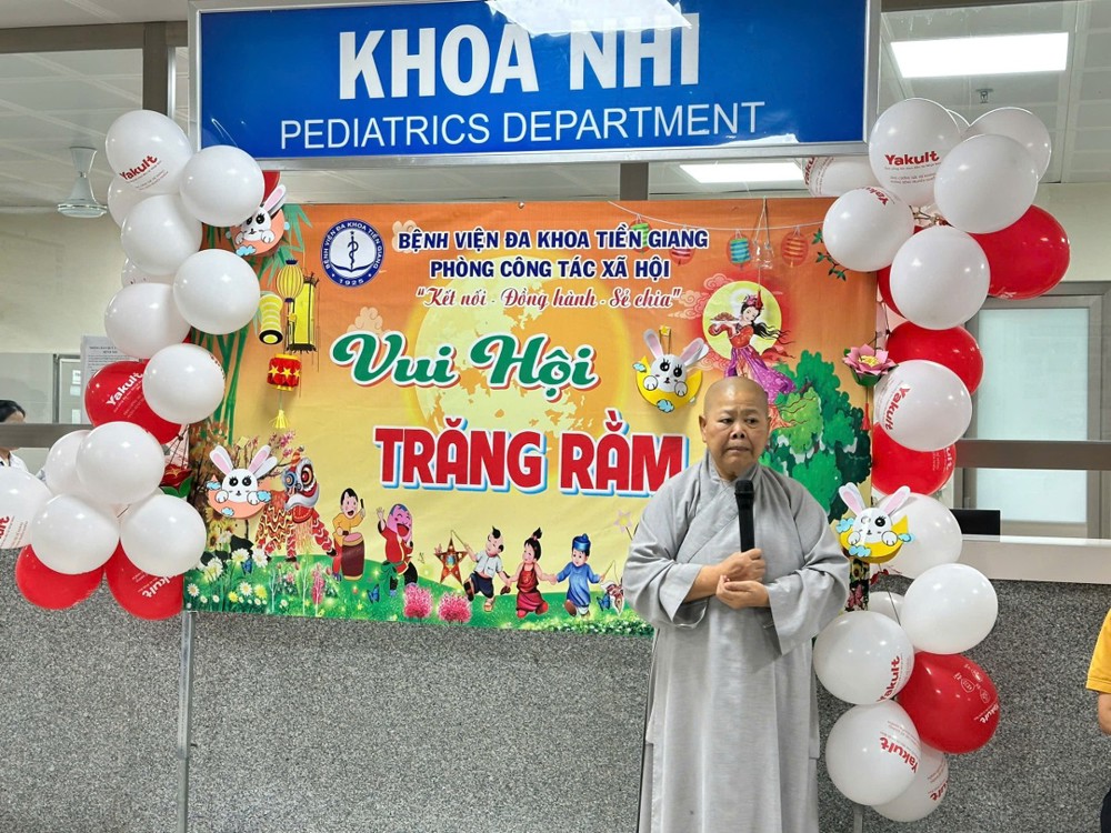 Buổi chiều, Ni trưởng Thích Nữ Tịnh Nghiêm tiếp tục phối hợp cùng Phòng Công tác Xã hội – Bệnh viện Đa khoa Tiền Giang và các nhà hảo tâm tổ chức chương trình “Vu hội Trăng rằm” dành tặng cho các em nhỏ đang điều trị tại bệnh viện. Những phần quà gồm bánh trung thu, sữa, lồng đèn và lời chúc an lành đã được gửi đến tận tay các bệnh nhi.