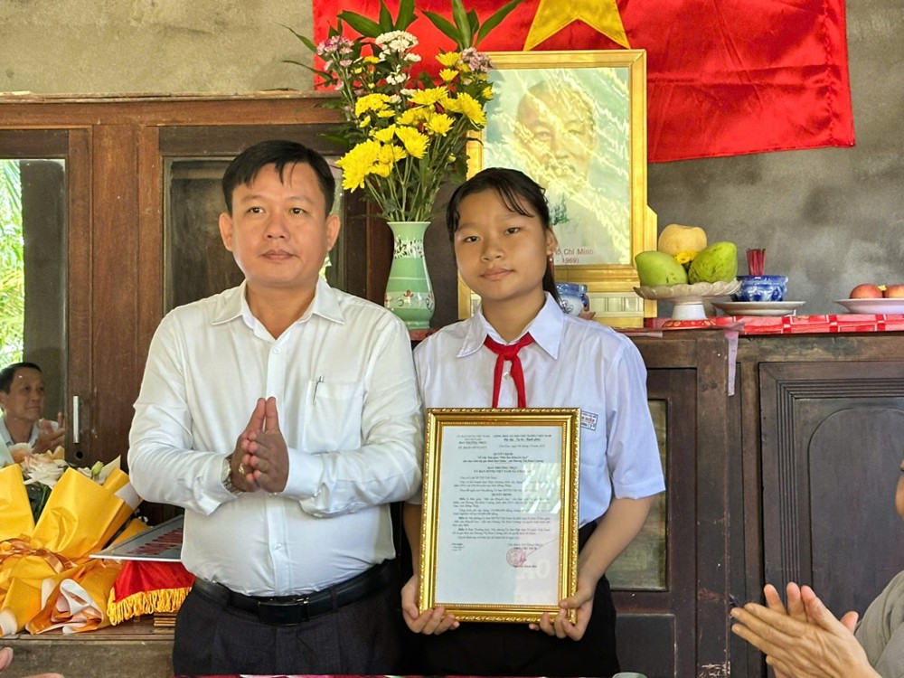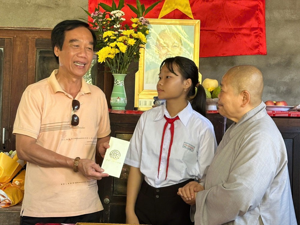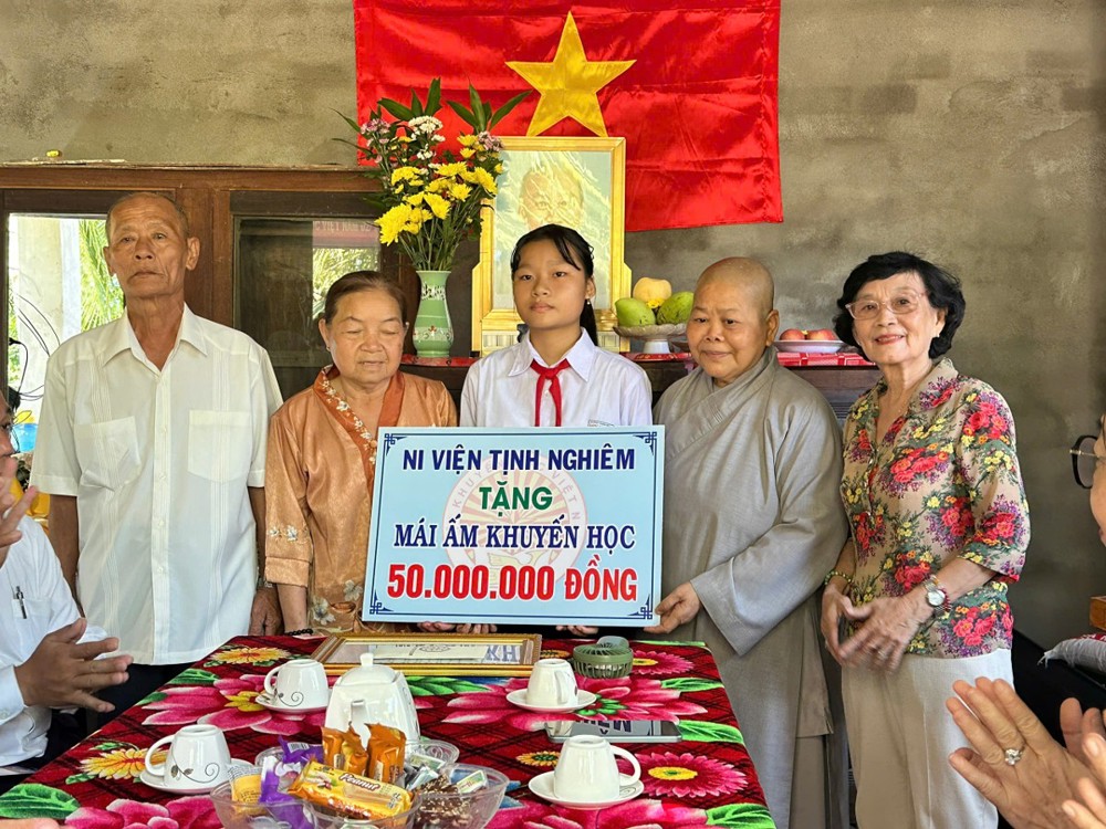 Gia đình em Kim Cương thuộc diện khó khăn, nhưng em luôn nỗ lực vươn lên trong học tập với thành tích tốt nhiều năm liền. Thấu hiểu hoàn cảnh đó, Ni trưởng Thích Nữ Tịnh Nghiêm đã vận động và tài trợ 50 triệu đồng để hỗ trợ gia đình xây dựng căn nhà mới – một nơi an cư vững chắc giúp em yên tâm học tập, nuôi dưỡng hoài bão tương lai.