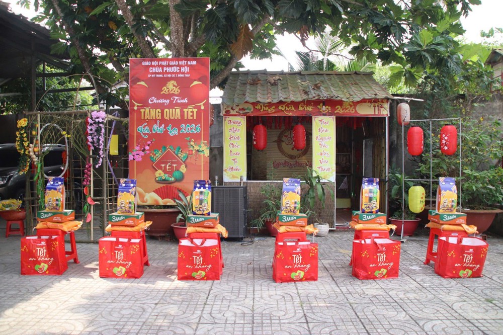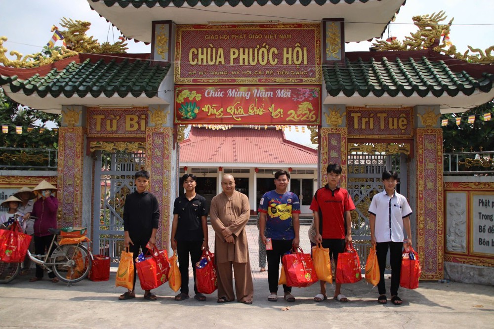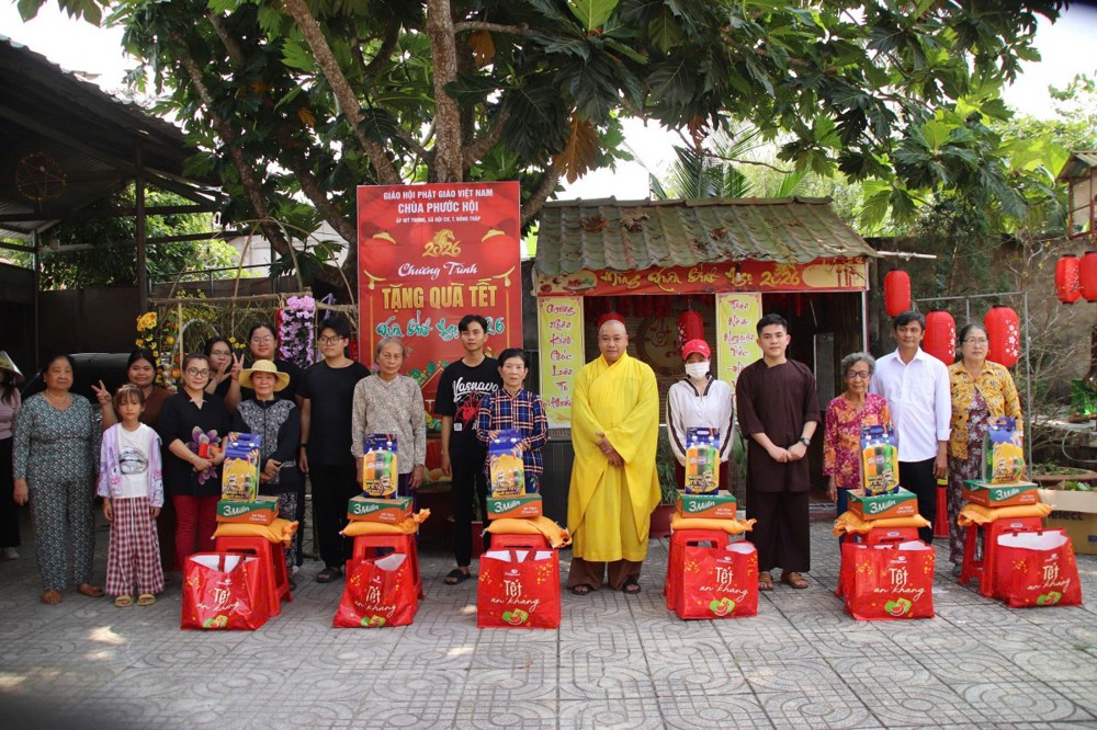 PSO - Sáng ngày 07/02/2026 (nhằm ngày 20 tháng Chạp năm Ất Tỵ), Phân ban Từ thiện xã hội Giáo dục Trung ương phối hợp cùng chùa Phước Hội (ấp Mỹ Trung, xã Hội Cư, tỉnh Đồng Tháp) tổ chức chương trình trao tặng 100 phần quà Tết đến các hộ gia đình có hoàn cảnh khó khăn tại địa phương, góp phần mang đến một mùa Xuân ấm áp, nghĩa tình cho bà con vùng quê.