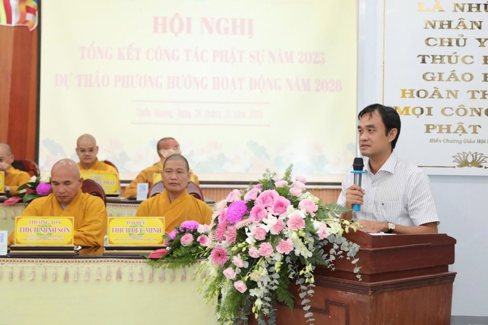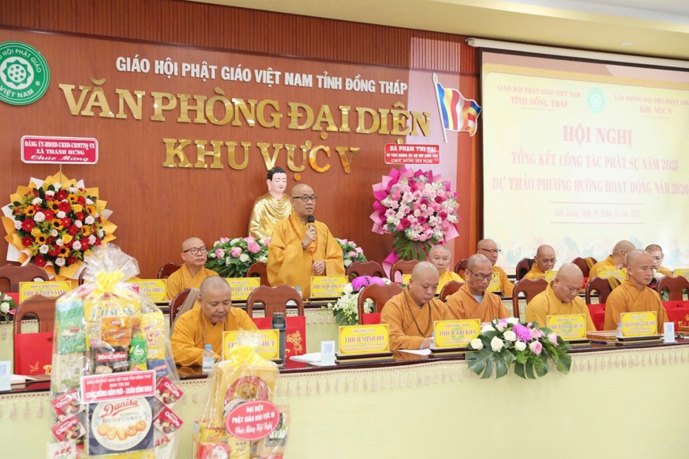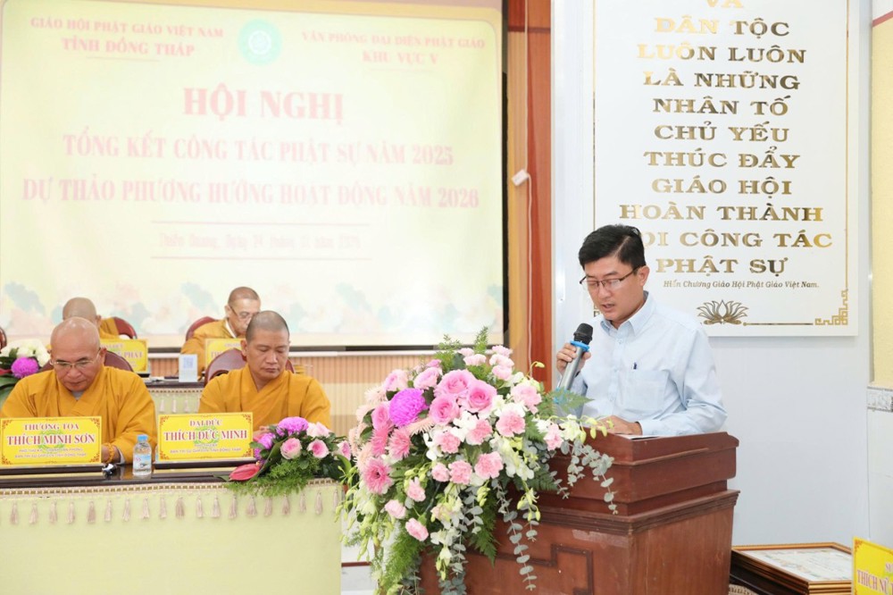 Phát biểu tại hội nghị, ông Nguyễn Văn Vũ Minh – Giám đốc Sở Nội vụ tỉnh đánh giá cao sự cải tiến trong nội dung và hình thức văn kiện hội nghị của Phật giáo Khu vực V, đặc biệt là việc đi đầu trong thực hiện chuyển đổi số, góp phần nâng cao hiệu quả quản lý, tiết kiệm chi phí và phù hợp với xu thế phát triển chung. Ông cũng ghi nhận tinh thần chủ động trong giải quyết nội bộ, đồng thời đề nghị Phật giáo Khu vực V tiếp tục tăng cường mối quan hệ phối hợp với chính quyền địa phương, chăm lo tốt hơn công tác an sinh xã hội, ổn định trật tự xã hội nhất là trong dịp Tết cổ truyền sắp đến.