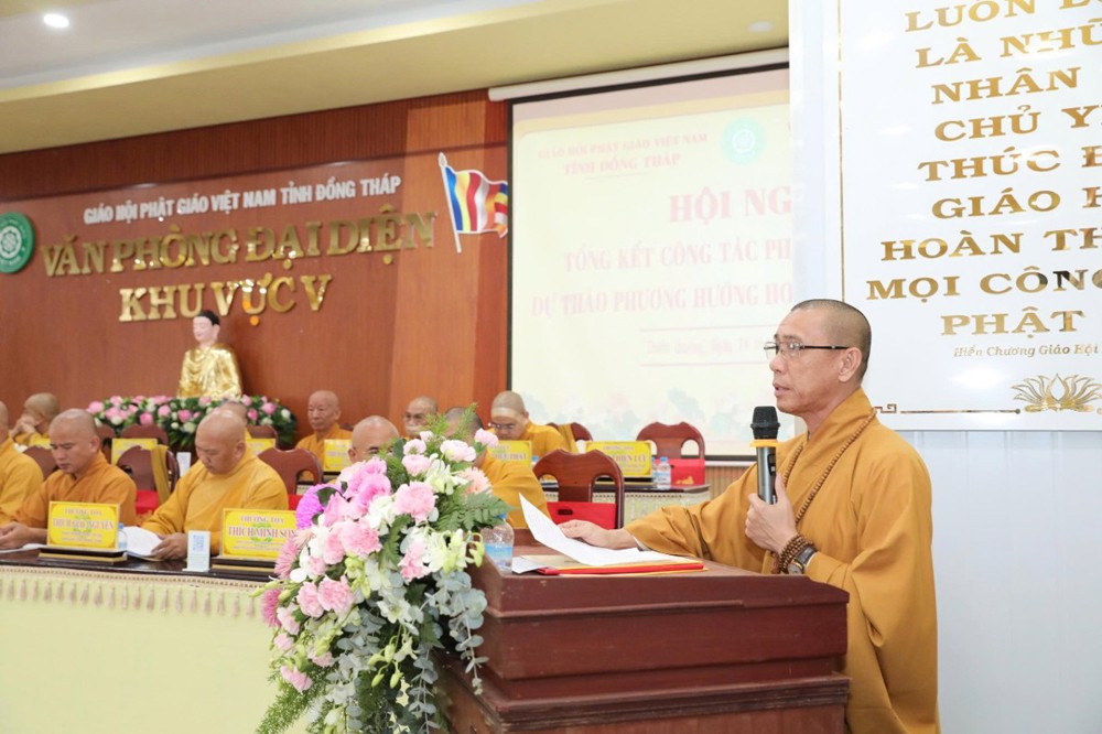 TT. Thích Thiện Lưu – Phó Trưởng Ban Trị sự GHPGVN tỉnh Đồng Tháp, Trưởng Đại diện Phật giáo Khu vực V phát biểu khai mạc hội nghị. Thượng toạ bày tỏ niềm hoan hỷ trước những thành tựu Phật sự đạt được trong năm qua. Thượng tọa nhấn mạnh tinh thần kế thừa – ổn định – phát triển, đề cao sự đồng thuận nội bộ, phát huy vai trò trách nhiệm của Tăng, Ni trong việc thực hiện các chương trình Phật sự gắn liền với đời sống xã hội, đúng theo phương châm “Đạo pháp – Dân tộc – Chủ nghĩa xã hội”.