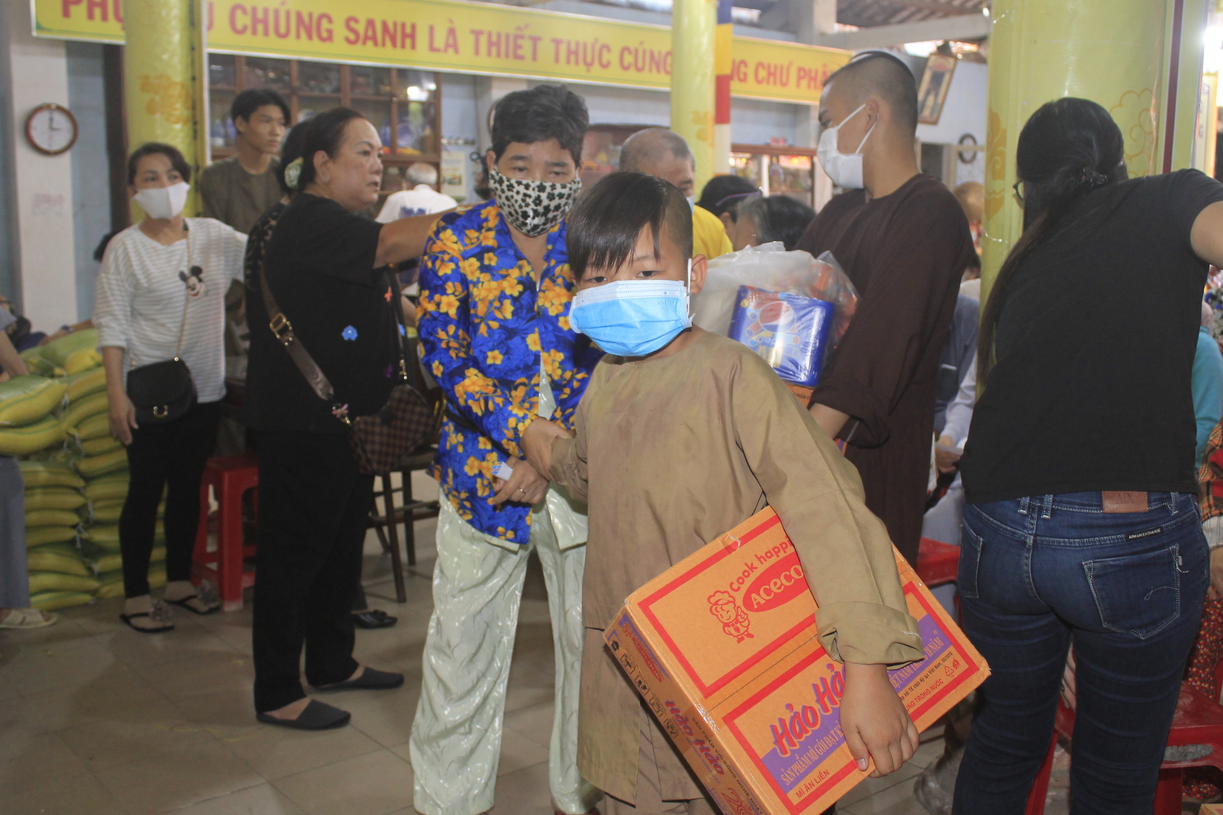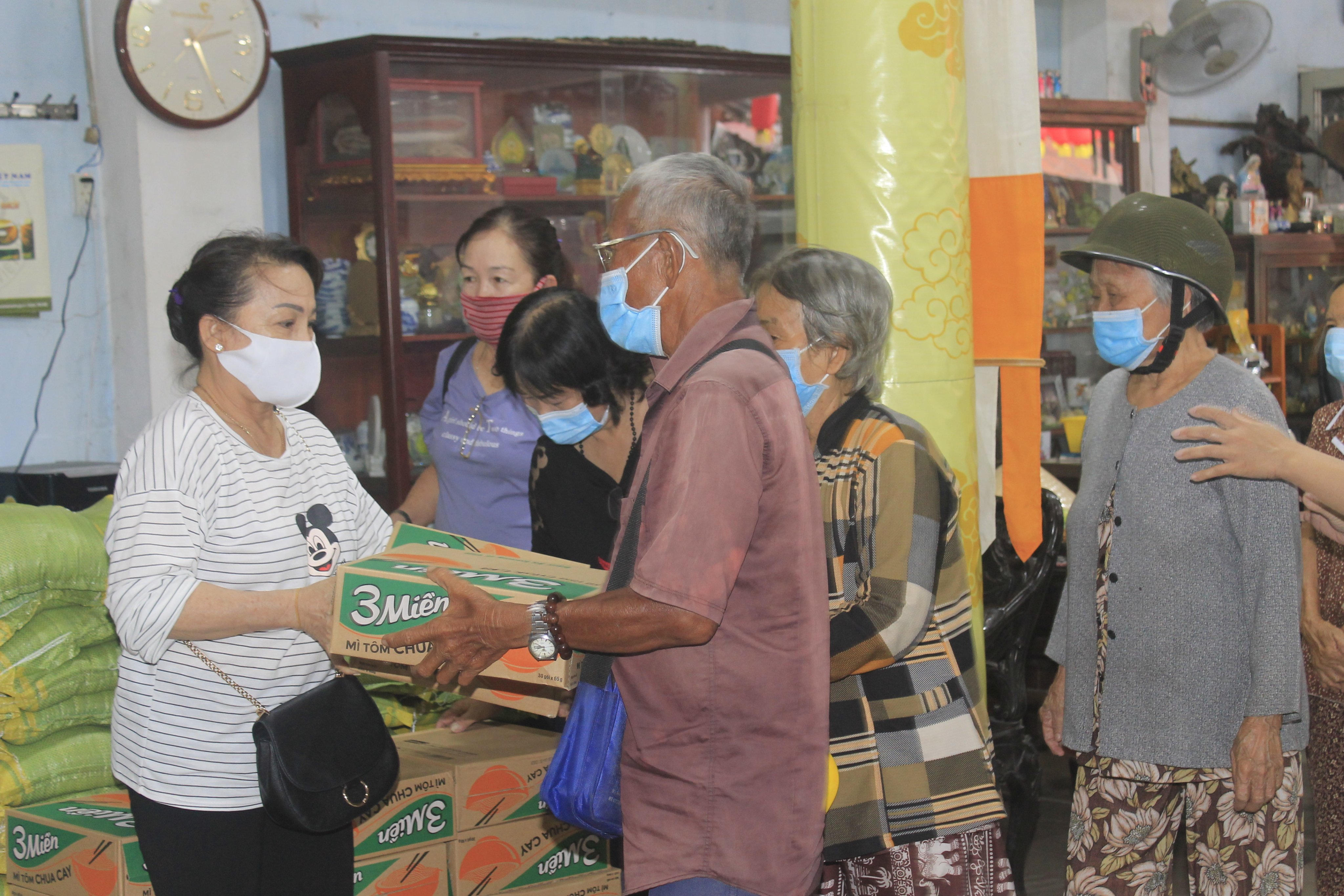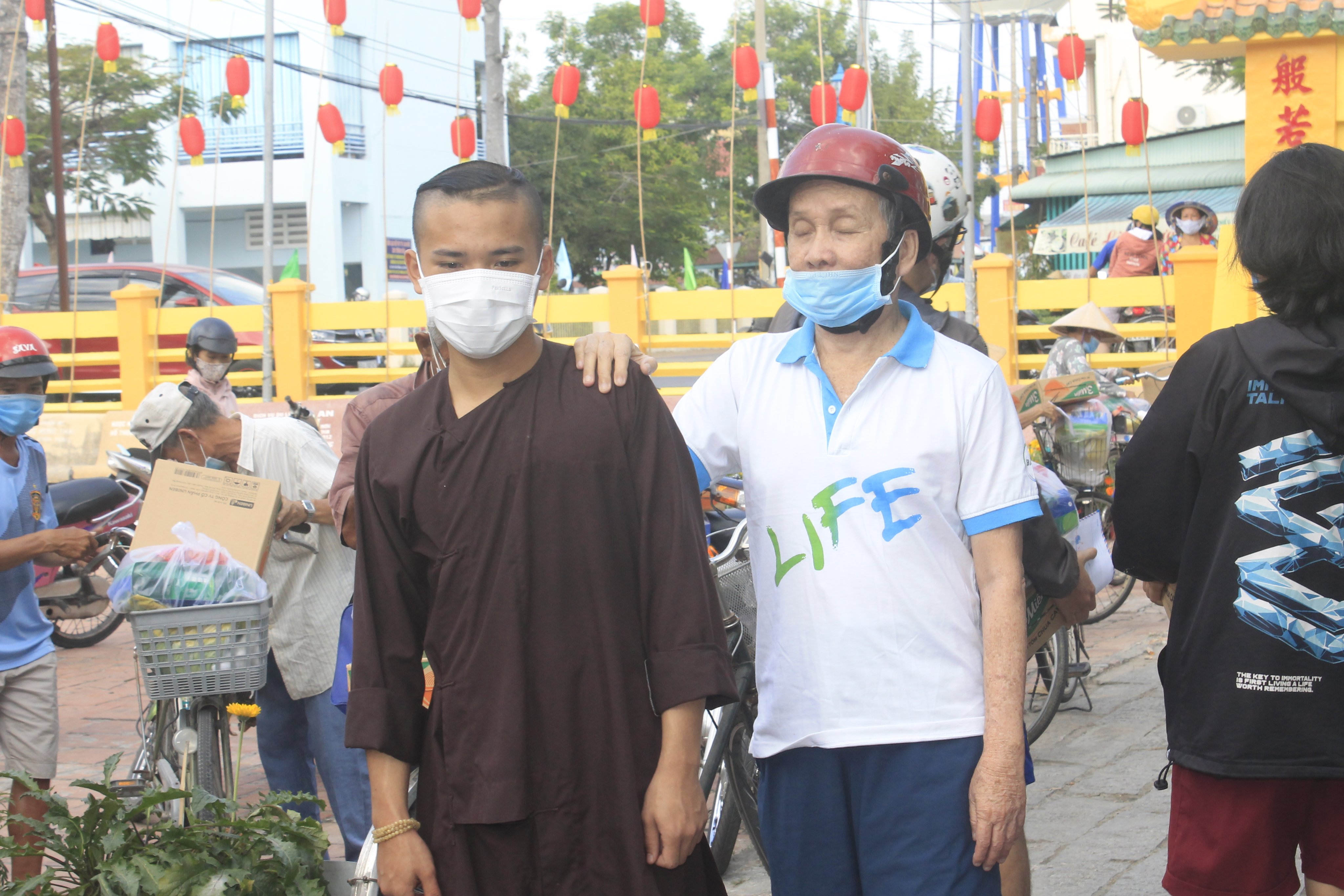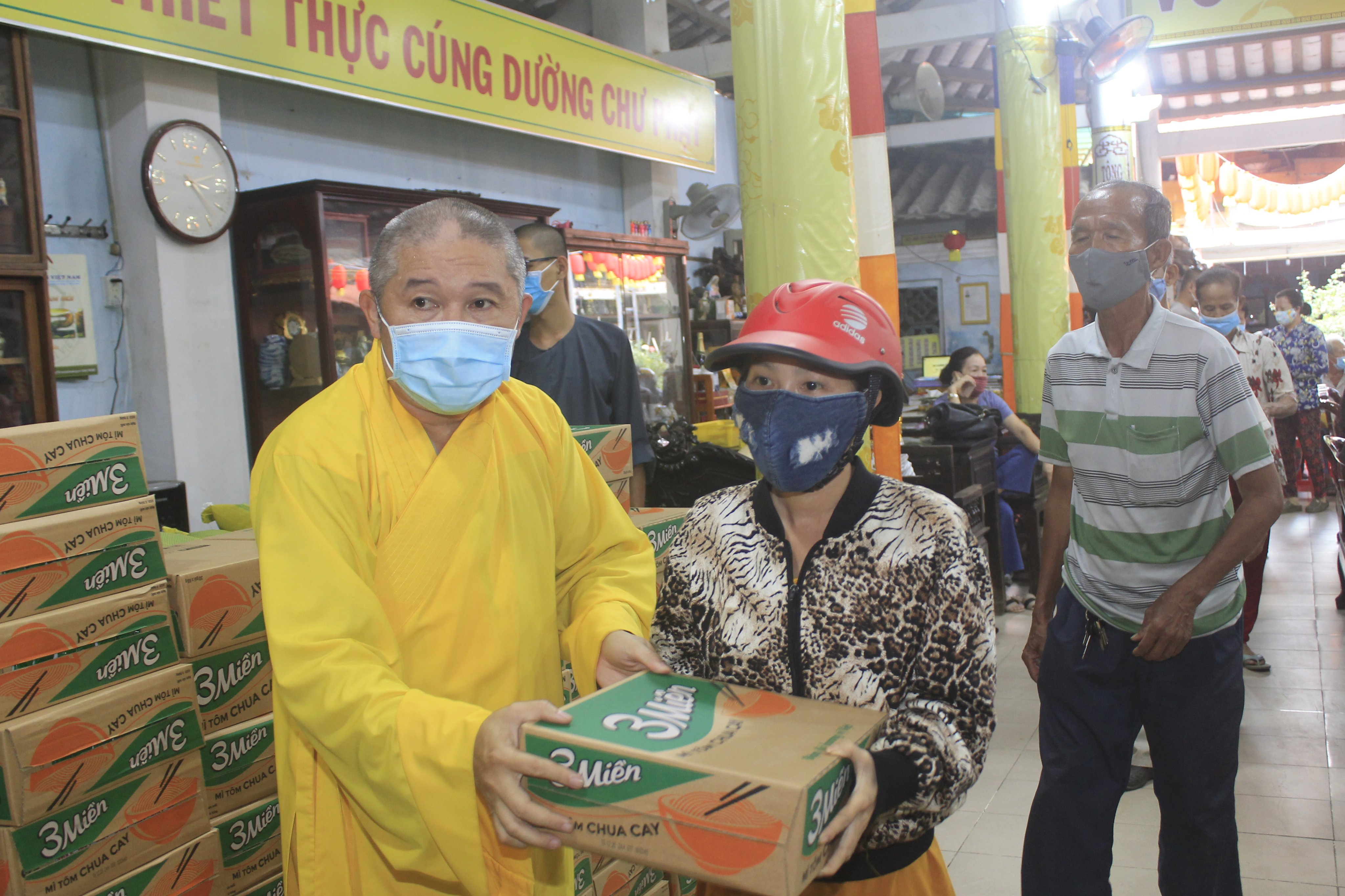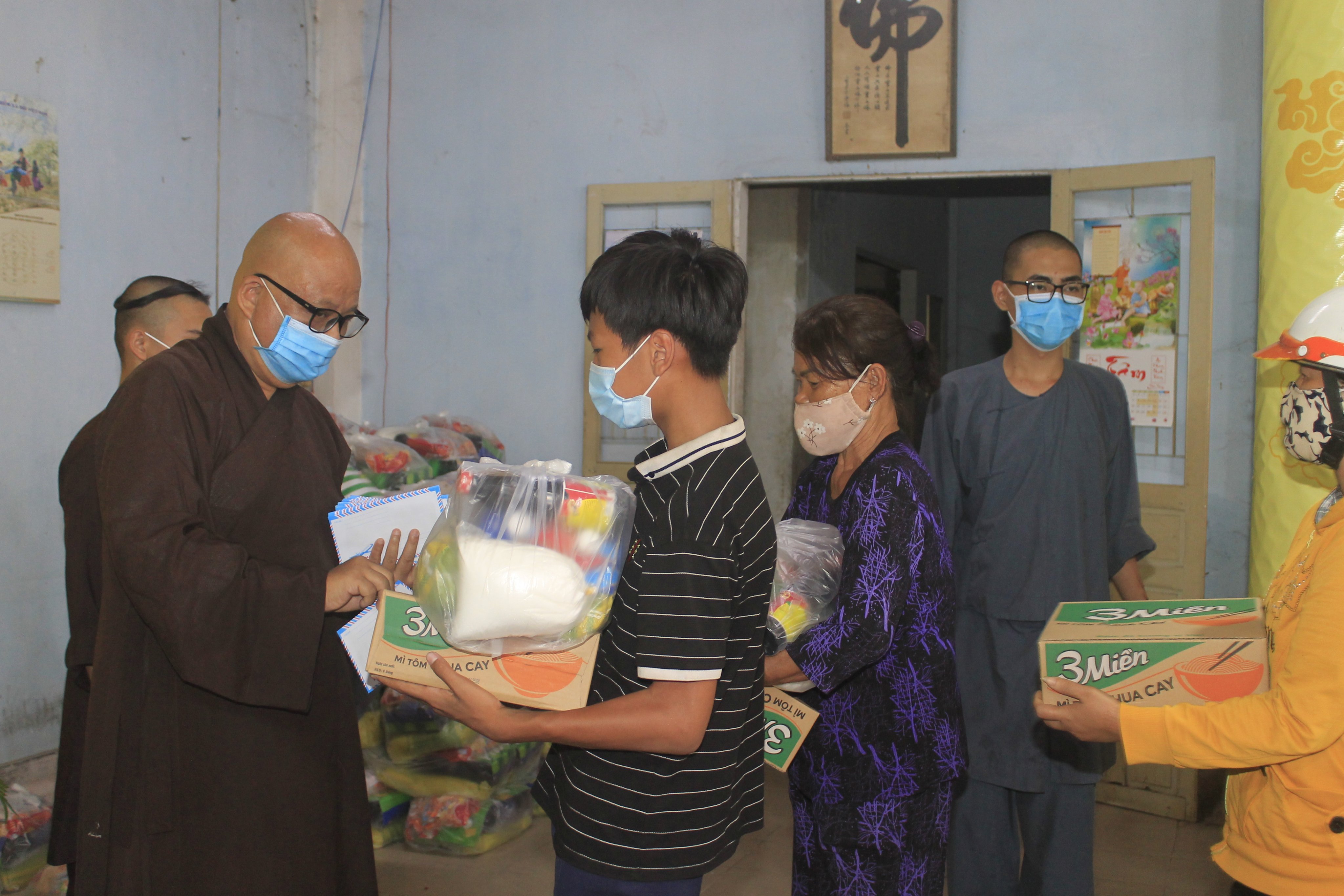 Thượng tọa Thích Chơn Trí - Trưởng ban Trị sự GHPGVN thành phố Sa Đéc, trụ trì chùa Phước Hưng tặng quà Tết cho bà con