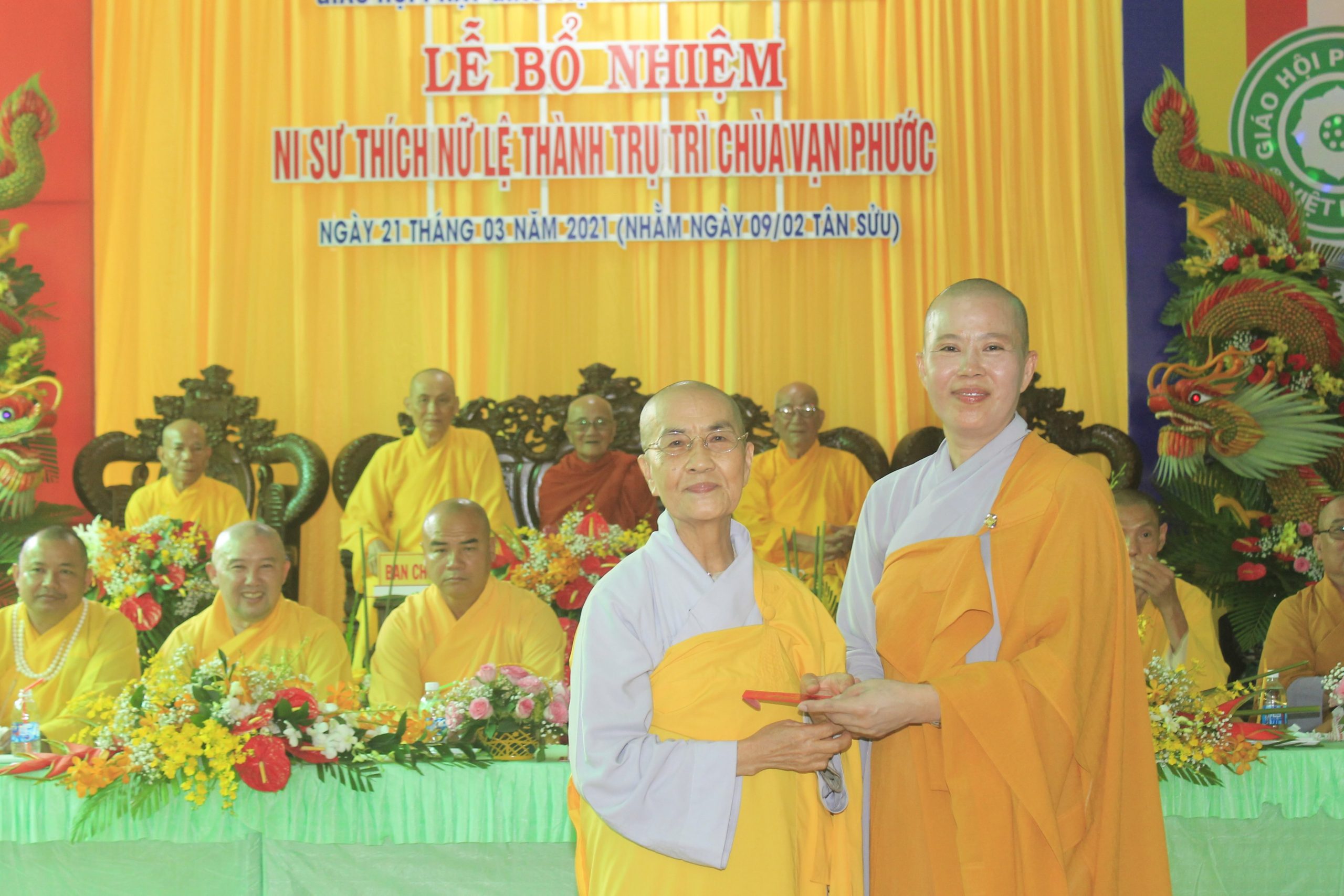 Trong không khí trang nghiêm, Thượng tọa Thích Minh Sơn - Phó Thư ký kiêm Chánh Văn phòng Ban Trị sự PG tỉnh đọc quyết định bổ nhiệm trụ trì cho Ni sư Thích nữ Lệ Thành (thế danh Võ Thị Mến) trụ trì chùa Vạn Phước. Hòa thượng Thích Chơn Minh long trọng trao Quyết định bổ nhiệm trụ trì chùa Vạn Phước cho Ni sư TN. Lệ Thành.