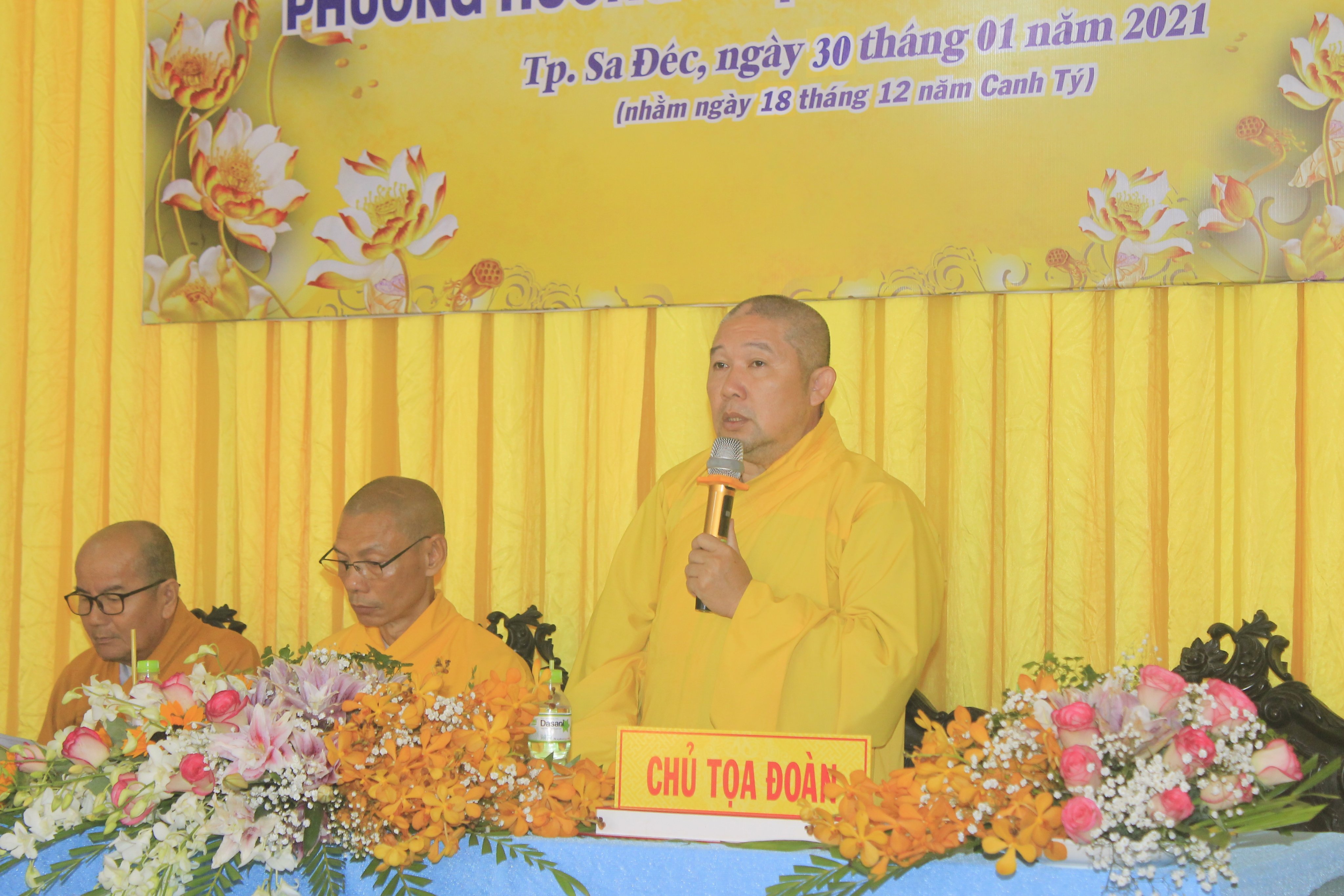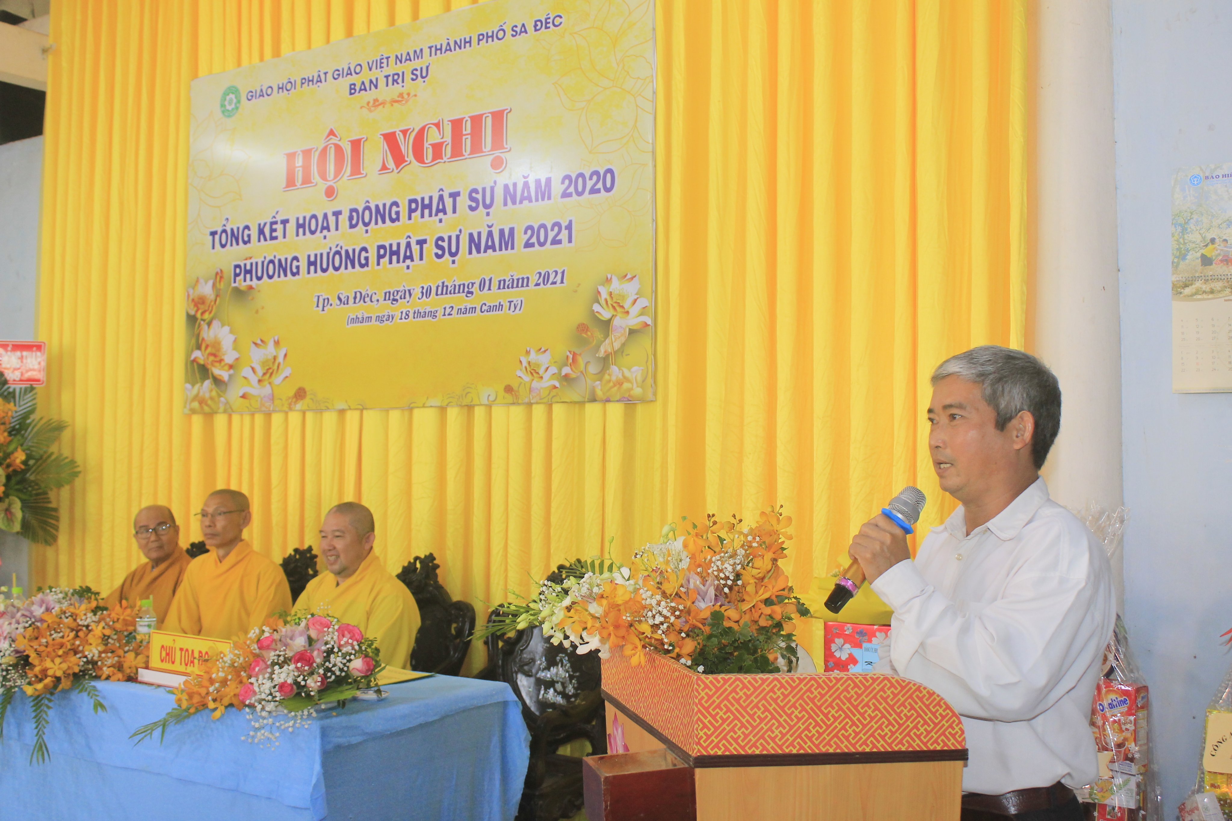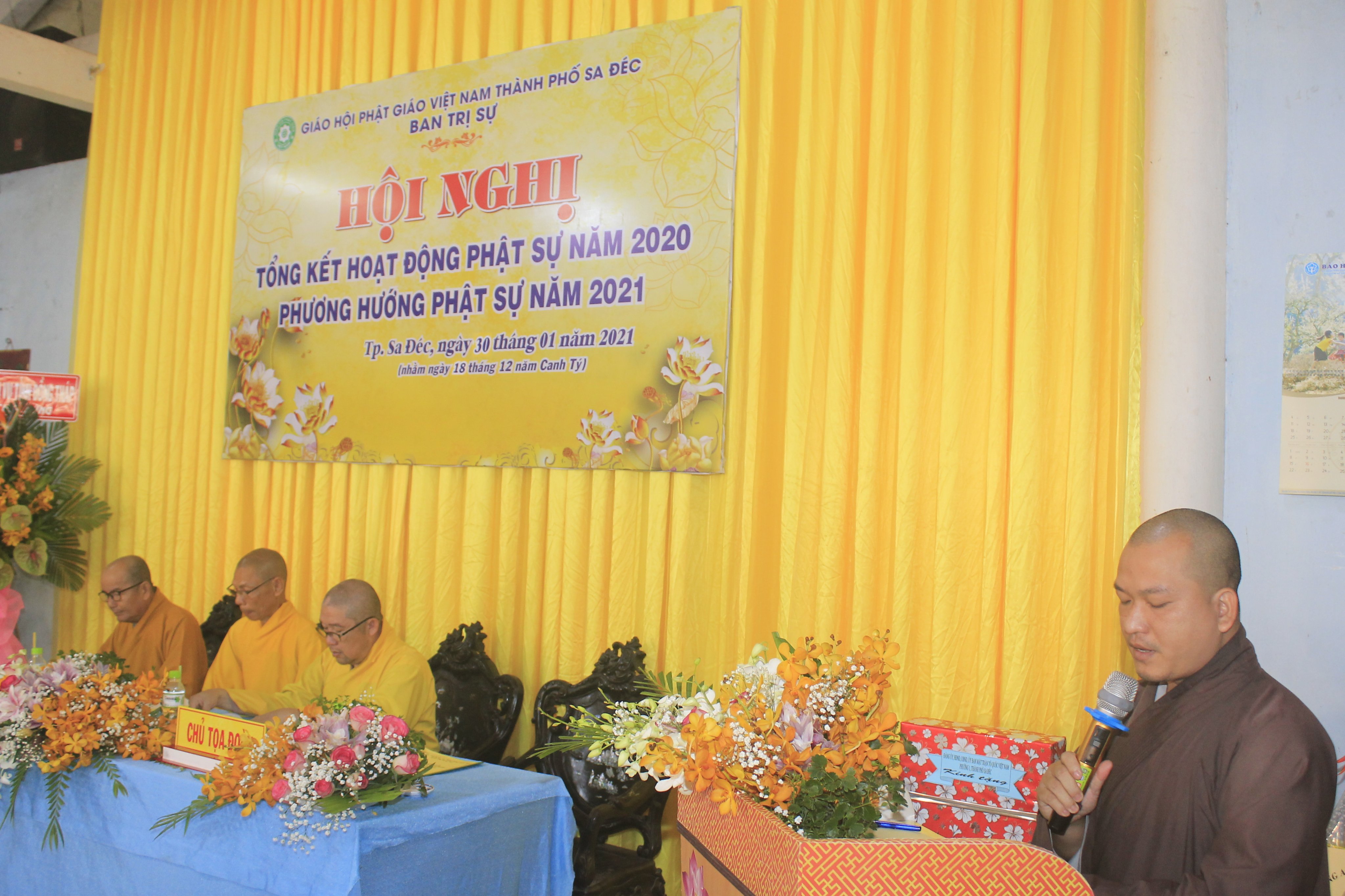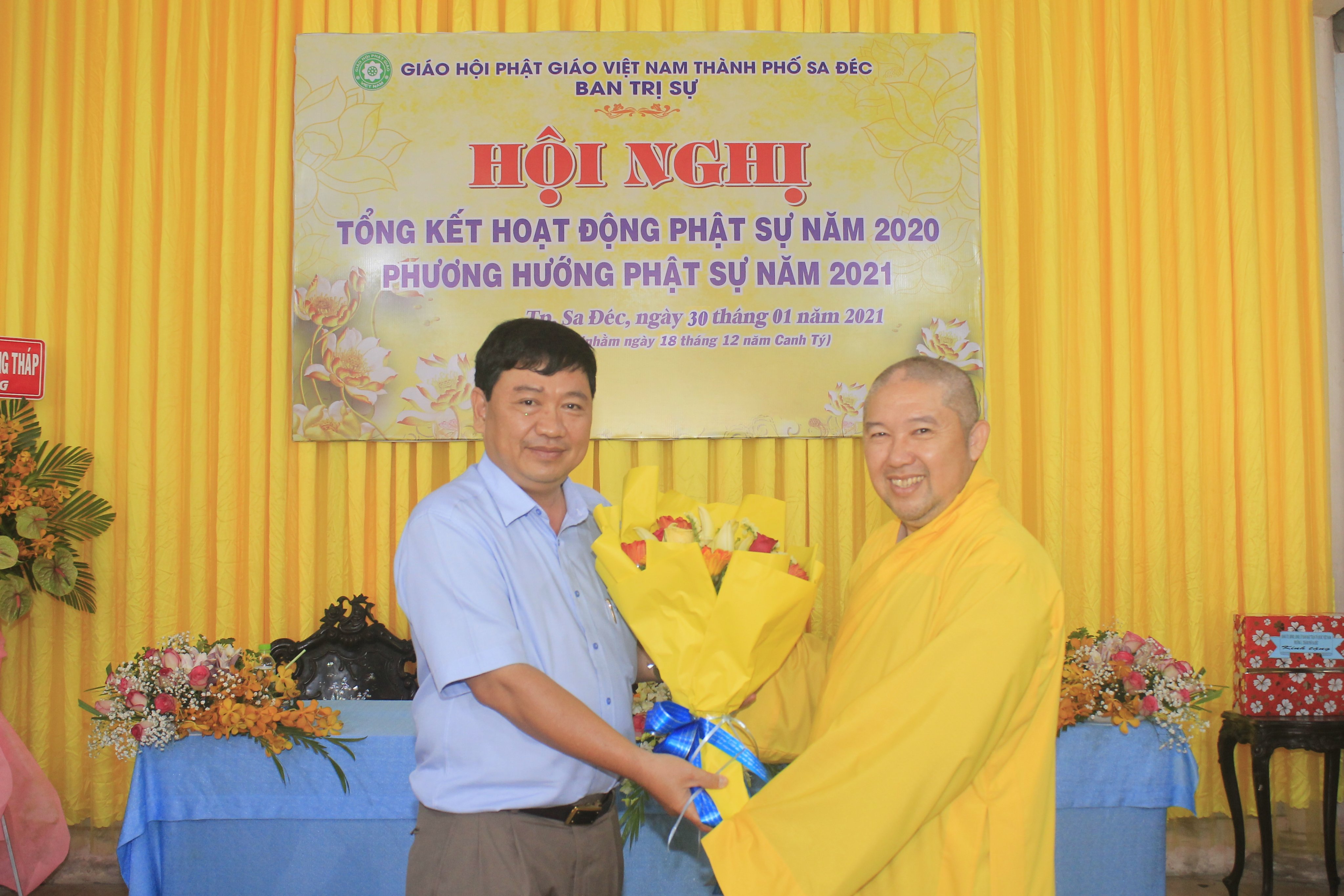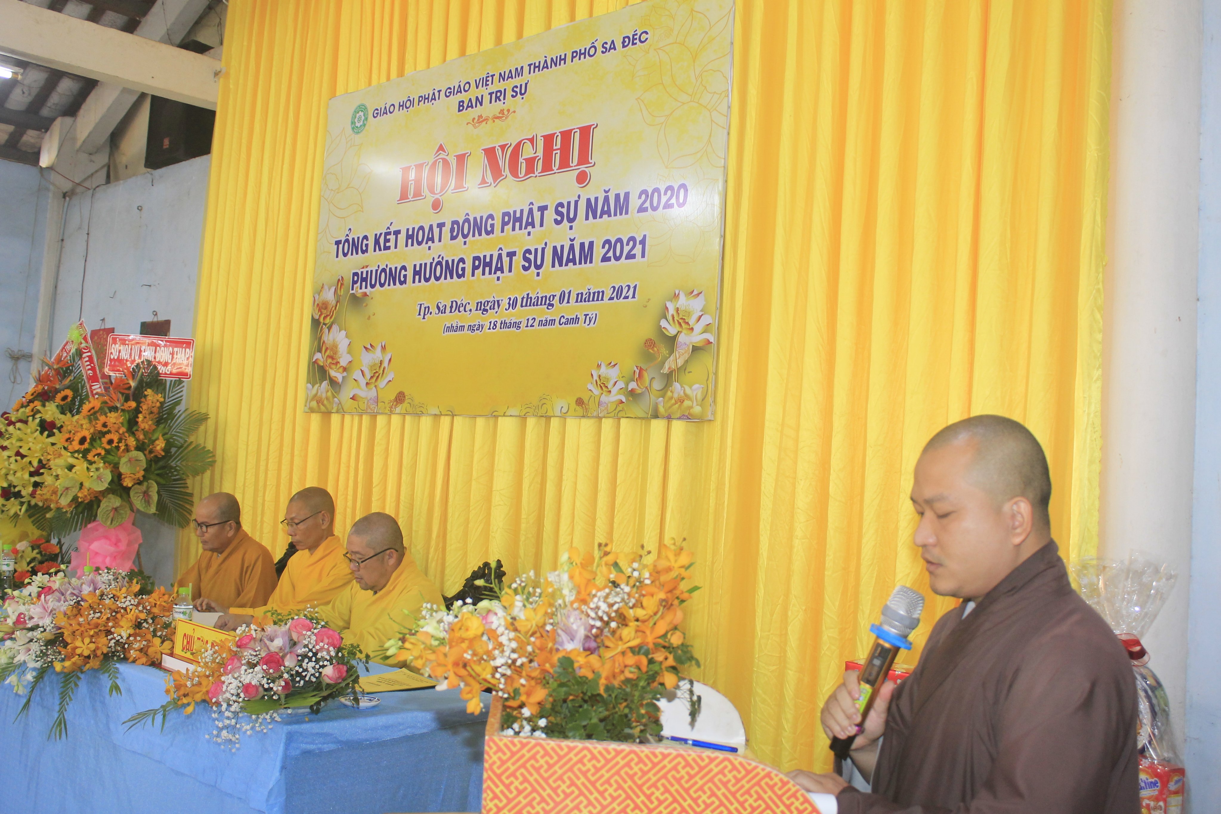 Đại đức Thích Huệ Nghiêm - Chánh Thư ký Ban Trị sự GHPGVN TP.Sa Đéc báo cáo tổng kết công tác Phật sự năm 2020Trong hội nghị, Ban Thư ký cũng đã thông qua công văn của Hội đồng Trị sự GHPGVN về việc tấn phong Giáo phẩm tại Hội nghị kỳ 5 khóa VIII HĐTS cho đơn vị tỉnh Đồng Tháp, trong đó có 4 vị Thượng tọa và 4 vị Ni sư trực thuộc BTS PG thành phố Sa Đéc. Nhân dịp này, TT. Thích Thiện Lâm, thay mặt Ban Thường trực Ban Trị sự tặng hoa chúc mừng đến chư Tôn đức tân giáo phẩm Thượng tọa và Ni sư.