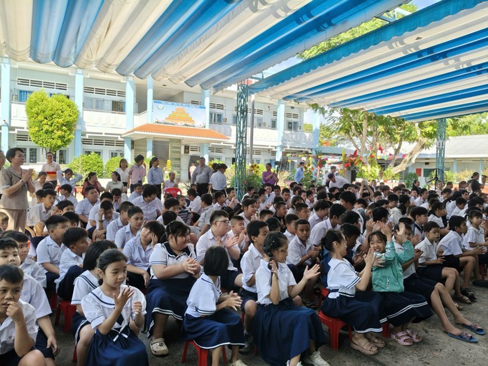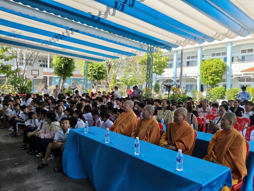 Tiếp đoàn có Ban Giám hiệu cùng toàn thể giáo viên, nhân viên và các em học sinh của nhà trường. Buổi gặp gỡ diễn ra trong không khí trang nghiêm, ấm áp, thể hiện tinh thần từ bi, sẻ chia của người con Phật đối với cộng đồng.