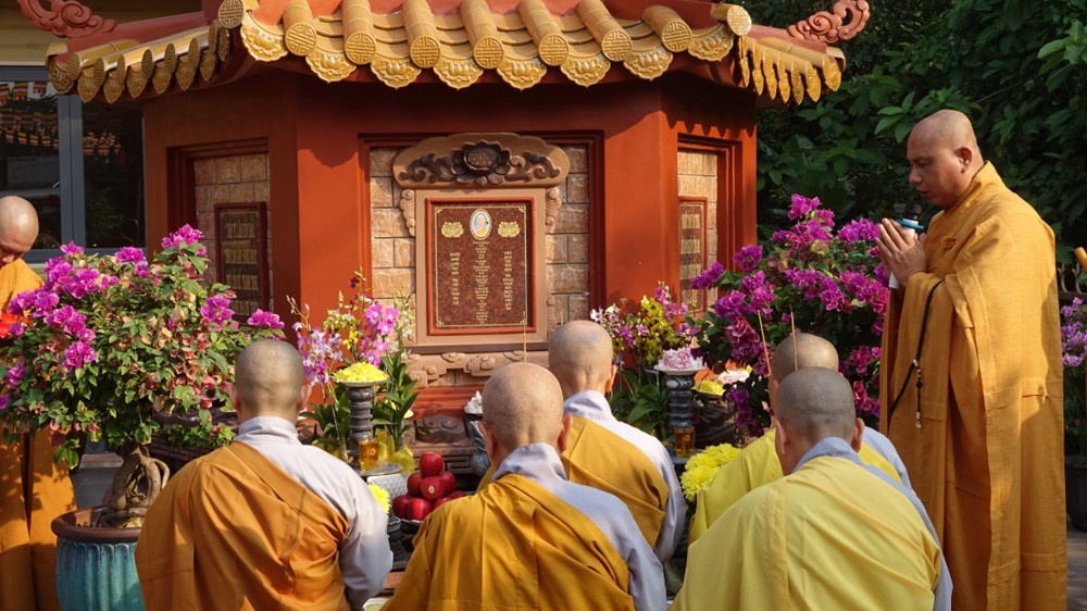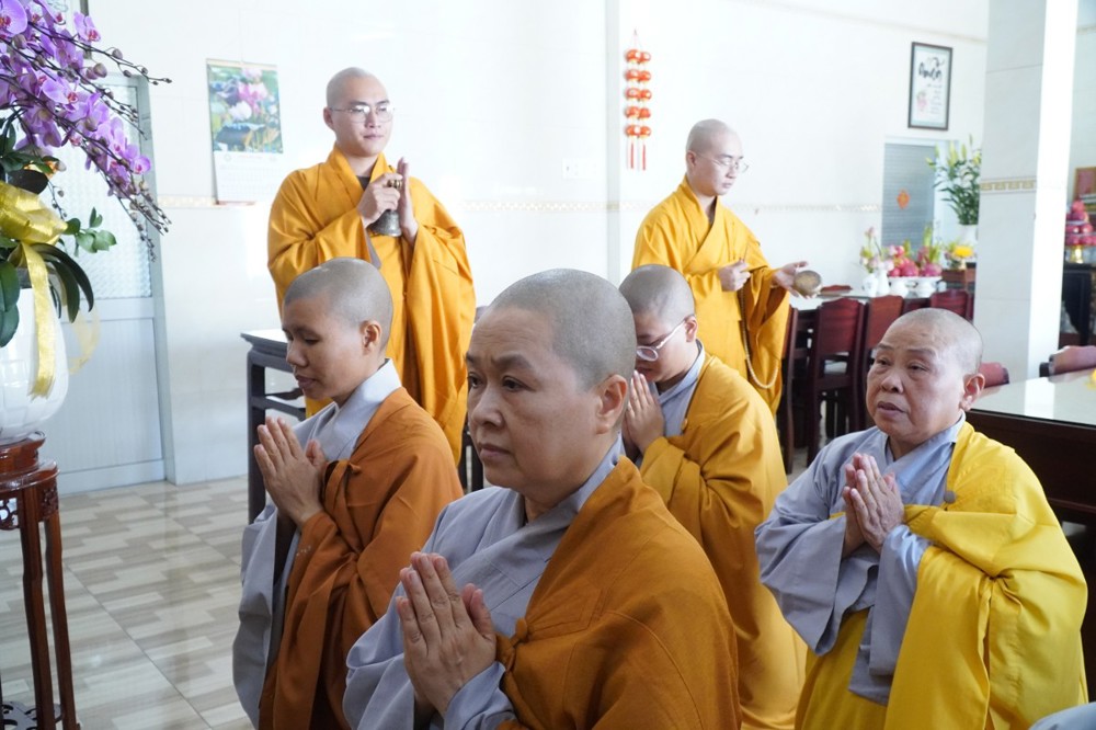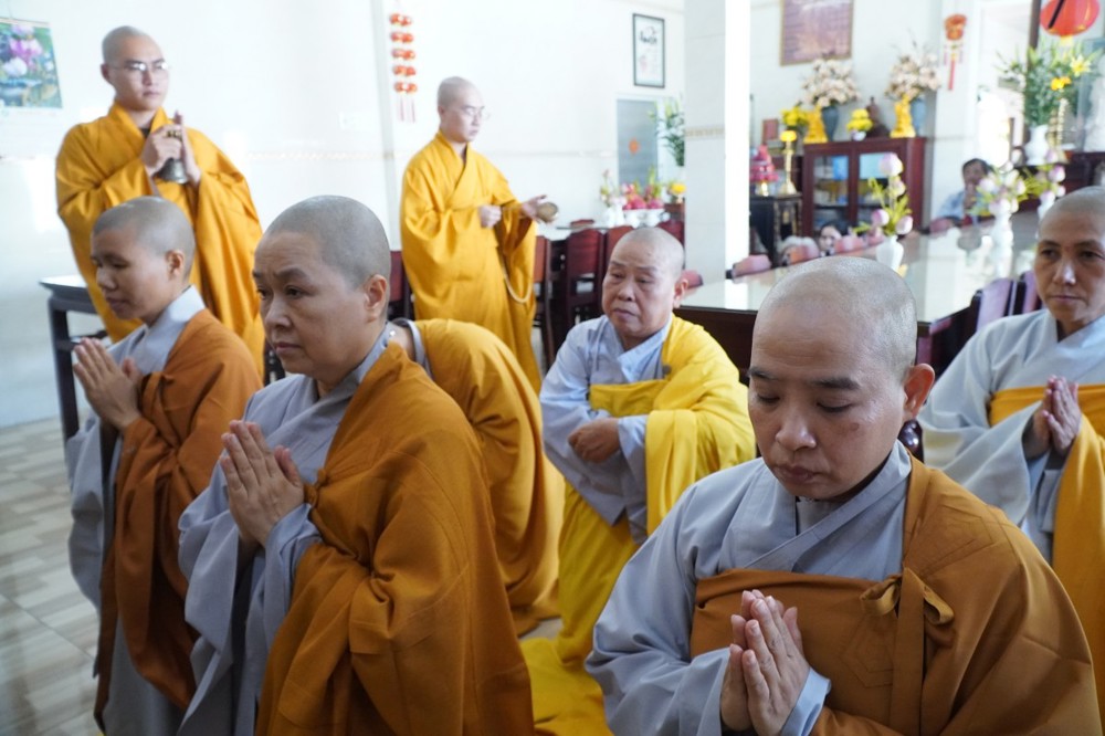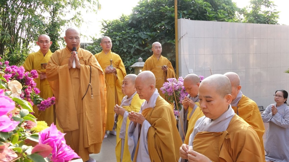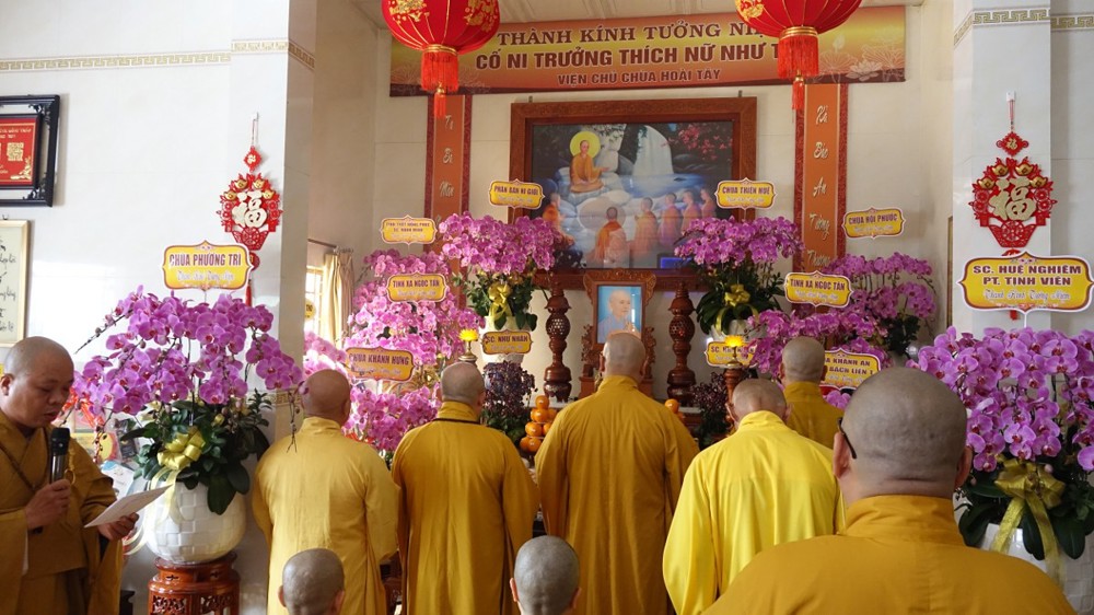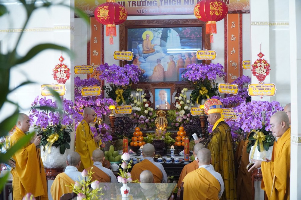 Trong không khí trang nghiêm, thanh tịnh, chư Tôn đức chứng minh đã niêm hương bạch Phật, thực hiện nghi thức sái tịnh và nhiễu tháp báo ân tại khuôn viên bảo tháp Ni trưởng. Tiếp đó, tại Chánh điện và Tổ đường, đại chúng đã đồng thanh trì tụng kinh văn, thực hiện nghi lễ theo nghi thức truyền thống thiền môn.
