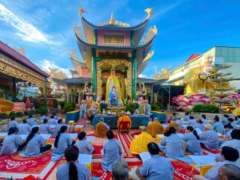 Trước kim thân Đức Quán Thế Âm Bồ Tát, chư Tôn đức và toàn thể đại chúng đã chí thành niêm hương bạch Phật, đảnh lễ Tam Bảo, dâng trọn niềm tôn kính và tâm nguyện hướng về hạnh nguyện từ bi cứu khổ của Ngài. Dưới sự hướng dẫn của Hòa thượng Viện chủ, đại chúng đồng tụng trì Chú Đại Bi và thực hiện Khóa lễ Ngũ Bách Danh – đảnh lễ 500 danh hiệu Đức Quán Thế Âm Bồ Tát. Mỗi danh hiệu là một niệm tưởng tri ân, mỗi lạy xuống là một lần thanh lọc thân tâm, gieo trồng hạt giống từ bi và trí tuệ nơi tự tâm.