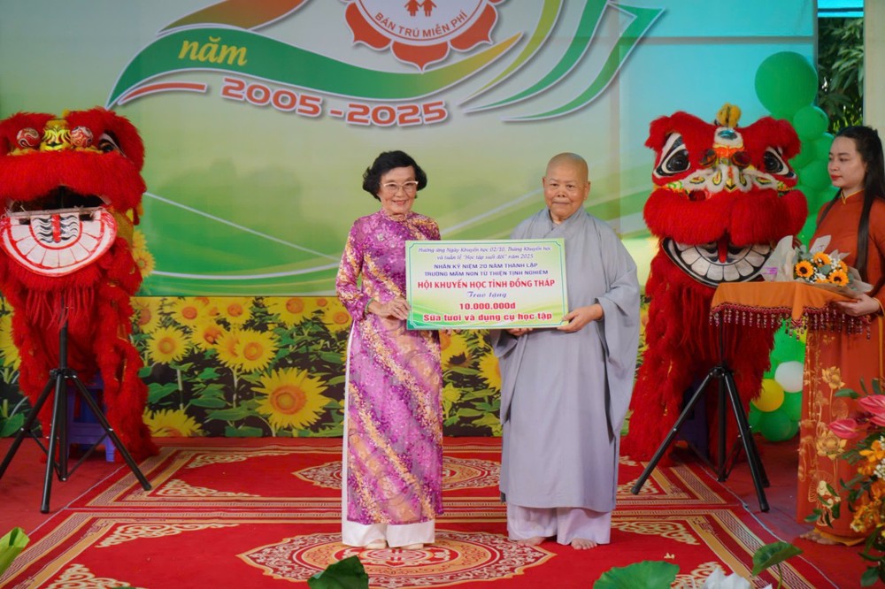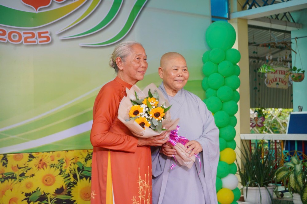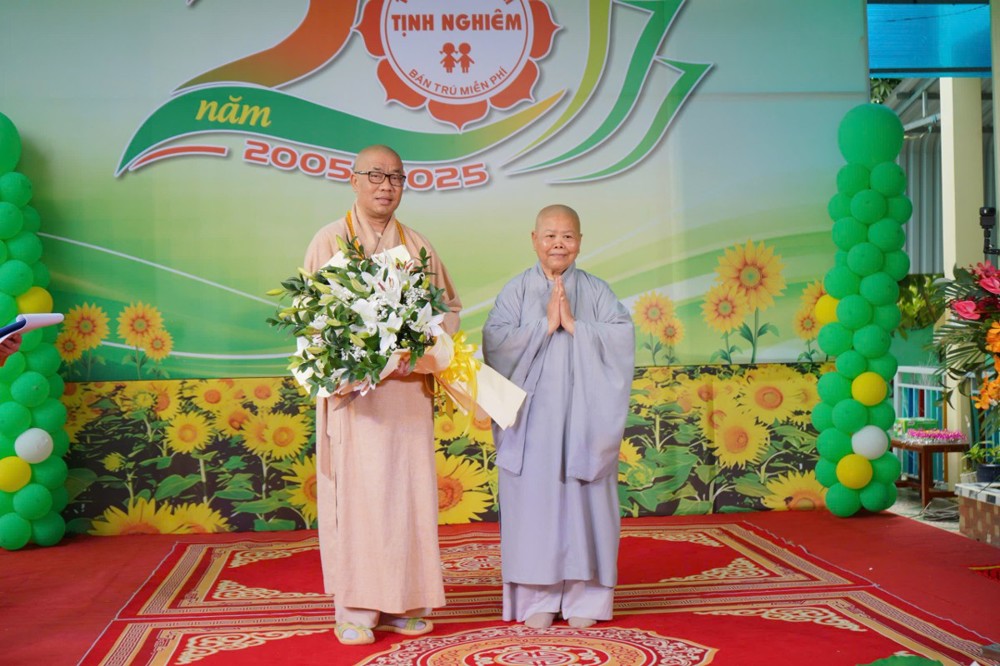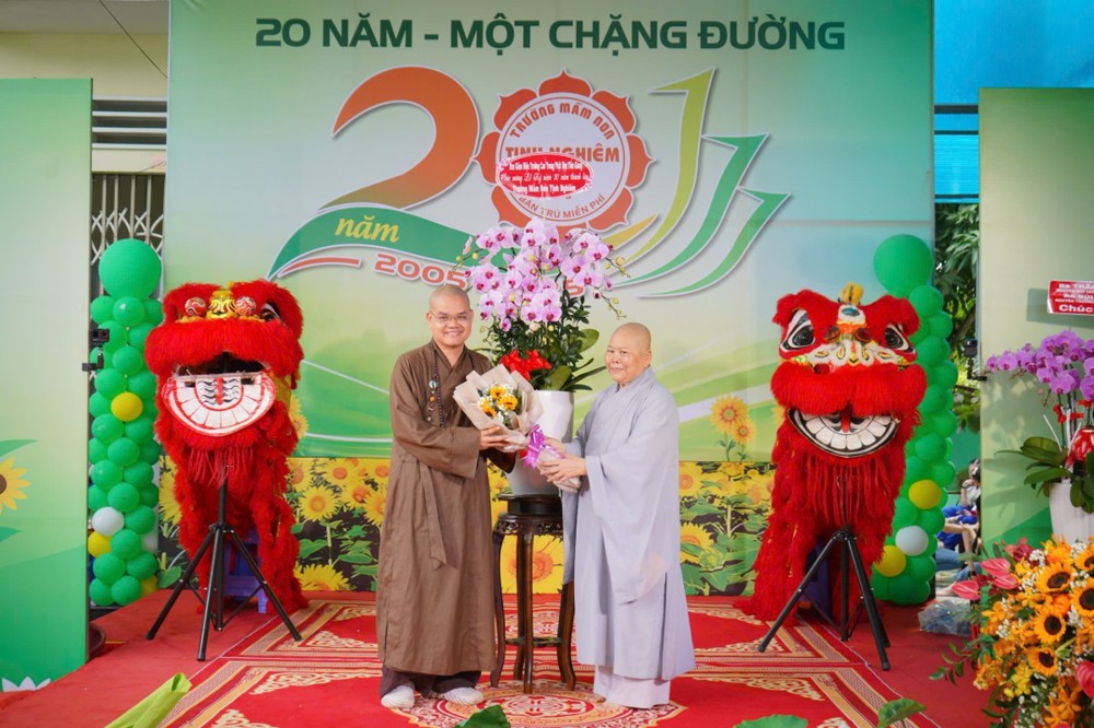 Trong không khí trang trọng và đầy nghĩa tình, Ban Tổ chức cũng đã trao tặng những bó hoa tươi thắm thay cho lời tri ân sâu sắc đến chư Tôn đức, Quý vị lãnh đạo Trung ương và địa phương, Quý mạnh thường quân, cùng Tập thể Ban Giám hiệu, giáo viên và nhân viên nhà trường – những người đã cống hiến và đồng hành trong suốt hành trình hai mươi năm qua.