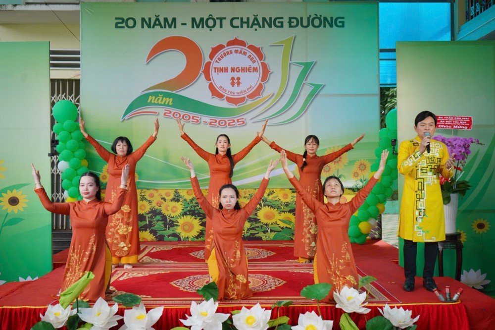 Phần biểu diễn nghệ thuật được xem là “trái tim” của buổi lễ. Thông qua những ca khúc, hoạt cảnh, tập thể giáo viên, học sinh và Phật tử đã tái hiện sinh động hành trình hai mươi năm vun trồng trí tuệ và tình thương. Mỗi giai điệu, mỗi điệu múa như khắc họa từng trang ký ức thiêng liêng – từ ngày trường mới dựng lên cho đến hiện tại rạng rỡ hôm nay.