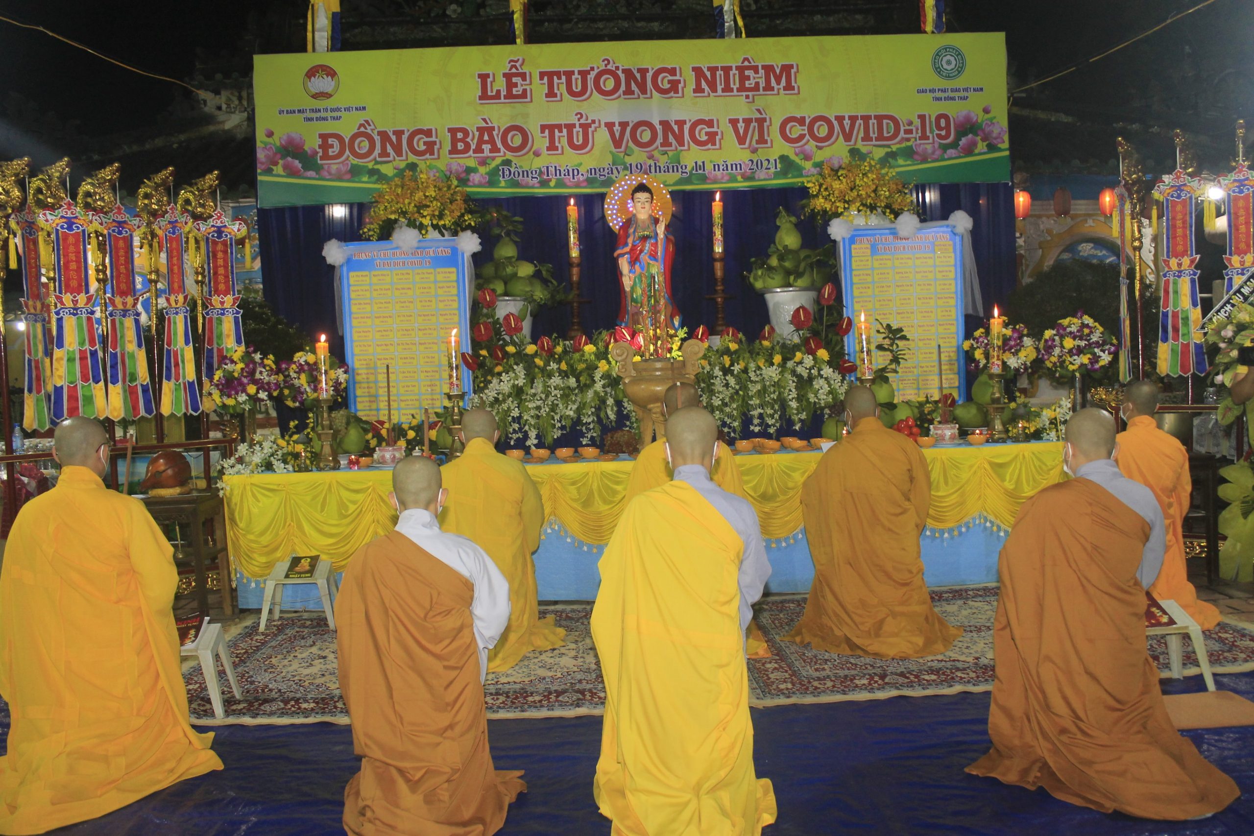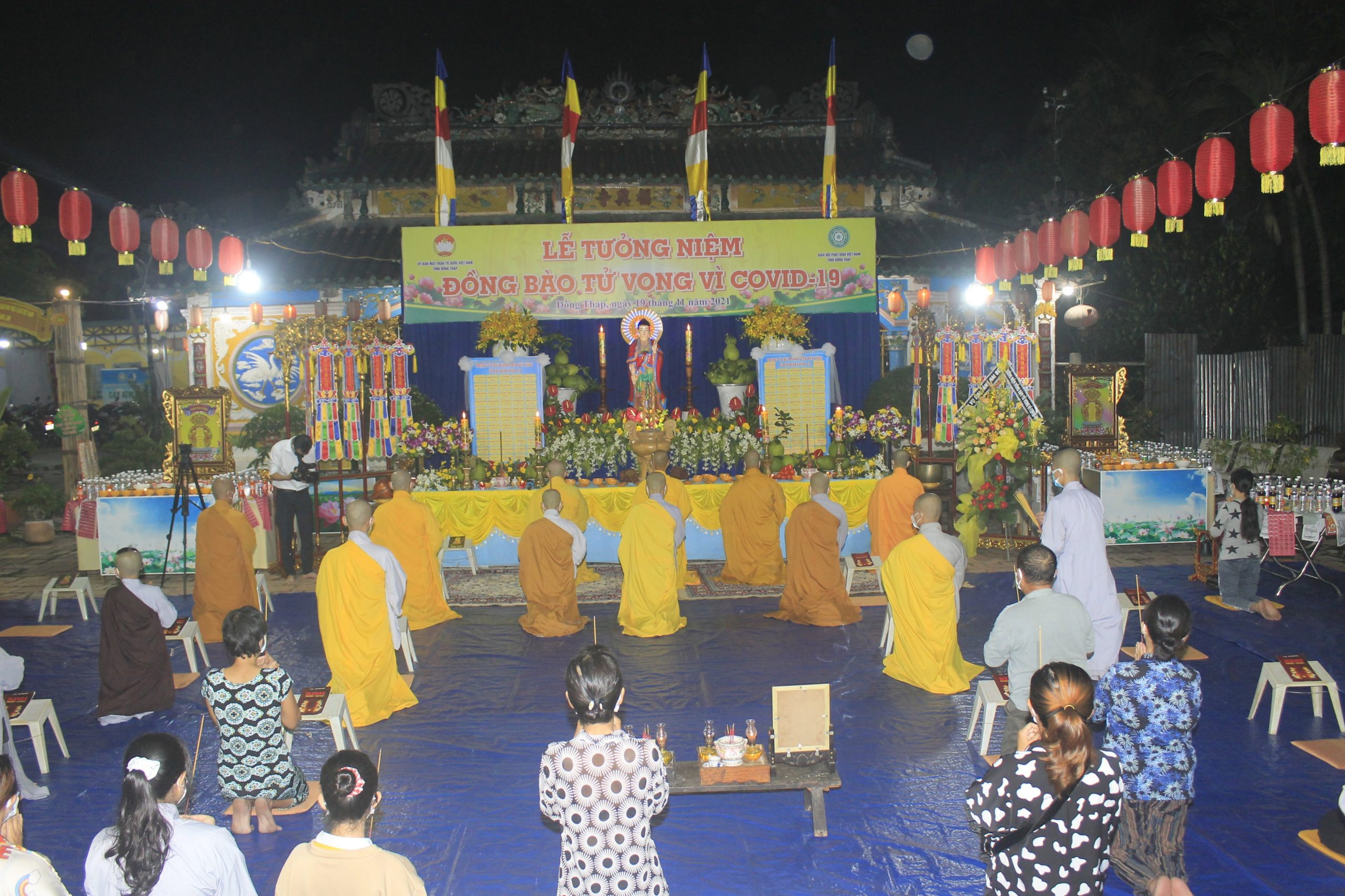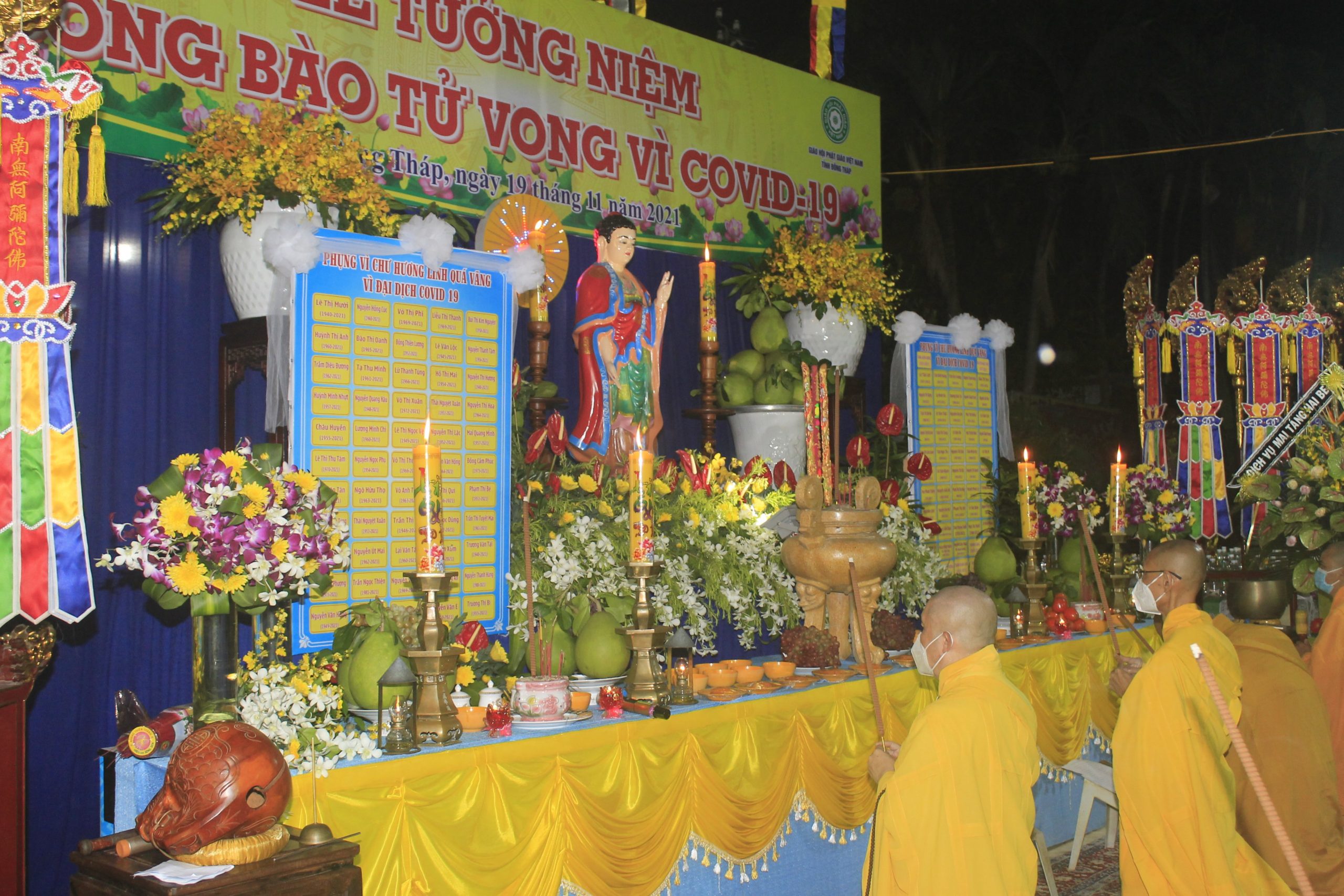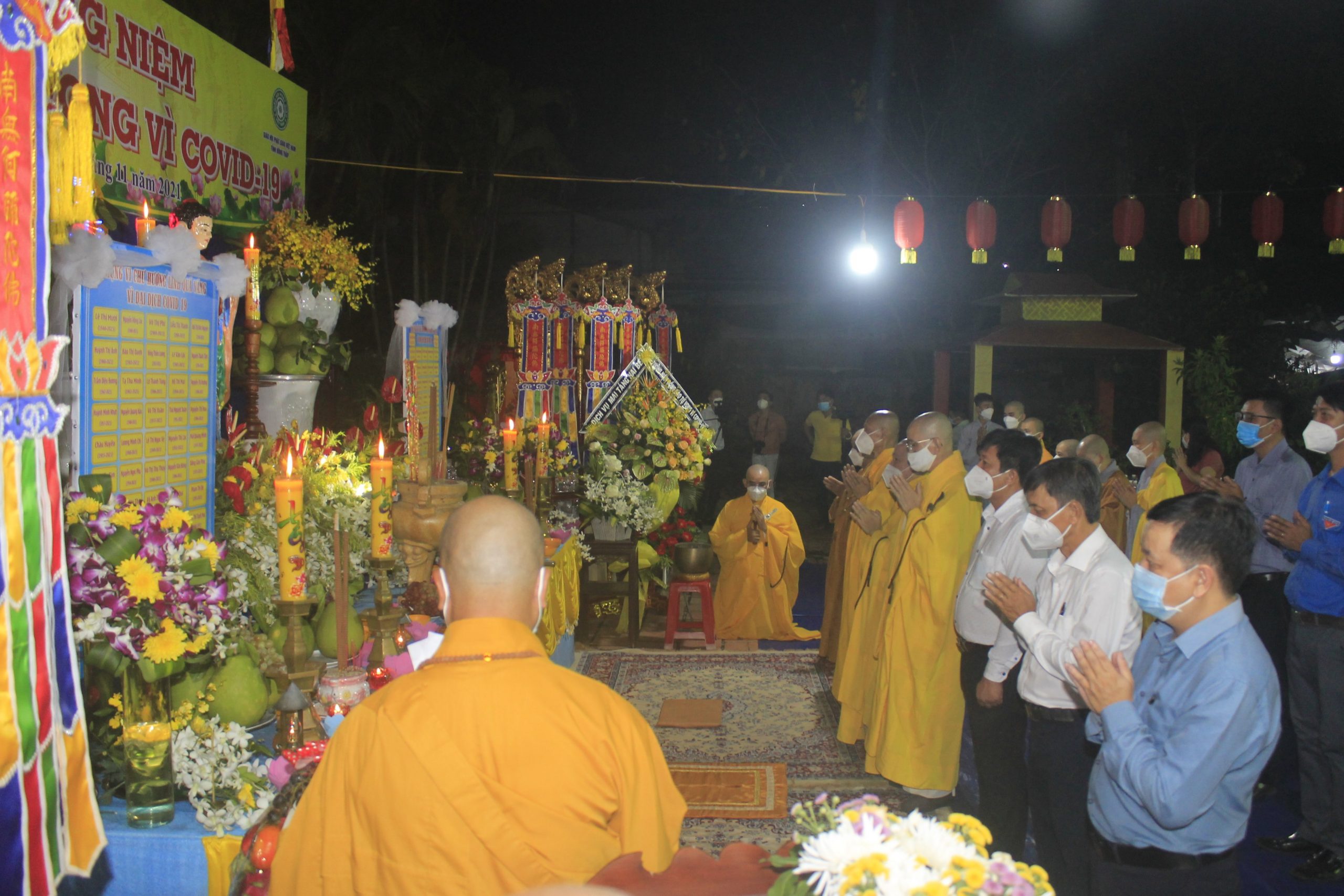 Thực hiện thông bạch của Hòa thượng Thích Thiện Nhơn - Chủ Tịch HĐTS GHPGVN. Đúng 20h00’, chính thức buổi tưởng niệm và cầu siêu cho nạn nhân tử vong vì dịch bệnh Covid-19. Theo đó, chư Tôn Giáo phẩm cùng đại diện lãnh đạo chánh quyền đối trước áng thờ thực hiện nghi lễ niêm hương, cầu siêu tưởng niệm trước bàn thờ Phật A Di Đà. Tất cả chư Tăng, Phật tử đã thắp 112 ngọn nến đèn sen và dành một phút mặc niệm tưởng nhớ những nạn nhân đã qua đời vì đại dịch.