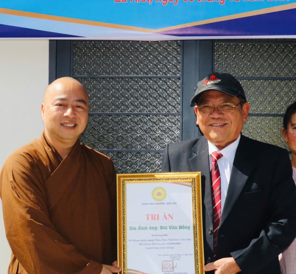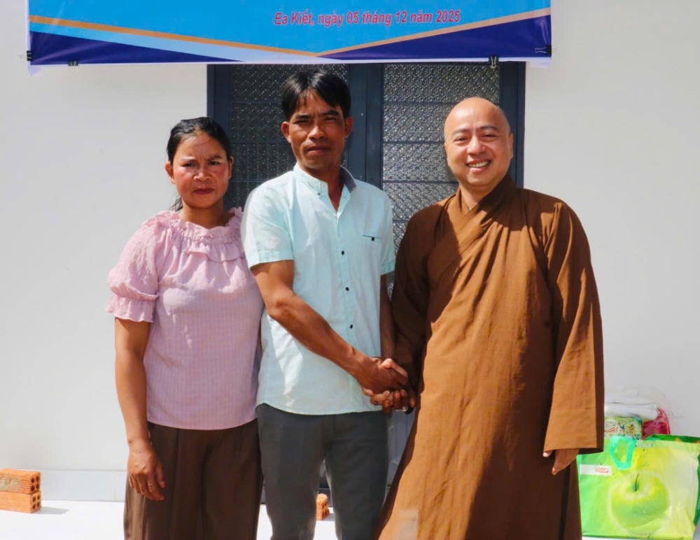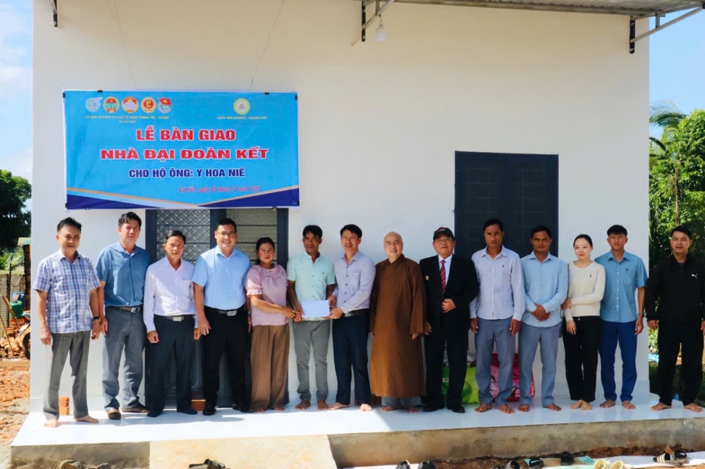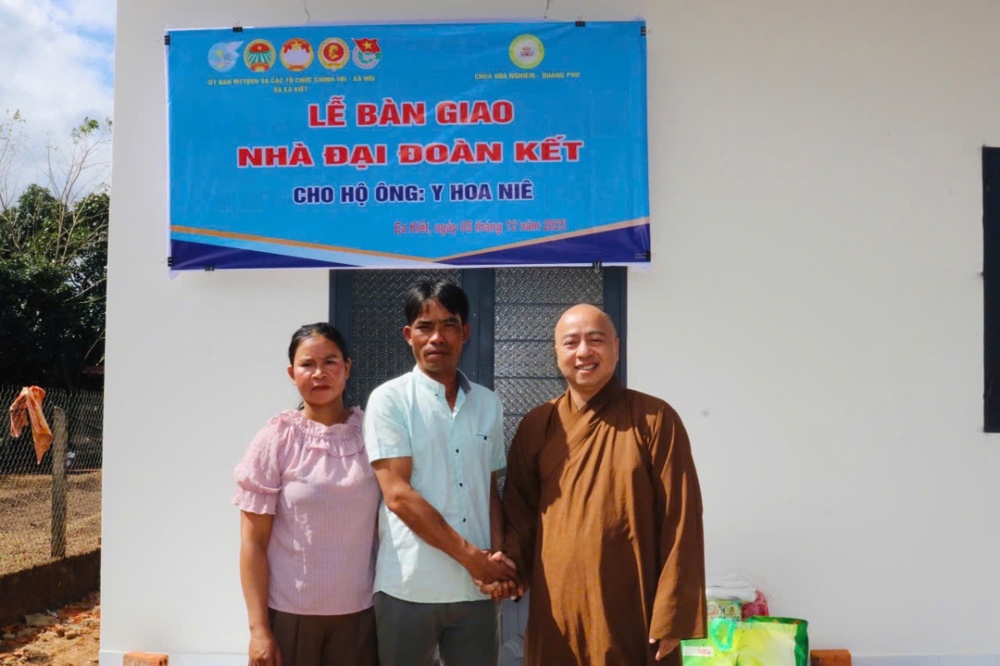 Sau hơn một tháng khẩn trương xây dựng, sáng nay, ngày 05/12/2025, Chùa Hoa Nghiêm đã phối hợp cùng Đảng ủy, Chính quyền, MTTQ xã Ea Kiết, và Bí thư Chi bộ trường Trần Quang Diệu long trọng tổ chức lễ bàn giao căn Nhà Đại Đoàn Kết.