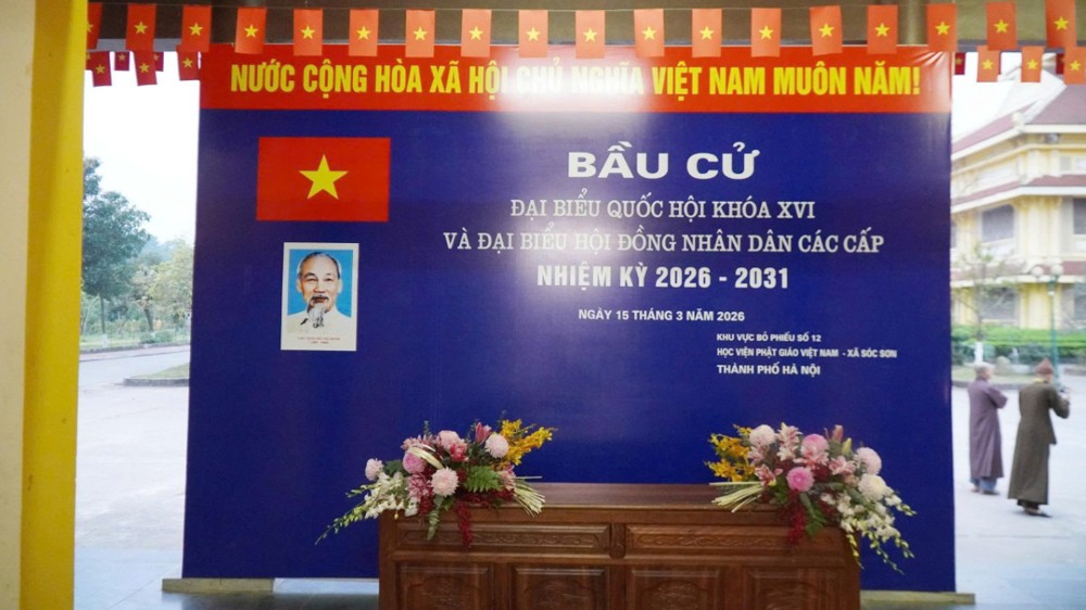 Tham dự lễ khai mạc cuộc bầu cử đại biểu Quốc hội khóa XVI và đại biểu HĐND các cấp, nhiệm kỳ 2026-2031 tại khu vực bỏ phiếu số 12 – xã Sóc Sơn, được đặt tại Học viện có: Hòa thượng Thích Thanh Đạt, Chủ tịch HĐKH Học viện; Hòa thượng Thích Thanh Quyết, Phó Chủ tịch Hội đồng Trị sự GHPGVN, Trưởng ban Giáo dục Phật giáo TƯ, Viện trưởng Học viện, đại diện lãnh đạo xã Sóc Sơn.