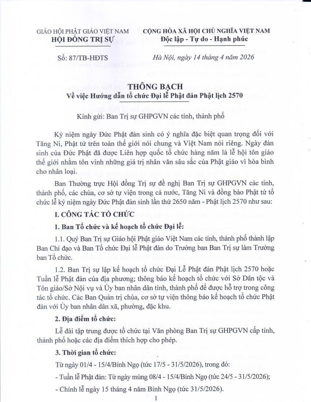 PSO - Hướng tới Đại lễ Phật đản Phật lịch 2570 - Dương lịch 2026, ngày 14/4, Trưởng lão Hòa thượng Thích Thiện Nhơn, Phó Pháp chủ HĐCM, Chủ tịch HĐTS GHPGVN ấn ký ban hành Thông bạch số 87/TB-HĐTS gửi đến Ban Trị sự GHPGVN các tỉnh, thành phố hướng dẫn tổ chức Đại lễ.