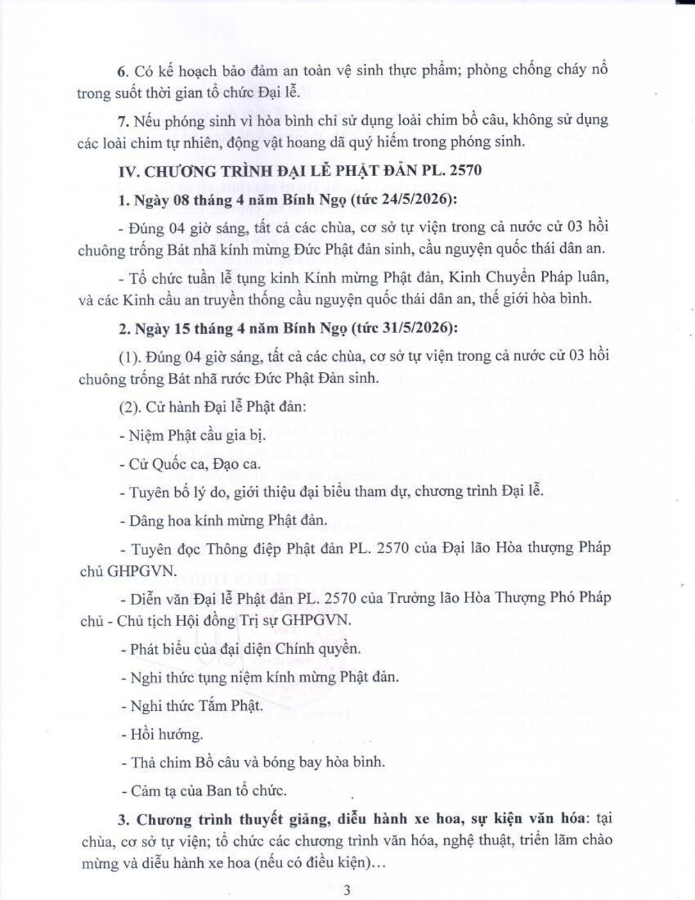 3. Treo cờ, phan, phướn, lồng đèn, thiết lập vườn Lâm Tỳ Ni, biểu ngữ Kính mừng Phật đản… tại Văn phòng Ban Trị sự GHPGVN cấp tỉnh, thành phố, các cơ sở tự viện của Giáo hội Phật giáo Việt Nam và tại tư gia Phật tử. Các Ban Trị sự, các chùa, cơ sở tự viện nếu có điều kiện thì tổ chức diễu hành xe hoa.
