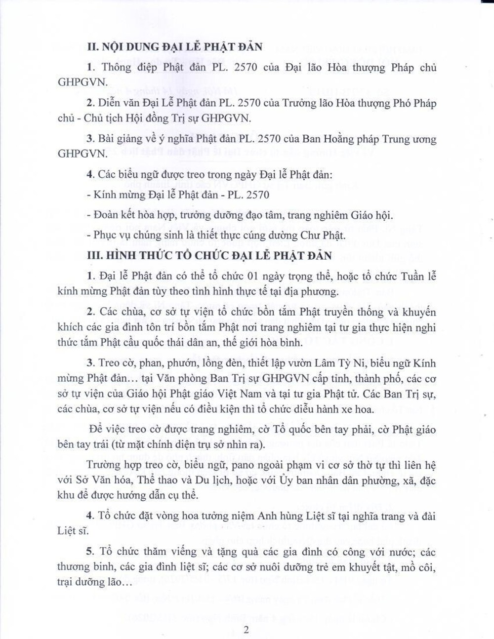 Ban Thường trực Hội đồng Trị sự đề nghị Ban Trị sự GHPGVN các tỉnh, thành phố, các chùa, cơ sở tự viện trong cả nước, Tăng Ni và đồng bào Phật tử tổ chức lễ kỷ niệm ngày Đức Phật đản sinh lần thứ 2650 năm - Phật lịch 2570 như sau: