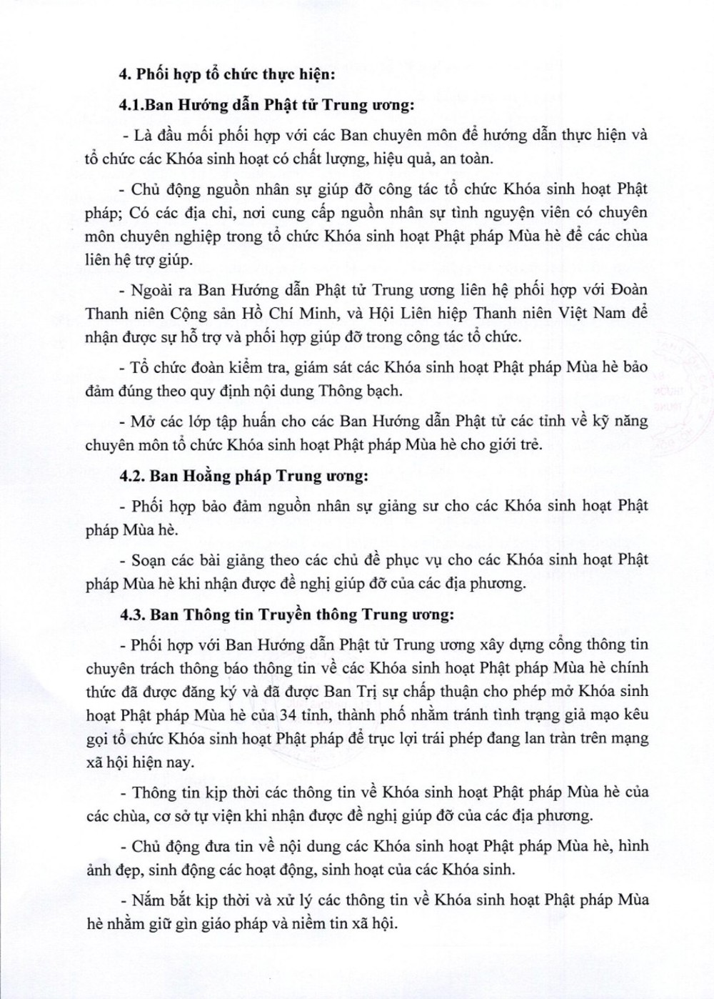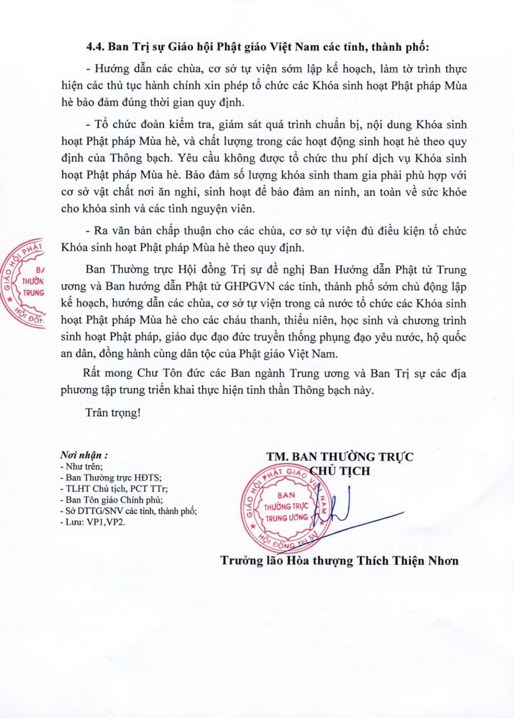 Thông bạch cũng nêu rõ trách nhiệm của các Ban chuyên môn Trung ương và Ban Trị sự địa phương trong việc hướng dẫn, kiểm tra, giám sát, bảo đảm các khóa sinh hoạt diễn ra đúng quy định, an toàn, hiệu quả; đồng thời yêu cầu không tổ chức thu phí và ngăn chặn các hiện tượng lợi dụng danh nghĩa Phật giáo để trục lợi.