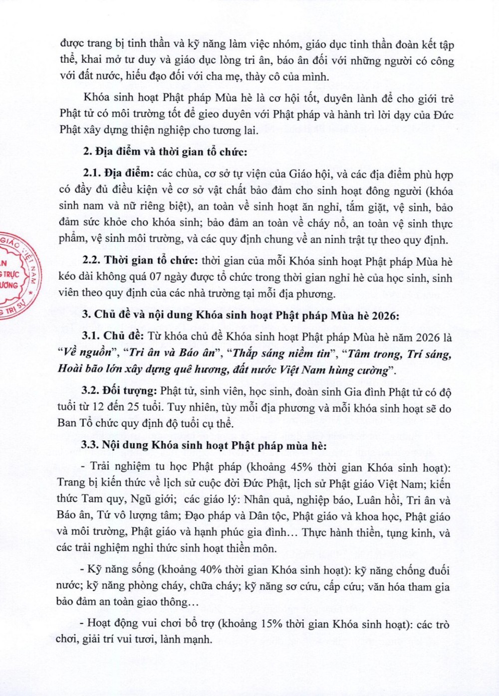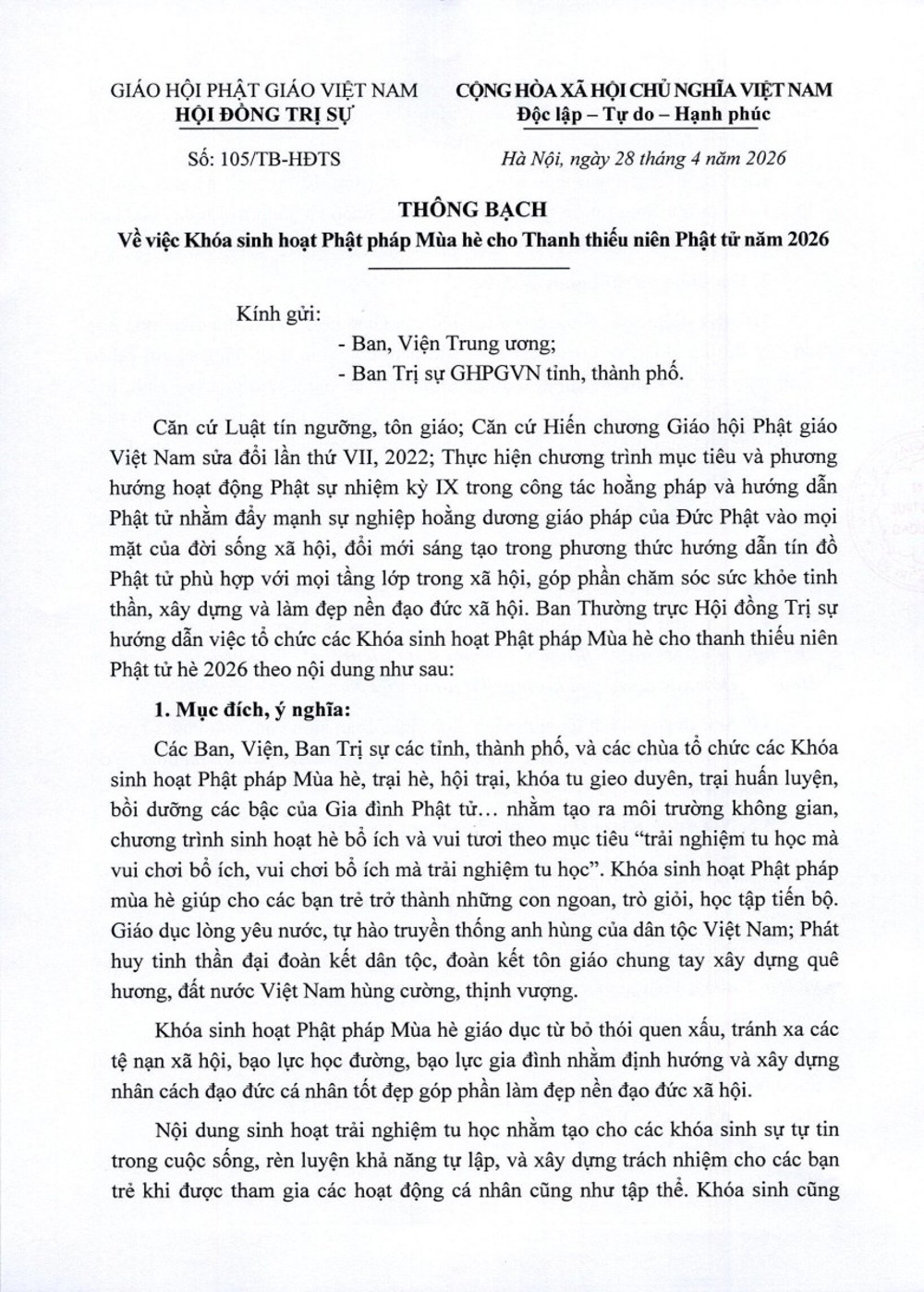 PSO - Ngày 28/4/2026, Hội đồng Trị sự GHPGVN đã ban hành Thông bạch số 105/TB-HĐTS về việc tổ chức Khóa sinh hoạt Phật pháp mùa hè dành cho thanh thiếu niên, sinh viên, học sinh trên toàn quốc.