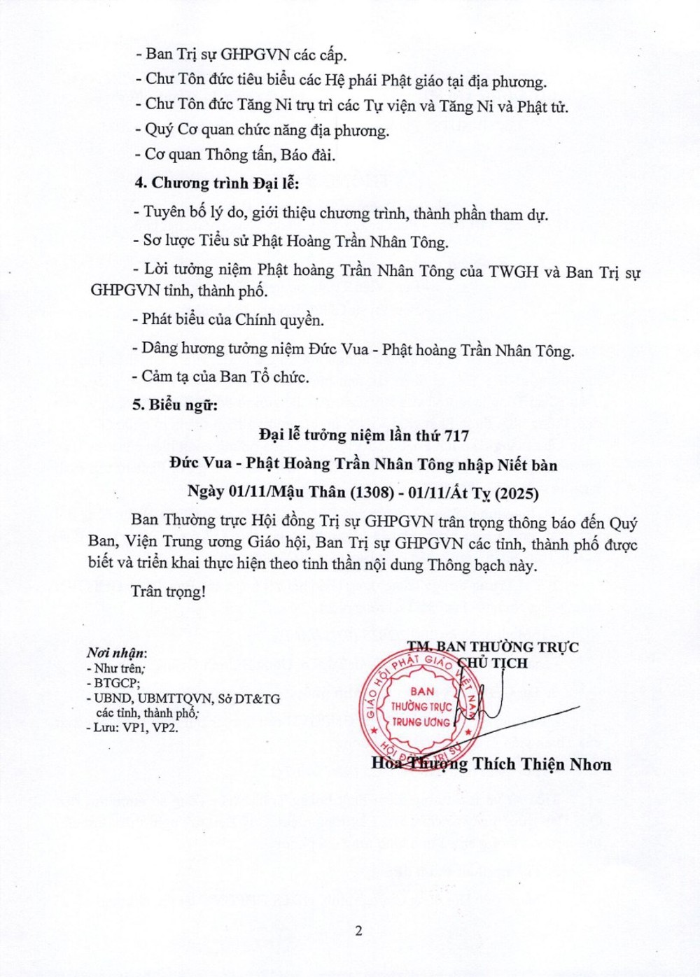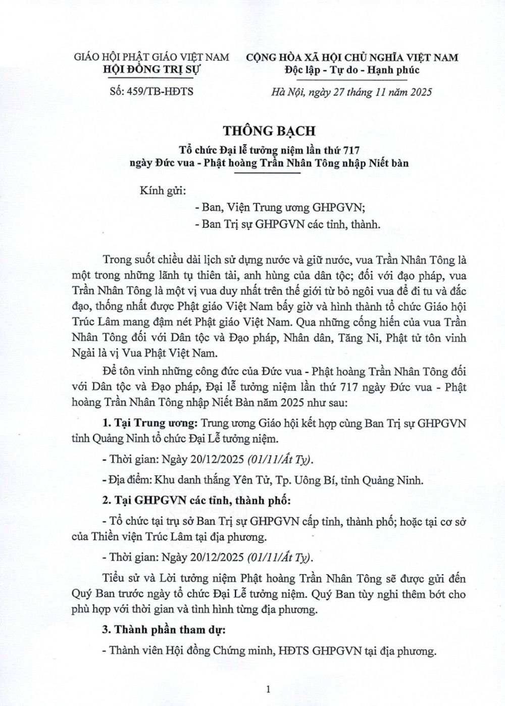 PSO - Ngày 27/11/2025, Ban Thường trực Hội đồng Trị sự GHPGVN đã ban hành Thông bạch số 459/TB-HĐTS về việc tổ chức Đại lễ tưởng niệm lần thứ 717 ngày Đức vua - Phật hoàng Trần Nhân Tông nhập Niết bàn. Thông bạch do Trưởng lão Hòa thượng Thích Thiện Nhơn - Chủ tịch Hội đồng Trị sự GHPGVN ấn ký.