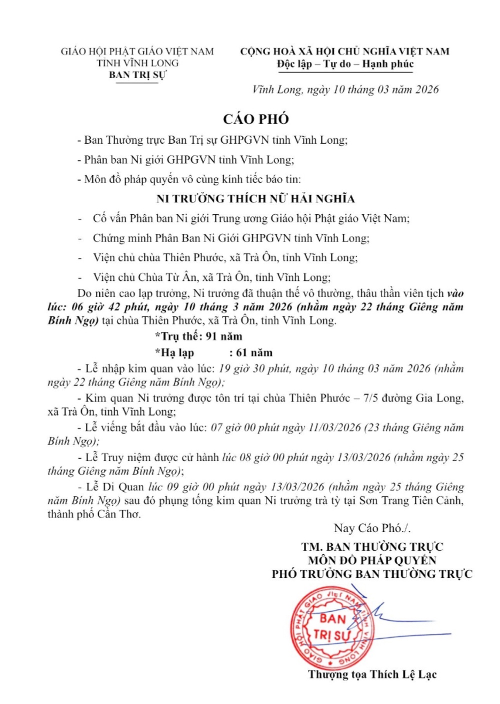 - Lễ nhập kim quan được cử hành vào lúc 19 giờ 30 ngày 10-3-2026. Kim quan Ni trưởng được tôn trí tại chùa Thiên Phước (số 7/5 đường Gia Long, xã Trà Ôn, tỉnh Vĩnh Long).