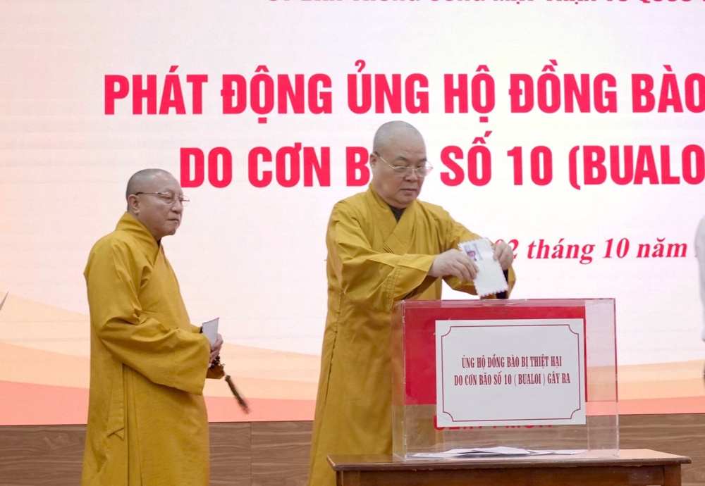 Hưởng ứng lời kêu gọi, thay mặt Giáo hội Phật giáo Việt Nam Trưởng lão Hòa thượng Thích Thanh Nhiễu trao tặng 500 triệu đồng cứu trợ khẩn cấp.
