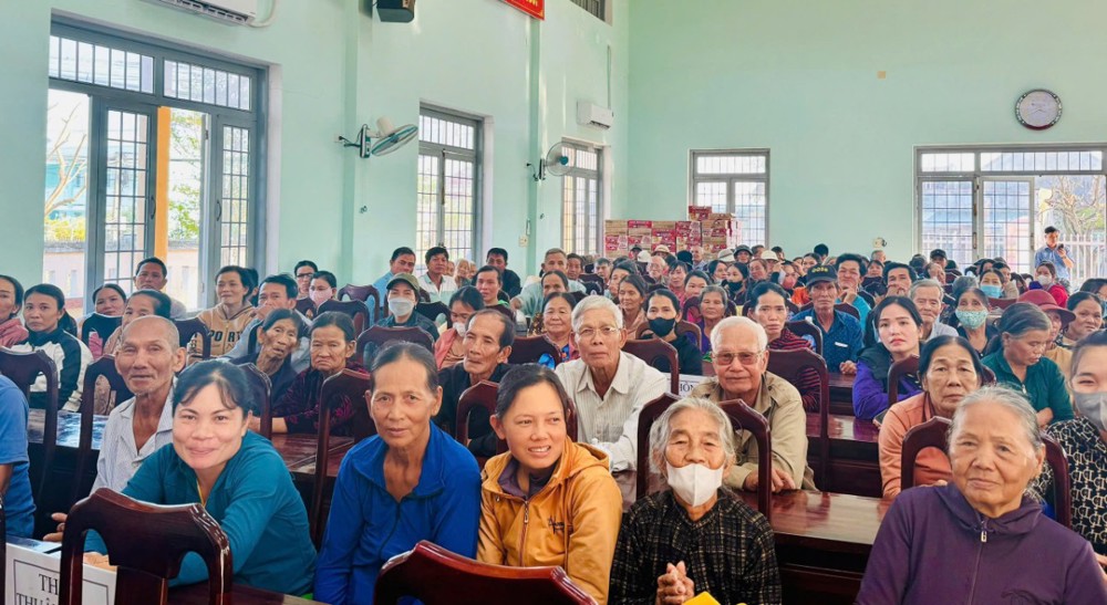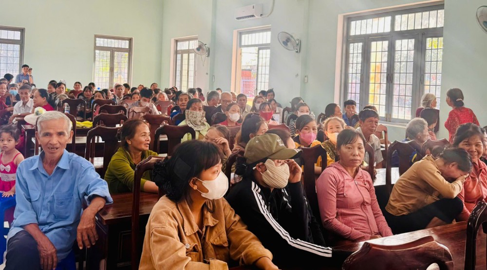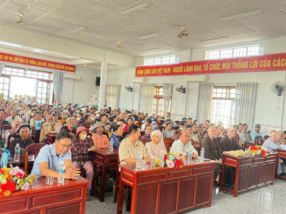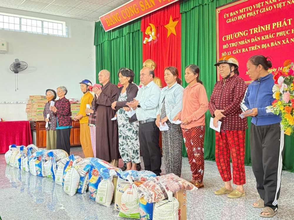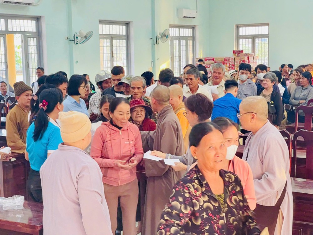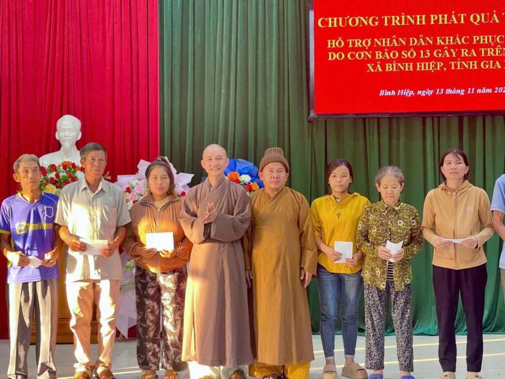 Tại UBND xã, TT. Thích Chơn Lý, NS. Thích Nữ Diệu Trí, ĐĐ. Thích Nguyên Thông, ĐĐ. Thích Trung Điền và NS. Như Hiền đã trao tặng 345 phần quà cùng một căn nhà tình thương đến các hộ gia đình đặc biệt khó khăn.
