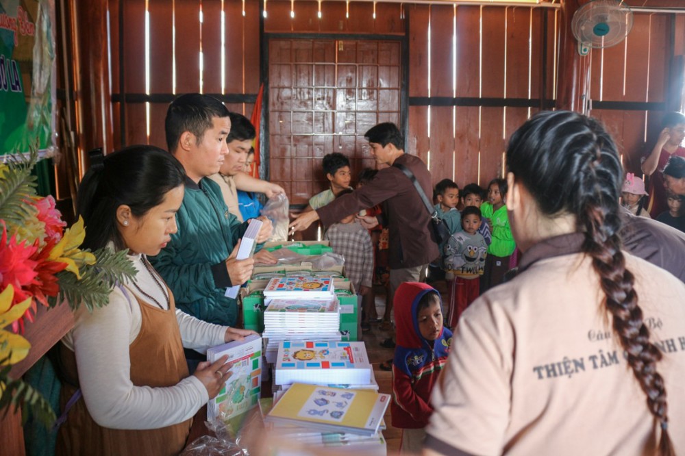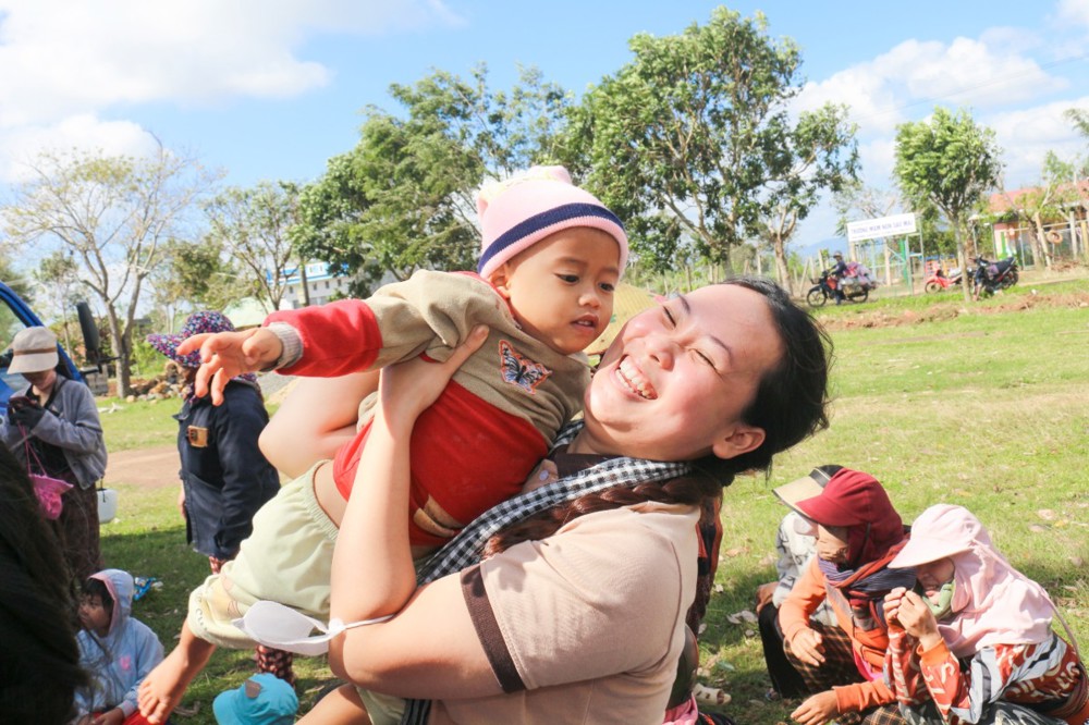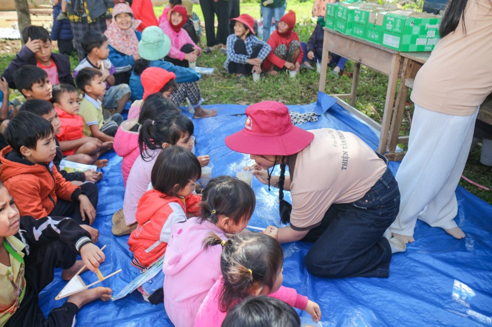 Tại các điểm làng, đoàn cũng trao tặng vở, bánh sữa cho tất cả các trẻ em. Khi nhận quà, nhiều em nhỏ tỏ ra hào hứng, thích thú, không ngừng nở nụ cười, đây là nguồn động viên thiết thực giúp các em có thêm điều kiện học tập và vui chơi.