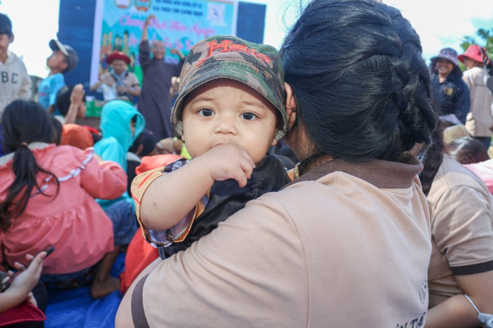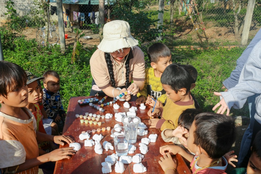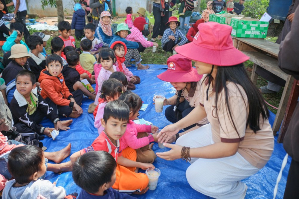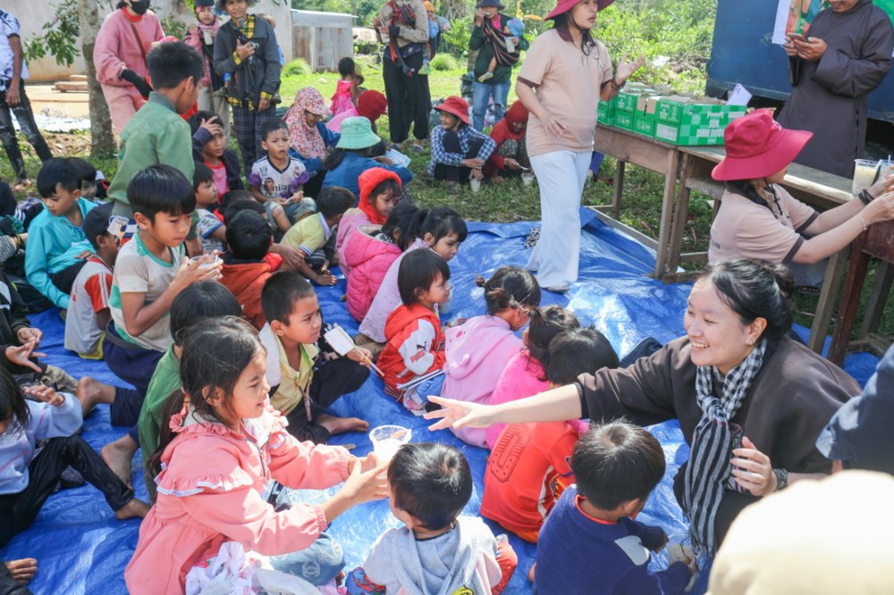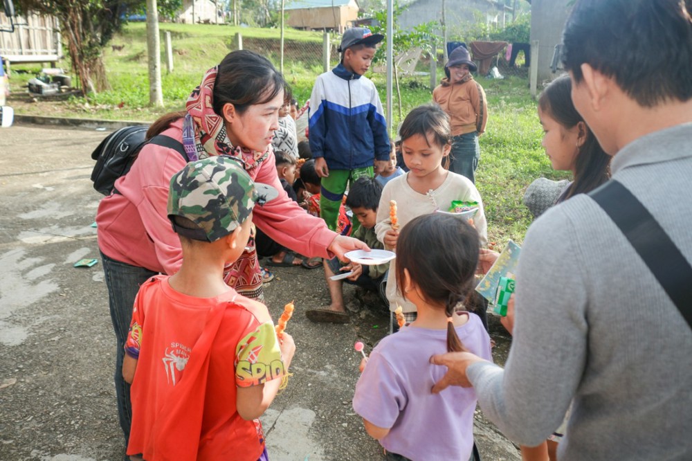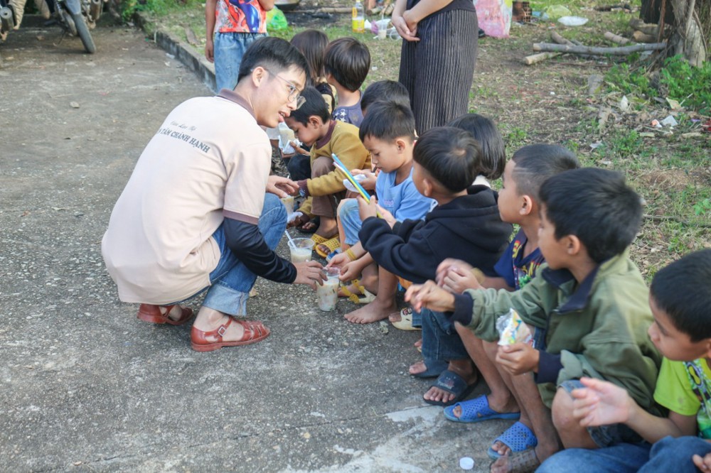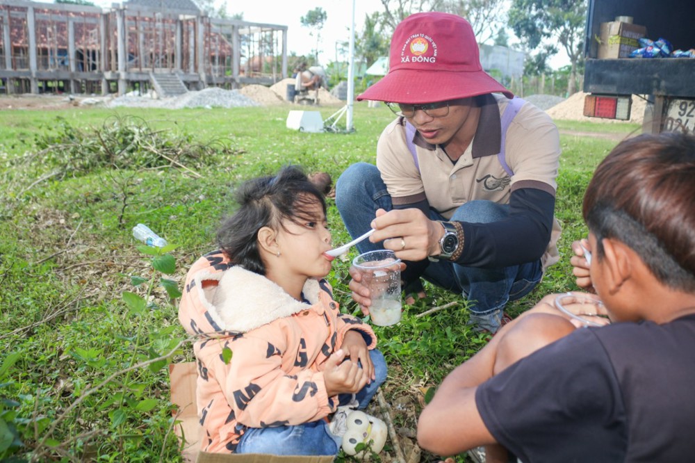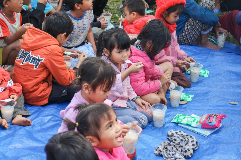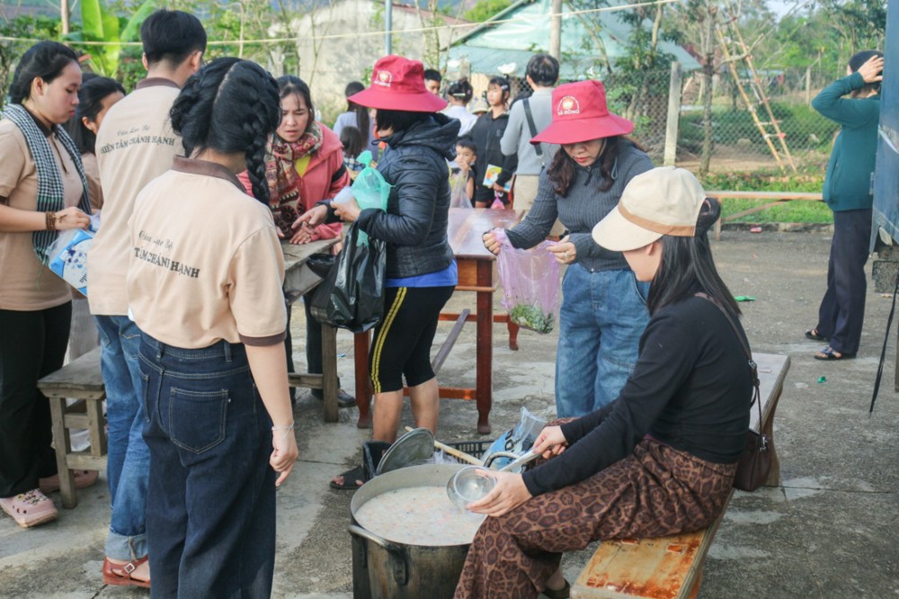 Tại mỗi điểm làng, ngay từ sáng sớm, các thành viên trong đoàn đã chuẩn bị nồi cháo dinh dưỡng lớn để phục vụ bà con. Hoạt động nấu cháo được diễn ra ngay tại nhà sinh hoạt cộng đồng với sự hỗ trợ của người dân địa phương. Hàng trăm suất cháo nóng hổi, đầy đủ dinh dưỡng đã được phát miễn phí cho người dân, đặc biệt là các em nhỏ và người già. Nhiều bà con chia sẻ rằng đây là bữa ăn ấm áp và vui tươi khi cả làng cùng quây quần bên nhau. Đoàn đã dành thời gian trò chuyện, nắm bắt đời sống của bà con, lắng nghe và chia sẻ về những khó khăn trong sinh hoạt, giáo dục và y tế.