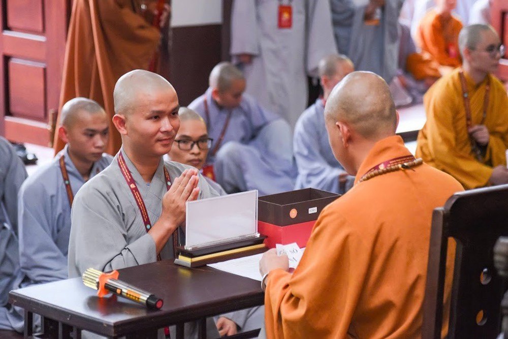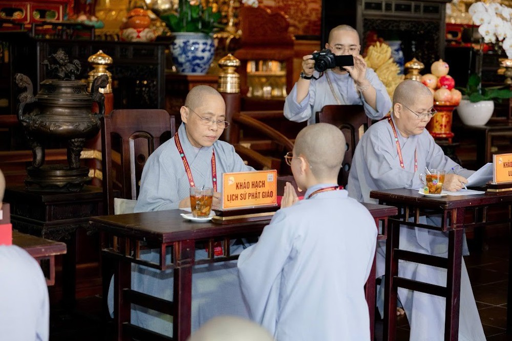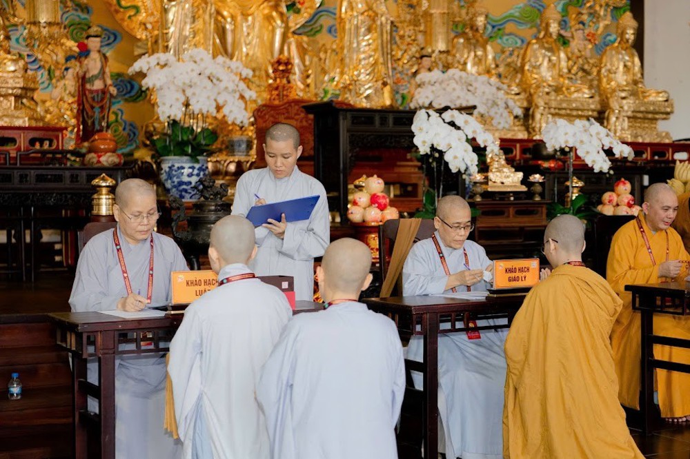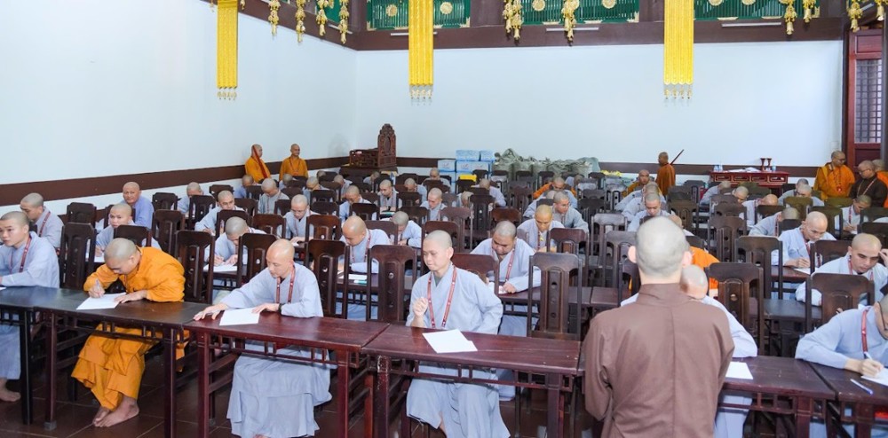 Đại đức Thích Trung Không, Phó Chủ khảo cắt đề thi và trao cho Ban Giám khảo Tăng và Ban Giám khảo Ni. Sau đó, giới tử Tăng Ni tiến hành khảo hạch.