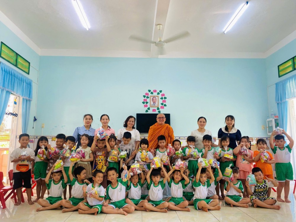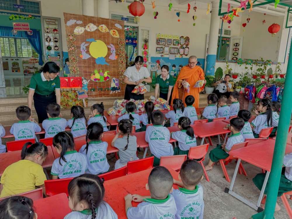 Không dừng lại tại địa phương, tịnh xá Ngọc Duyên còn mang ánh trăng từ bi đến với các em học sinh vùng khó khăn tại Trường Mầm non và Trường Tiểu học Nghĩa Hà, nơi nhiều em nhỏ còn thiếu thốn cả trong học tập lẫn đời sống hằng ngày.