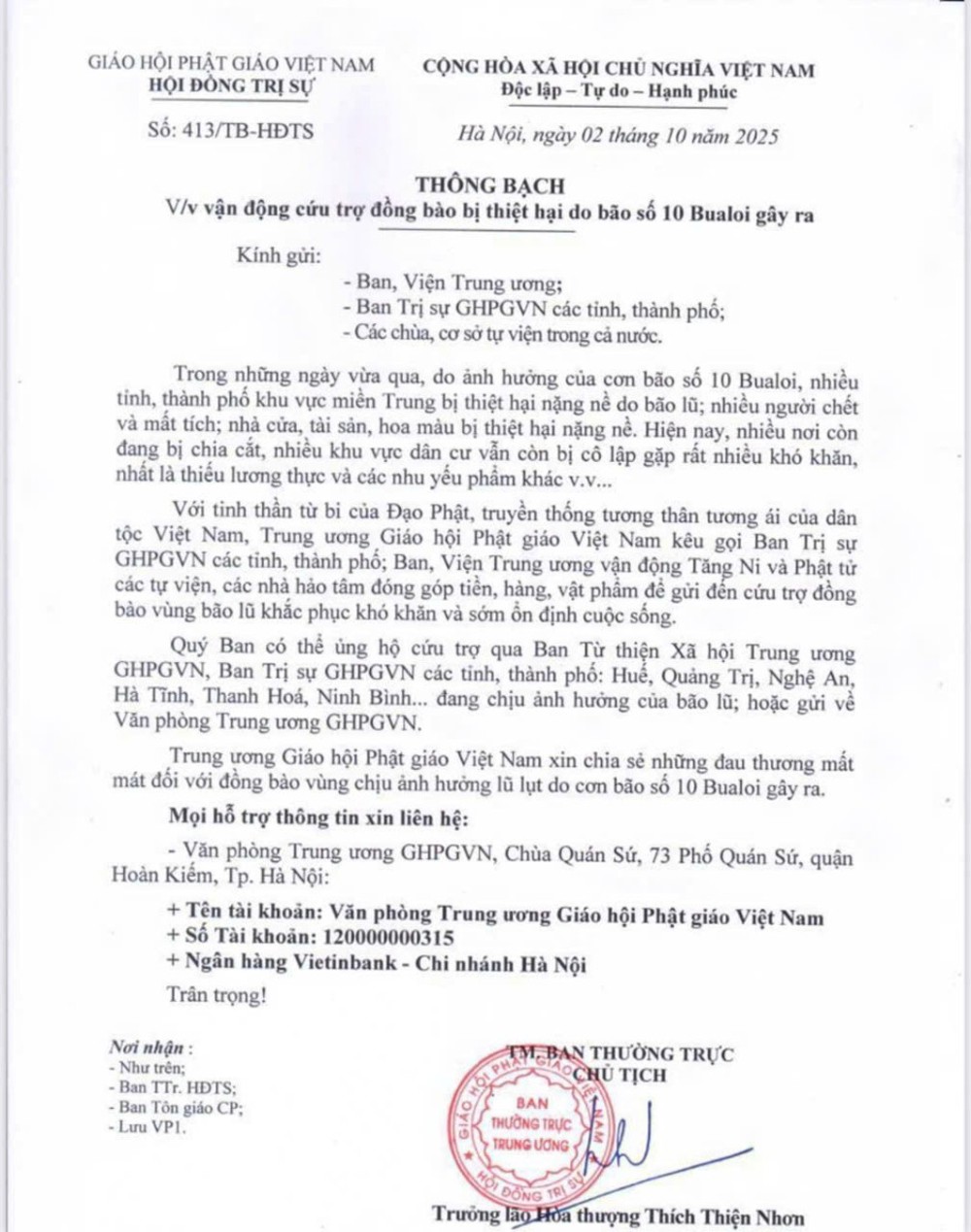 PSO - Ngày 2/10/2025, Trưởng lão Hòa thượng Thích Thiện Nhơn, Phó Pháp chủ Hội đồng Chứng minh, Chủ tịch Hội đồng Trị sự thay mặt Hội đồng Trị sự Giáo hội Phật giáo Việt Nam (GHPGVN) đã ban hành Thông bạch số 413/TB-HĐTS, kêu gọi Tăng Ni, Phật tử và các chùa, cơ sở tự viện trên cả nước chung tay cứu trợ đồng bào miền Trung bị thiệt hại nặng nề do cơn bão số 10 Bualoi gây ra.