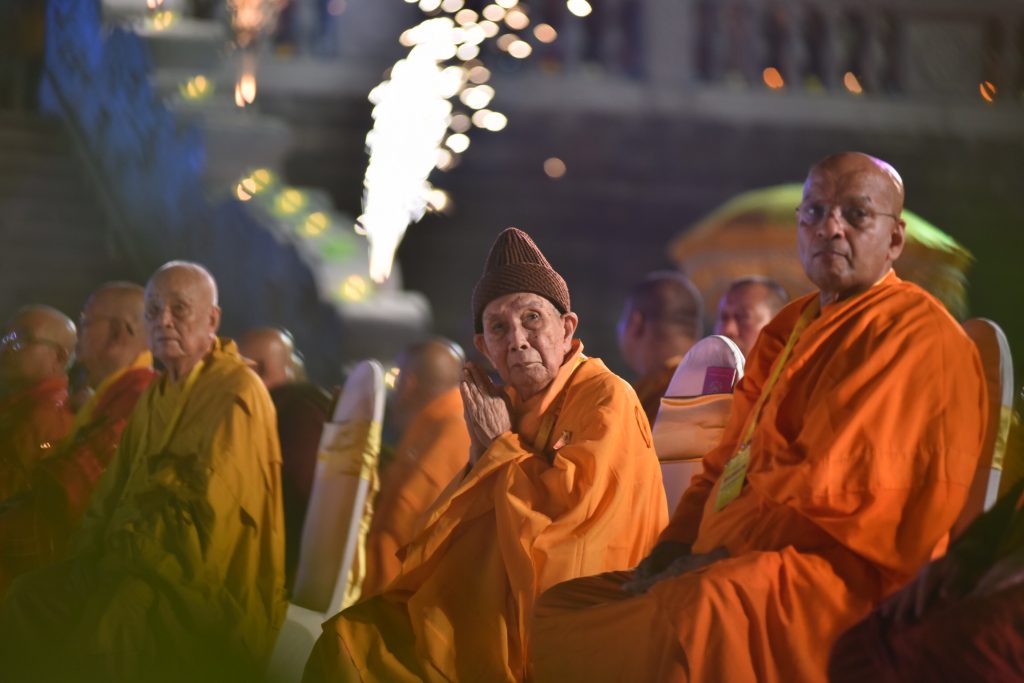 Đúng 19:30, Chư Tôn Giáo phẩm quang lâm Lễ trường, từng bước chân nhẹ nhàng thanh thoát của chư tôn đức lãnh đạo GHPGVN và các nước quang lâm, nhịp chuông trống Bát nhã trầm hùng trang nghiêm vang lên làm rung chuyển khắp đất trời và lòng người. Muôn vạn con tim đang rất đỏ và đập rất nhịp nhàng, tay chắp búp sen hướng về Lễ đài chính, hướng về mười phương chư Phật. Một sự kết nối tuyệt vời, không phân biệt tuổi tác, giai cấp, vùng miền, bởi vì tất cả đang tề tựu về đây là những người con Phật, cùng dòng máu từ bi, cùng khát khao và yêu chuộng hòa bình. Sau nghi thức niêm hương đảnh lễ, xưng tán chư Phật, từng ngọn nến được thắp lên, lung linh, rực rỡ. Ánh sáng dần lan tỏa như một sự chuyển động nhiệm mầu của nội tâm. Ánh sáng bừng lên thiêu rụi mọi lo lắng, nghi ngờ, sợ sệt, những trái tim của sự tỉnh thức và hiểu biết.