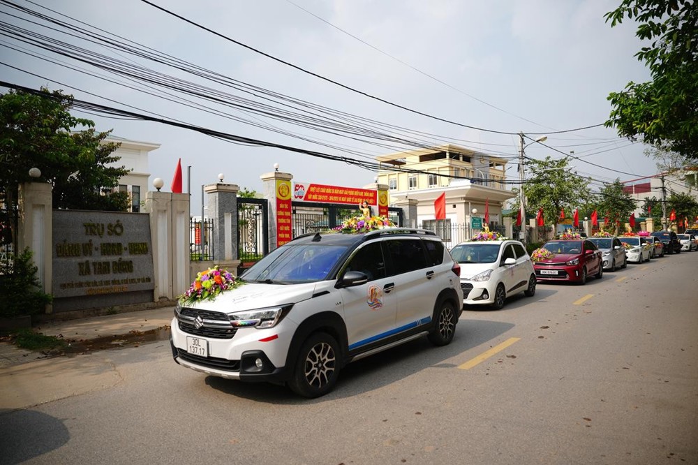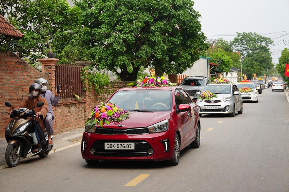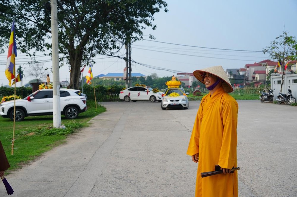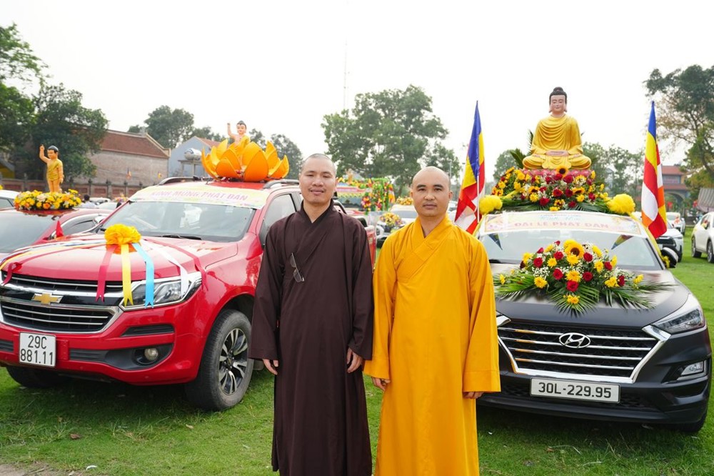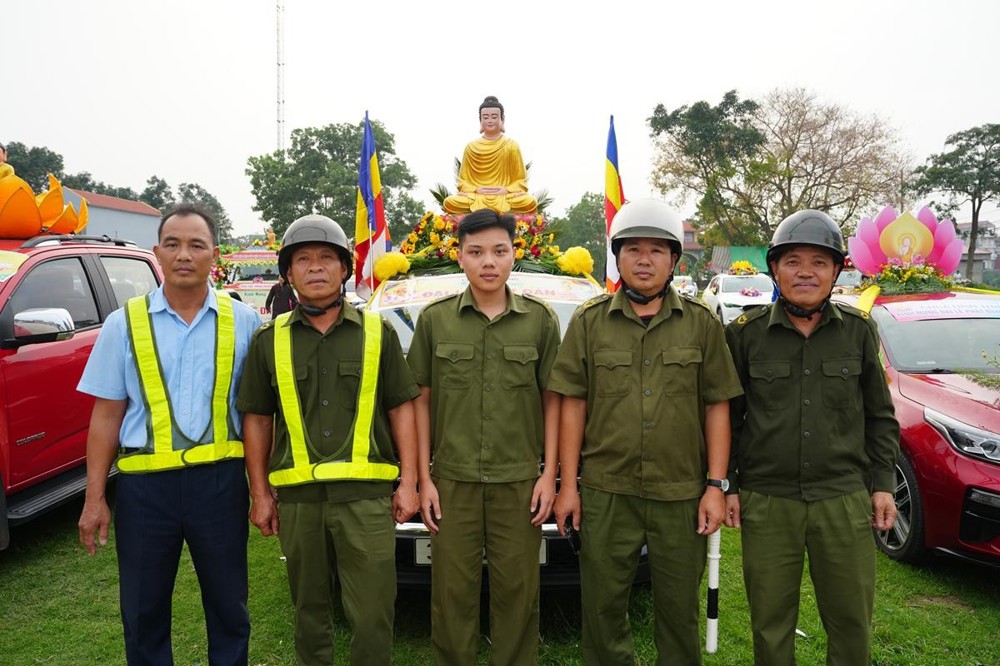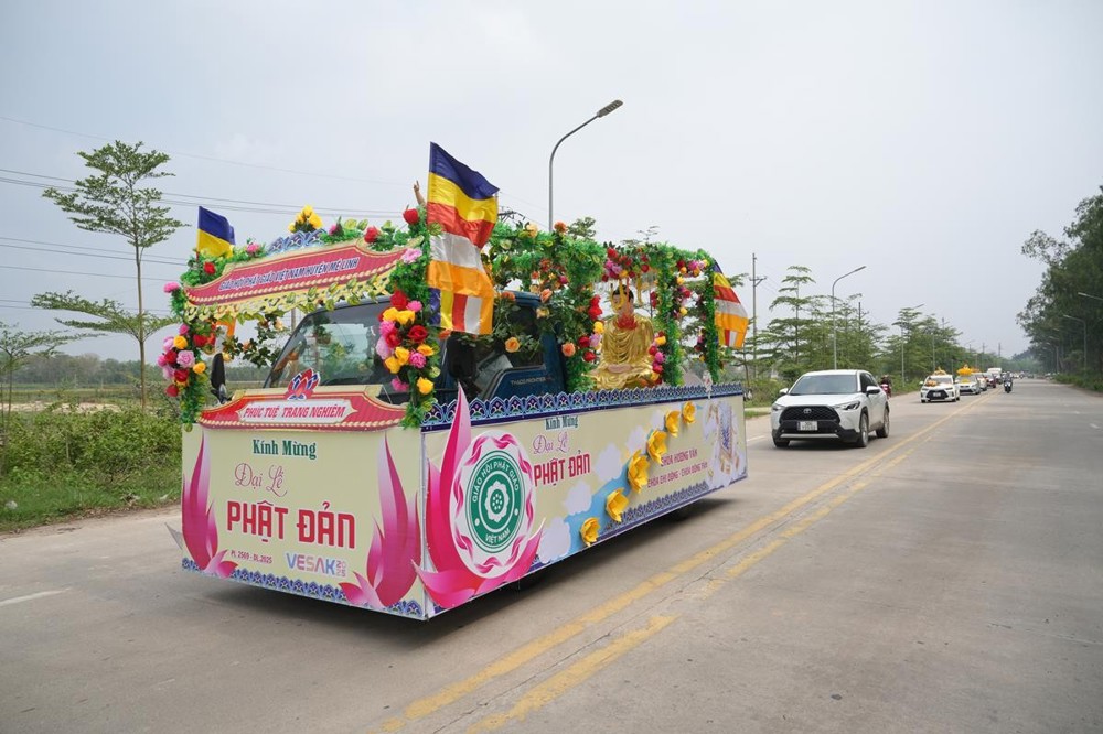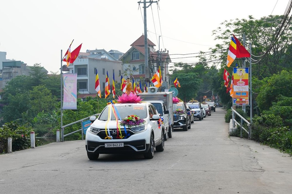 Dưới sự trợ giúp nhiệt tình của các chiến sĩ công an, hàng trăm chiếc xe hoa được trang trí rực rỡ, mang tôn tượng kim thân của Đức Phật sơ sinh, kết hợp cùng cờ, hoa tươi thắm và những băng rôn, biểu ngữ "Kính mừng Phật đản", nối tiếp nhau diễu hành từ trục đường chính đến những con đường quê thanh bình, thơm ngát mùi lúa mới.